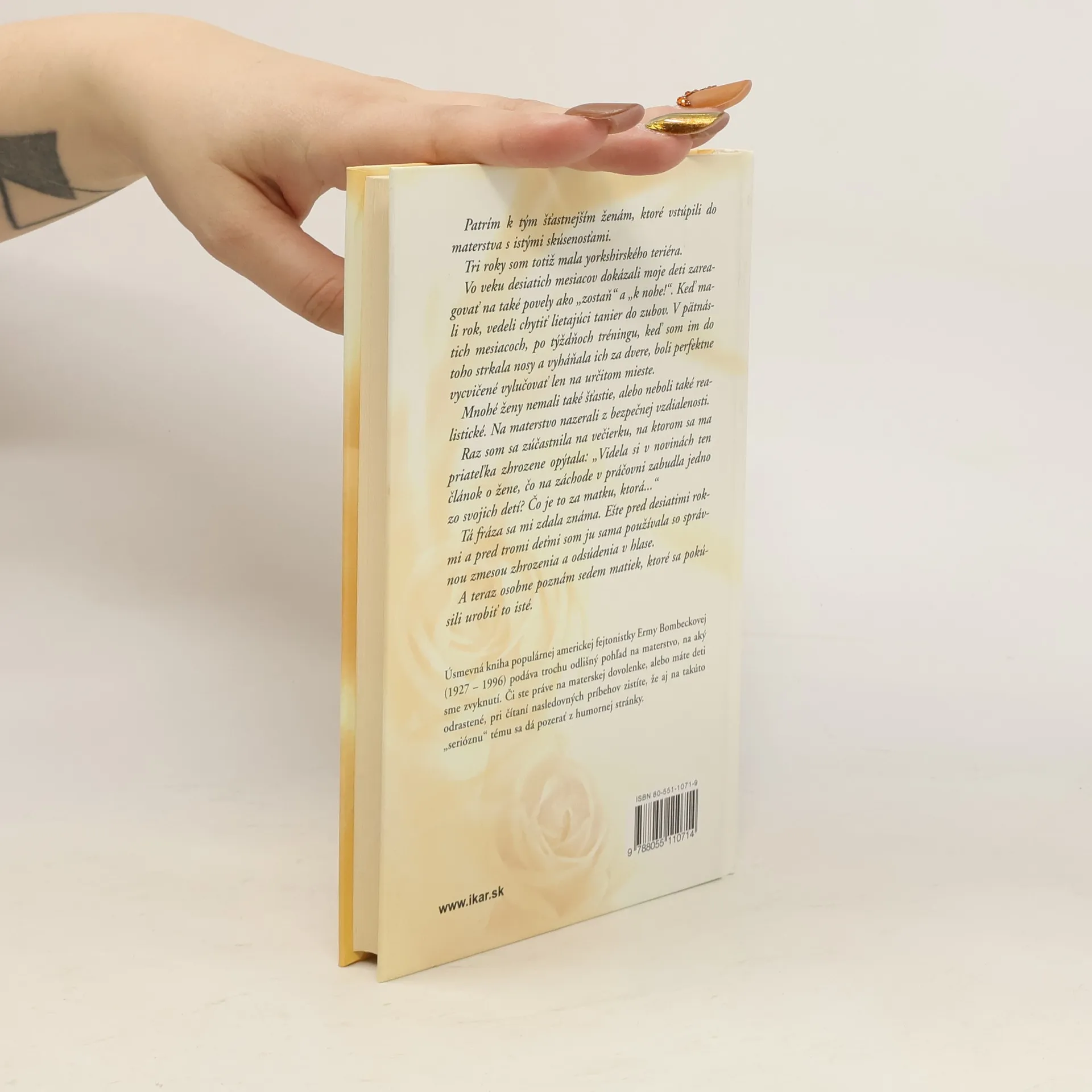Úsmevná kniha populárnej americkej fejtonistky Ermy Bombeckovej (1927 – 1996) podáva trochu odlišný pohľad na materstvo, než na aký sme zvyknutí.