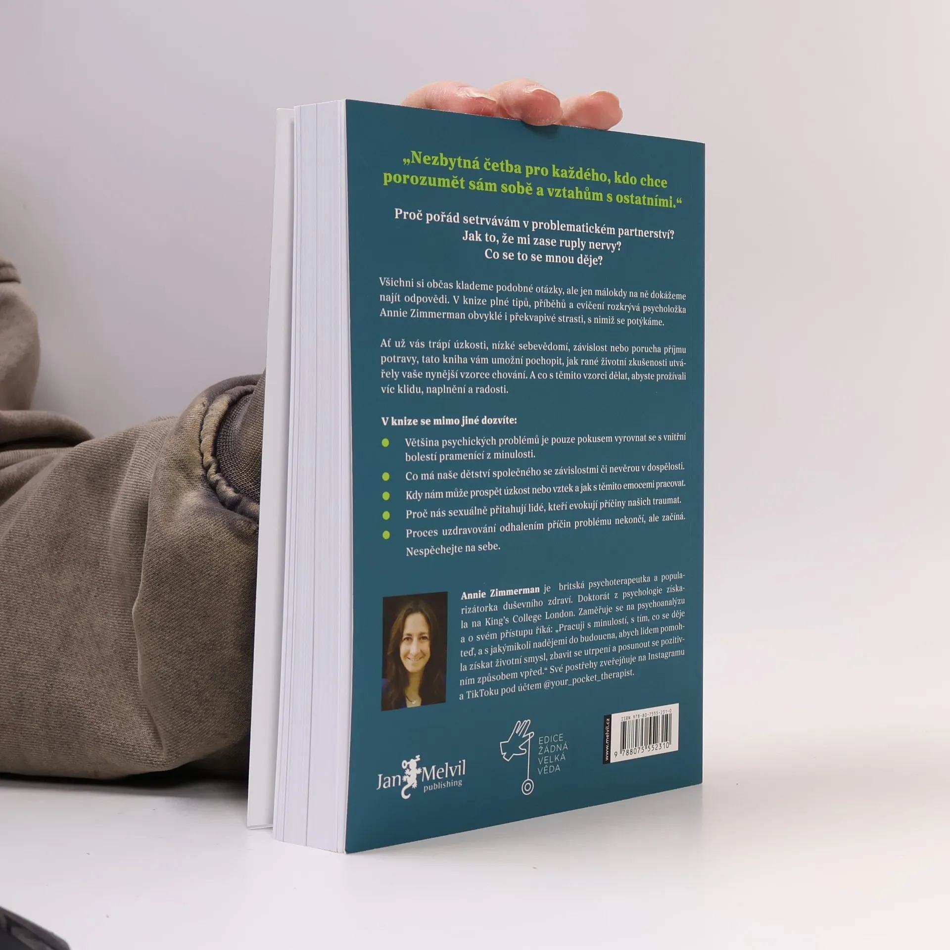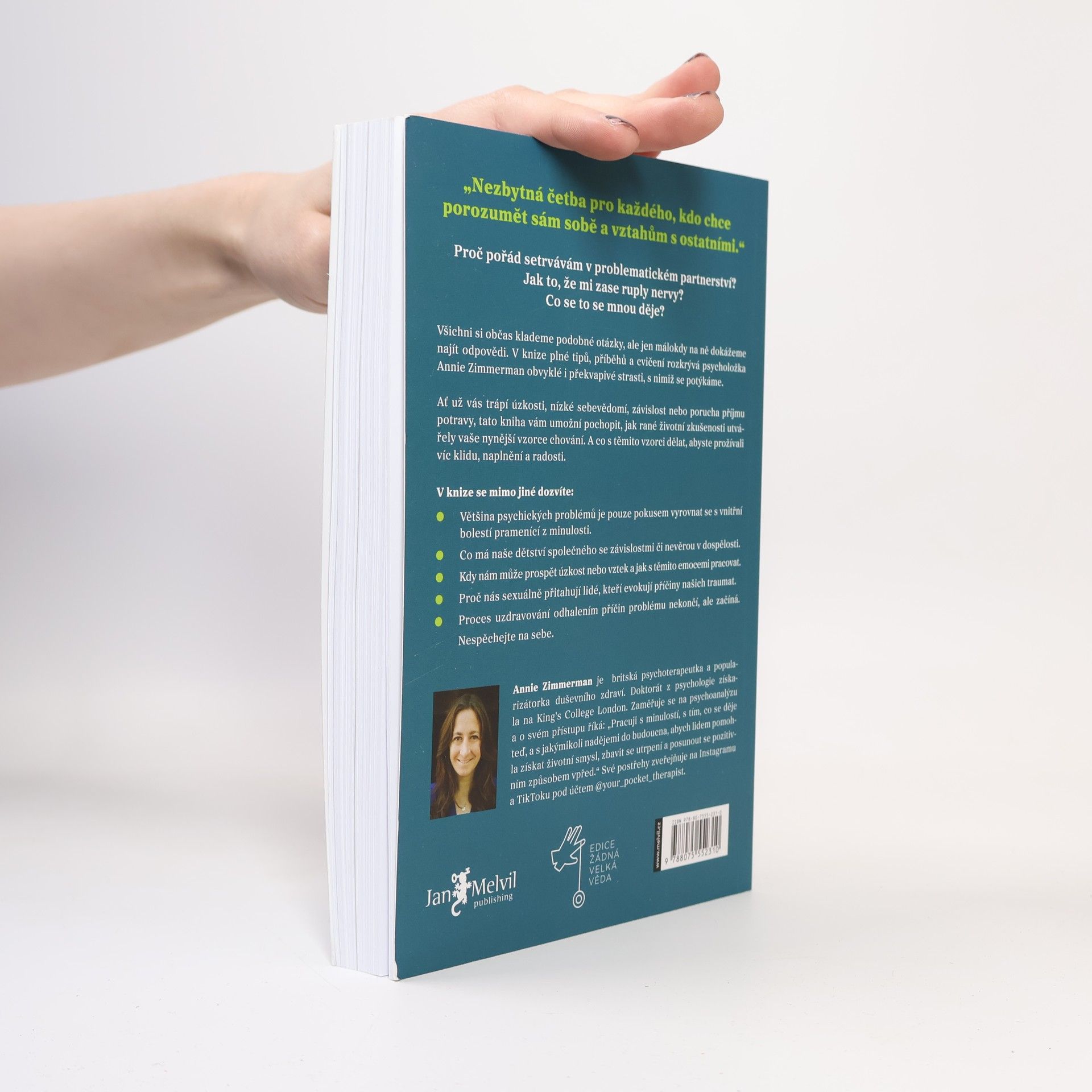 Nezbytná četba pro každého, kdo chce porozumět sám sobě a vztahům s ostatními. Proč setrvávám v problematickém partnerství? Jak to, že mi zase ruply nervy? Co se to se mnou děje? Všichni si občas klademe podobné otázky, ale jen málokdy na ně dokážeme najít odpovědi. V knize plnétipů, příběhů a cvičení rozkrývá psycholožka Annie Zimmerman obvyklé i překvapivé strasti, s nimiž se potýkáme. Ať už vás trápí úzkosti, nízké sebevědomí, závislost a nebo porucha příjmu potravy, tato kniha vám umožní pochopit, jak rané životní zkušenosti utvářely vaše nynější vzorce chování. A co s těmito vzorci dělat, abyste prožívali víc klidu, naplnění a radosti. V knize se mimo jiné dozvíte - Většina psychických problémů je pouze pokusem vyrovnat se s vnitřní bolestí pramenící z minulosti. - Co má naše dětství společného se závislostmi či nevěrou v dospělosti. - Kdy nám může prospět úzkost nebo vztek a jak s těmito emocemi pracovat. - Proč nás sexuálně přitahují lidé, kteří evokují příčiny našich traumat. - Proces uzdravování odhalením příčin problému nekončí, ale začíná. Nespěchejte na sebe.
