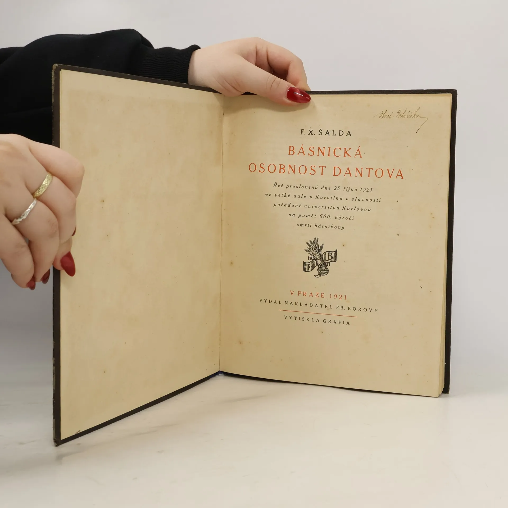 Básnická osobnost Dantova : řeč proslovená dne 25. října 1921 ve velké aule v Karolinu o slavnosti pořádané Universitou Karlovou na paměť 600. výročí smrti básníkovy, František Xaver Šalda