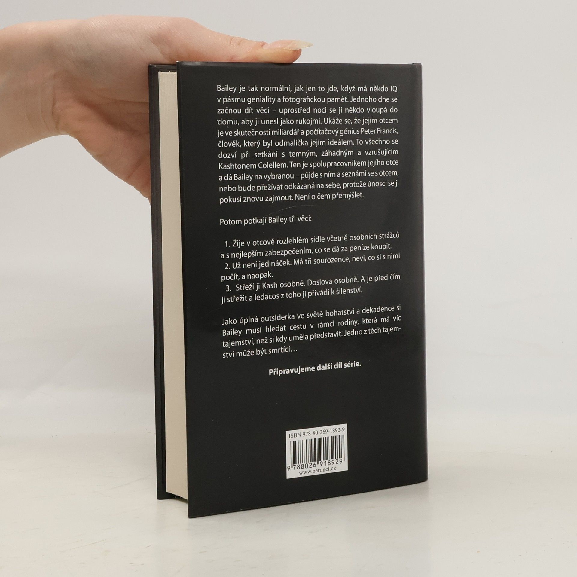 Zasvěcení jsou prvním dílem zbrusu nové, poutavé romantické trilogie autorky bestsellerů Tijan! Bailey je tak normální, jak jen to jde, když má někdo IQ v pásmu geniality a fotografickou paměť. Pak se začnou dít věci – uprostřed noci se jí někdo vloupá do domu, aby ji unesl jako rukojmí. Ukáže se, že jejím otcem je ve skutečnosti miliardář a počítačový génius Peter Francis, člověk, který byl odmalička jejím ideálem. To všechno se dozví při setkání s temným, záhadným a vzrušujícím Kashtonem Colellem. Ten je spolupracovníkem jejího otce a dá Bailey na vybranou – půjde s ním a seznámí se s otcem, nebo bude přežívat odkázaná na sebe, protože únosci se ji pokusí znovu zajmout. Není o čem přemýšlet. Potom potkají Bailey tři věci: 1. Žije v otcově rozlehlém sídle včetně osobních strážců a nejlepším zabezpečením, co se dá za peníze koupit. 2. Už není jedináček. Má tři sourozence, neví, co si s nimi počít, a naopak. 3. Střeží ji Kash osobně. Doslova osobně. A je před čím ji střežit, a ledacos z toho ji přivádí k šílenství. Jako úplná outsiderka ve světě bohatství a dekadence si Bailey musí hledat cestu v rámci rodiny, která má víc tajemství, než si kdy uměla představit. Jedno z těch tajemství může být smrtící…
