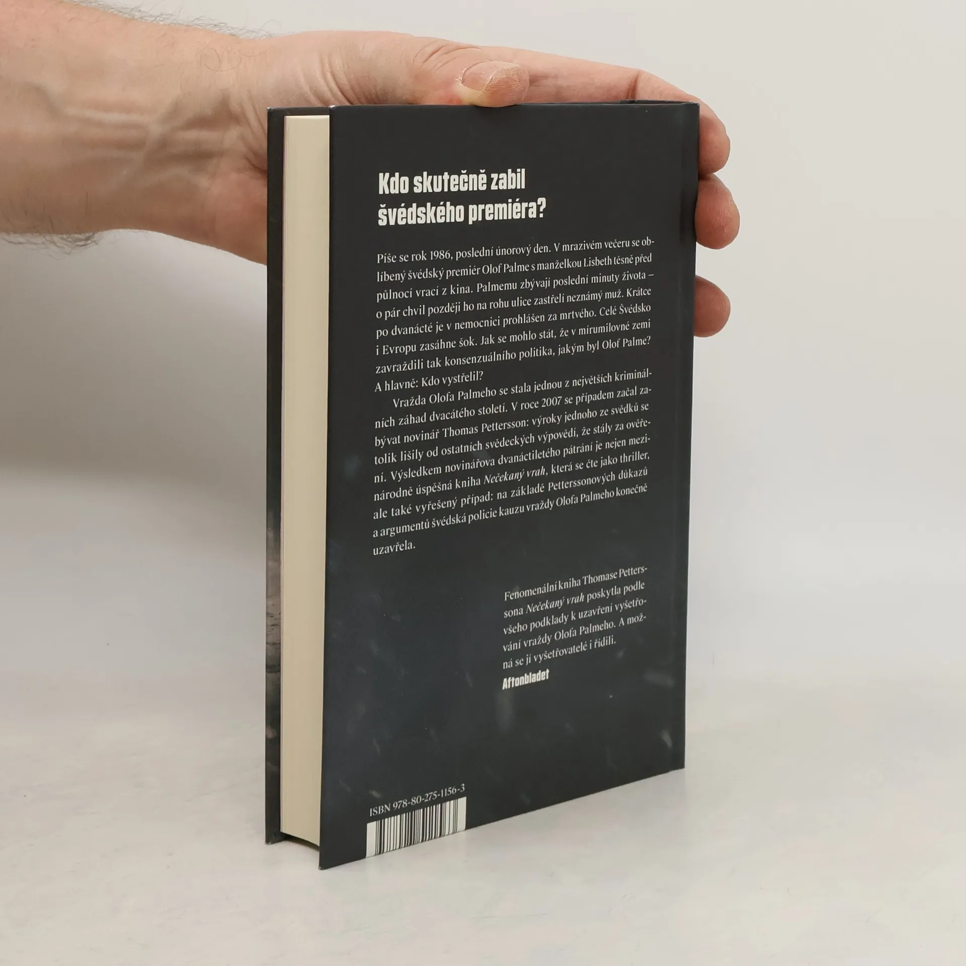 Kdo skutečně zabil švédského premiéra? Píše se rok 1986, je těsně před půlnocí. V mrazivém únorovém večeru se oblíbený švédský premiér Olof Palme s manželkou Lisbeth vracejí z kina. Palmemu zbývají poslední minuty života — o pár chvil později ho v boční uličce zastřelí neznámý muž. Krátce po dvanácté je v nemocnici prohlášen za mrtvého. Celé Švédsko i Evropu zasáhne šok. Jak se mohlo stát, že v tak mírumilovné zemi zavraždili tak populárního a konsenzuálního politika, jako byl Olof Palme? A hlavně: Kdo vystřelil? Vražda Olofa Palmeho se stala jednou z největších kriminálních záhad dvacátého století. V roce 2007 se případem začal zabývat novinář Thomas Pettersson: prohlášení jednoho ze svědků se tolik vymykalo všem ostatním, že stálo za ověření. A výsledkem Petterssonova dvanáctiletého pátrání je nejen mezinárodně úspěšná kniha Nečekaný vrah, která se čte jako thriller, ale také vyřešený případ: na základě jeho důkazů a argumentů švédská policie kauzu vraždy Olofa Palmeho uzavřela.