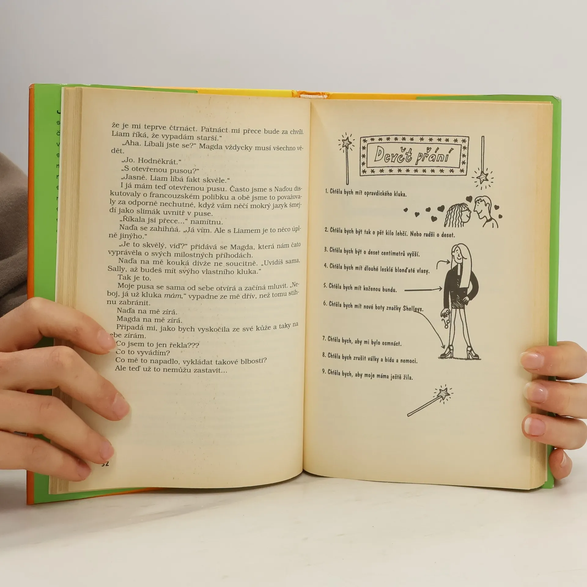 Devět důvodů, proč si přečíst tuhle knížku: 1. Je o třech holkách, které chodí do devítky. 2. Můžete se dozvědět spoustu mých tajemství. (Já se jmenuju Sally.) 3. Totéž platí o mé nejlepší kamarádce Nadě. 4. Totéž platí o mé stejně nejlepší kamarádce Magdě. 5. Můžete se přesvědčit, jestli se vašich devět nejoblíbenějších hrdinů shoduje s mými. 6. Můžete se propadat hanbou nad mými nejtrapnějšími zážitky. 7. Můžete zažít spoustu legrace. (Smát se budete hlavně mně.) 8. Možná si taky trochu popláčete. 9. A NAVÍC se ještě dozvíte spoustu věcí O KLUKÁCH!
