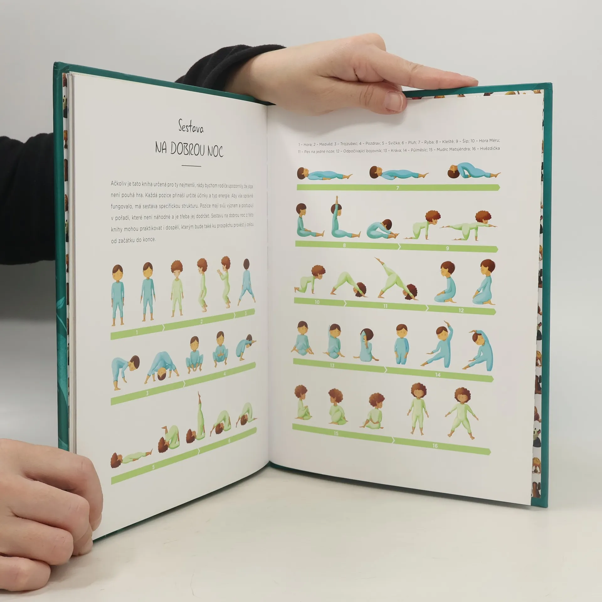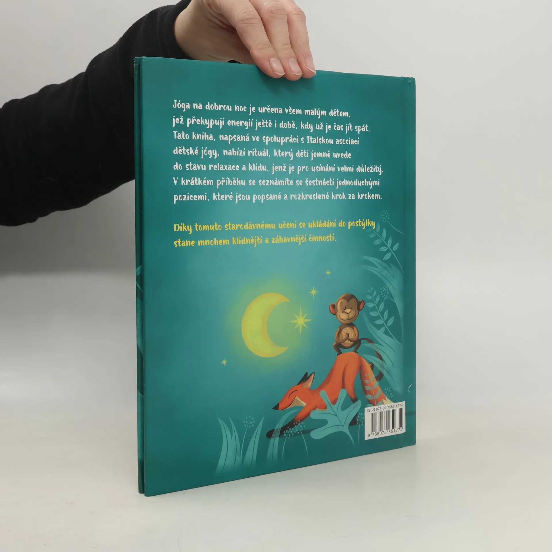 Uvolňující pozice pro děti před spaním. Jóga na dobrou noc je určena všem malým dětem, jež překypují energií ještě i době, kdy už je čas jít spát. Tato kniha, napsaná ve spolupráci s Italskou asociací dětské jógy, nabízí rituál, který děti jemně uvede do stavu relaxace a klidu, jenž je pro usínání velmi důležitý. V krátkém příběhu se představí šestnáct jednoduchých pozic, vysvětlených a rozkreslených krok za krokem. Díky tomuto starodávnému učení se ukládání do postýlky stane mnohem klidnější a zábavnější záležitostí.