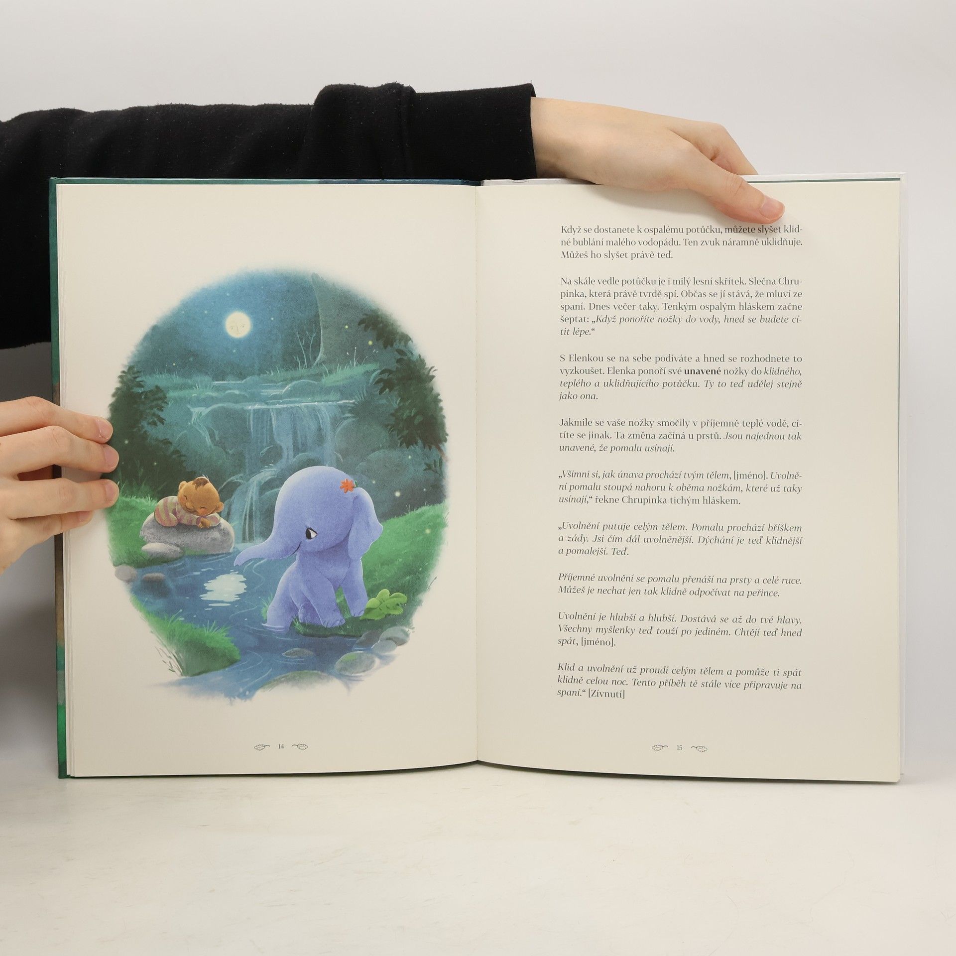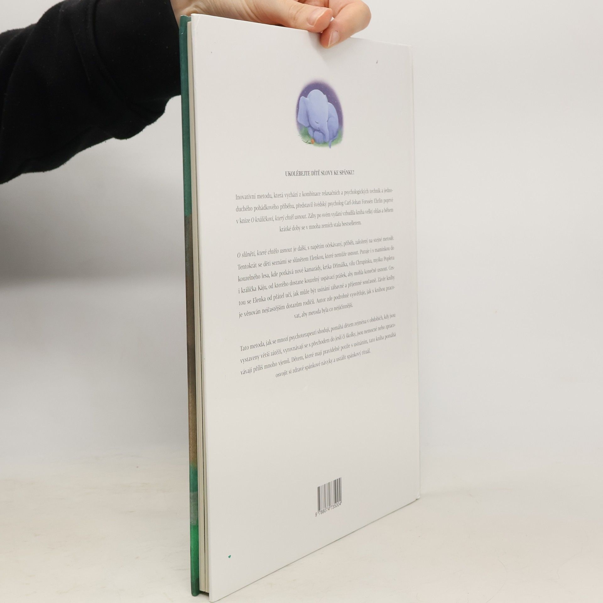 Ukolébejte dítě slovy ke spánku! Inovativní metodu, která vychází z kombinace relaxačních a psychologických technik a jednoduchého pohádkového příběhu, představil švédský psycholog Carl-Johan Forssén Ehrlin poprvé v knize O králíčkovi, který chtěl usnout. Tato kniha již krátce po svém vydání vzbudila velký ohlas a v mnoha zemích se během krátké doby stala bestsellerem. O slůněti, které chtělo usnout je další, s napětím očekávaný příběh, založený na stejné metodě, která děti dokáže zklidnit a uvolnit tak, aby se jim lépe usínalo. Tentokrát se děti seznámí se slůnětem Elenkou, které nemůže usnout. Putuje i s maminkou do kouzelného lesa, kde potkává nové kamarády, krtka Dřímálka, vílu Chrupinku, myšku Popletu i králíčka Káju, od kterého dostane kouzelný uspávací prášek, aby mohla konečně usnout. Cestou se Elenka od přátel učí, jak usínání může být zábavné a příjemné současně. Část knihy je věnována také nejčastějším dotazům rodičů. V této části autor vysvětluje, jak s knihou pracovat, aby metoda byla co nejúčinnější. Tato metoda, jak se mnozí psychoterapeuti shodují, pomáhá dětem zejména v obdobích, kdy jsou vystaveny větší zátěži, vyrovnávají se přechodem do jeslí či školky, jsou nemocné nebo zpracovávají příliš mnoho vjemů. Dětem, které mají pravidelně potíže s usínáním, tato kniha pomáhá osvojit si zdravé spánkové návyky a ustálit spánkový rituál.