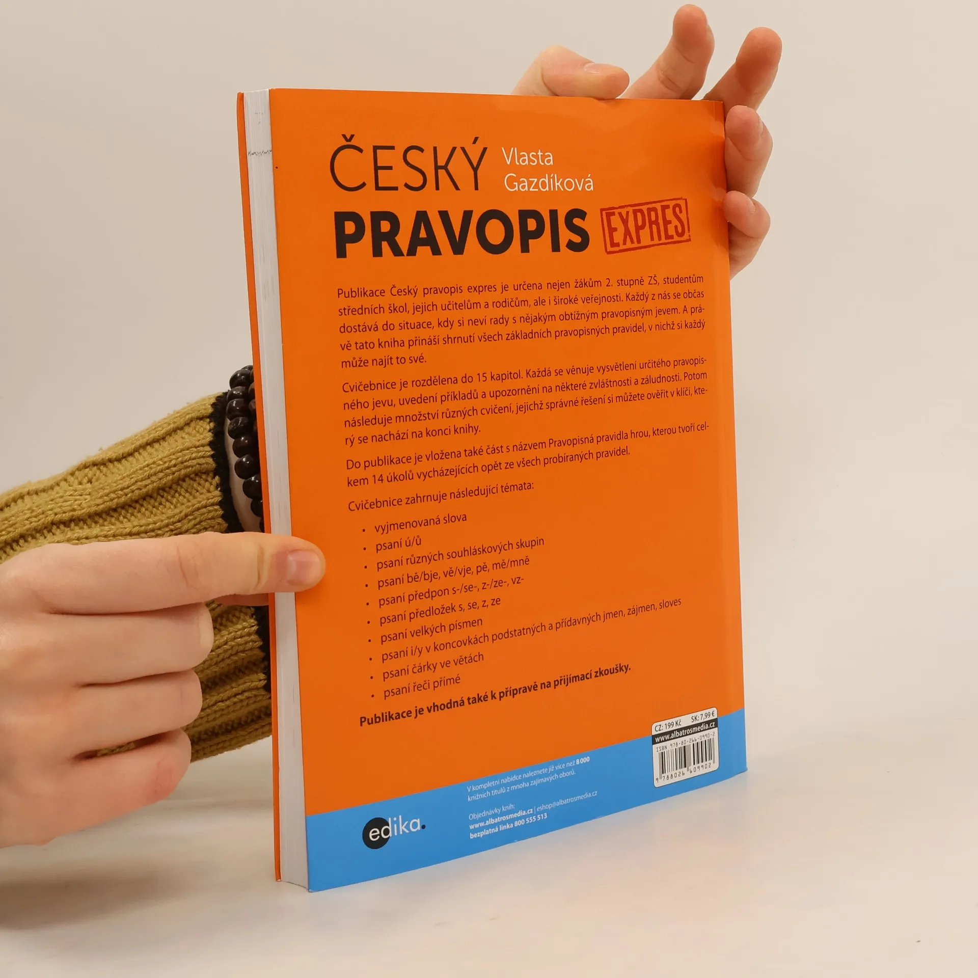 Jak si zlepšit pravopis. Kniha přináší shrnutí základních pravopisných pravidel, což ocení nejen žáci 2. stupně ZŠ připravující se na přijímací zkoušky, ale také středoškolští studenti, jejich učitelé, rodiče a celá široká veřejnost. Každý z nás při psaní občas zaváhá a neví si rady s některým obtížnějším pravopisným jevem. Každá z 15 kapitol se věnuje vysvětlení určitého pravopisného jevu, přináší příklady a upozornění na jazykové zvláštnosti. Dále následuje řada cvičení, jejichž správné řešení si můžete ověřit v klíči.