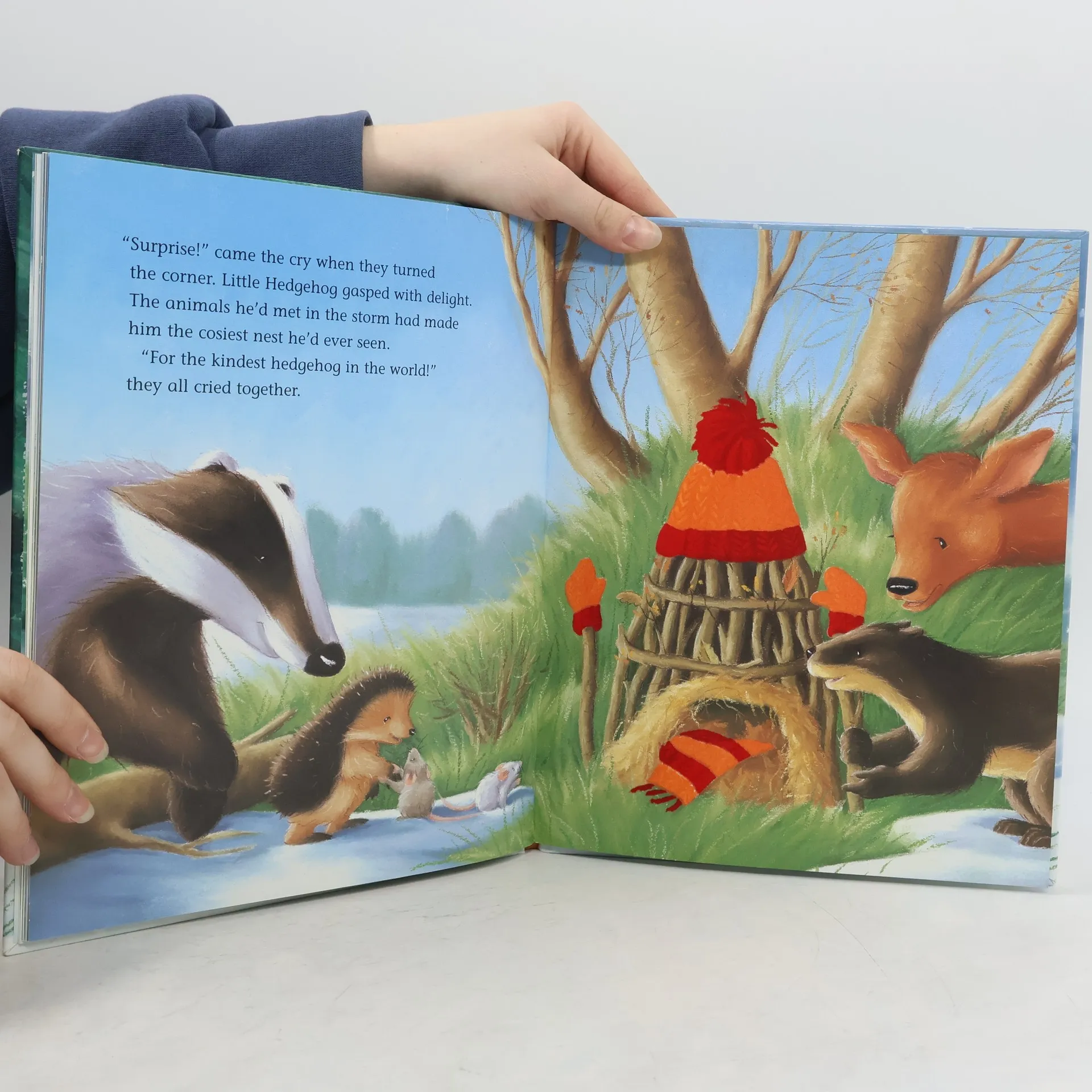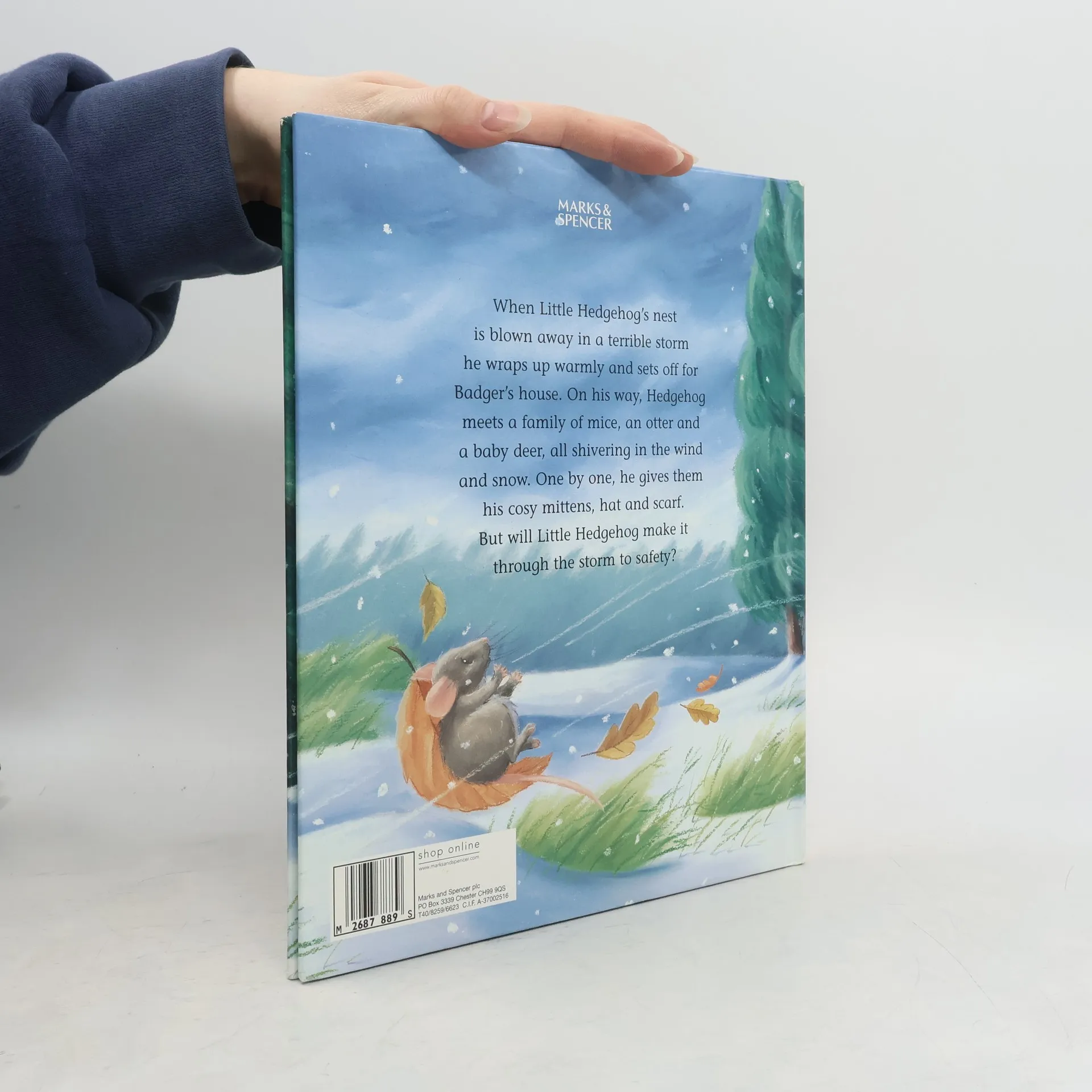 When Little Hedgehog's nest is blown away in a terrible storm he wraps up warmly & sets off for Badger's house. On his way Hedgehog meets lots of animals shivering in the wind & snow. One by one, he gives them his cosy mittens, hat & scarf. But will Little Hedgehog make it through the storm to safety?