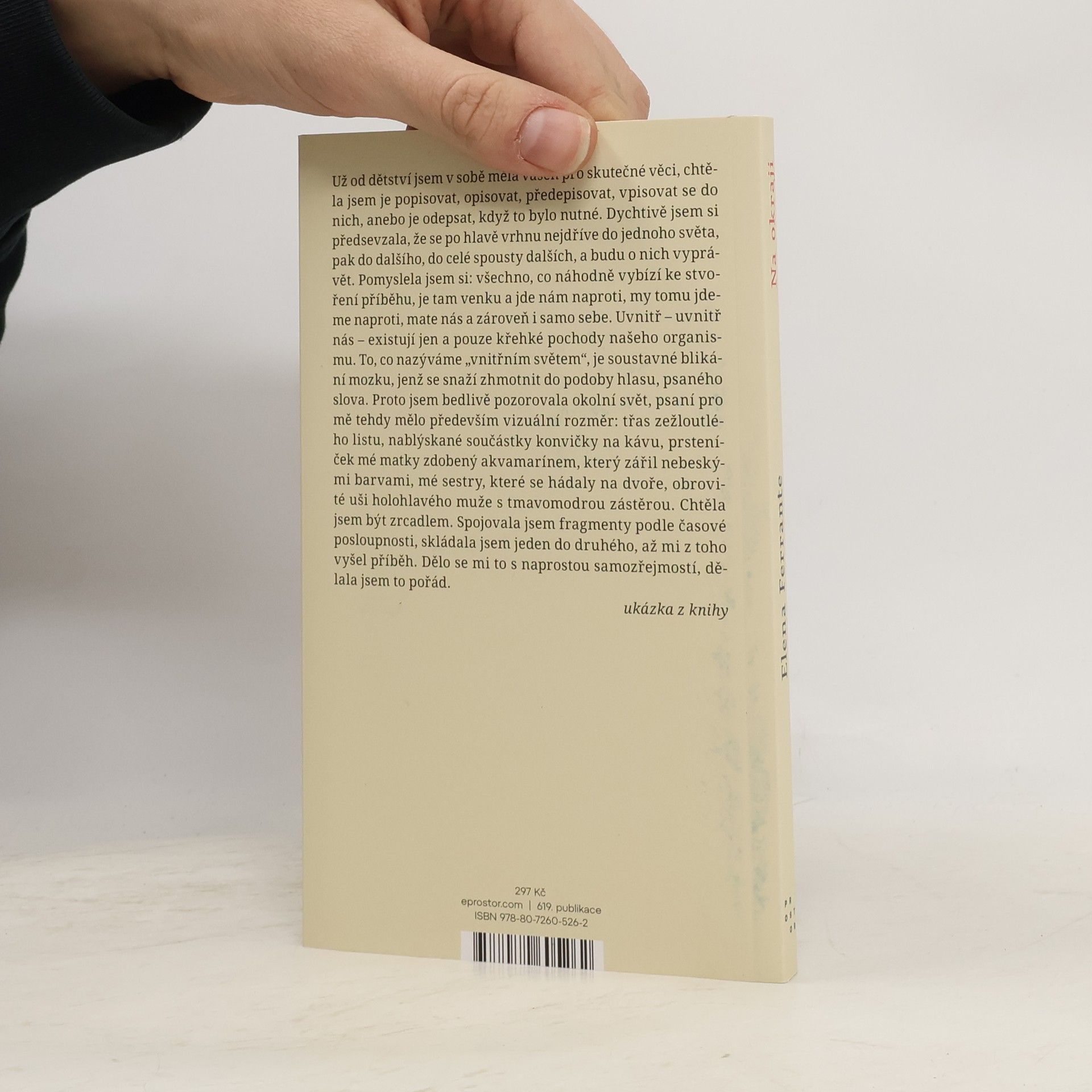 Už třicet let čtenáře vzrušují romány tajuplné autorky píšící pod pseudonymem Elena Ferrante. Žádné iluze, jen syrová realita a pochybnosti, to jsou konstanty její tvorby od prvotiny Tíživá láska až po ságu Geniální přítelkyně, jež z anonymní spisovatelky učinila mezinárodní fenomén a také nejslavnější literární samotářku na světě. Z jejích děl lze leda usoudit, že jde pravděpodobně o rodačku z Neapole a matku. Tato kniha čtyř esejů nás přibližuje k záhadné umělkyni o krok blíže: je exkurzí do její celoživotní vášně pro literaturu a zkoumáním, kde nachází inspiraci. Je cestou k psychologii Eleny Ferrante a k tajemství její tvorby. V eseji Psaní a trápení autorka odhaluje svůj respekt k řádu snoubený s potřebou chaosu. V textu Akvamarín líčí svou mladickou vášeň pro skutečné věci a sklon k realističnosti. V části Příběhy a já přemýšlí o „krásné a zásadní“ knize Vlastní životopis Alice B. Toklasové, v níž si americká spisovatelka Gertruda Steinová přivlastnila hlas a životní příběh své partnerky a múzy. V závěrečném eseji Dantovo žebro Ferrante analyzuje vliv italského básníka na svou tvorbu a přemítá, proč jeden uspěje a druzí selhávají.