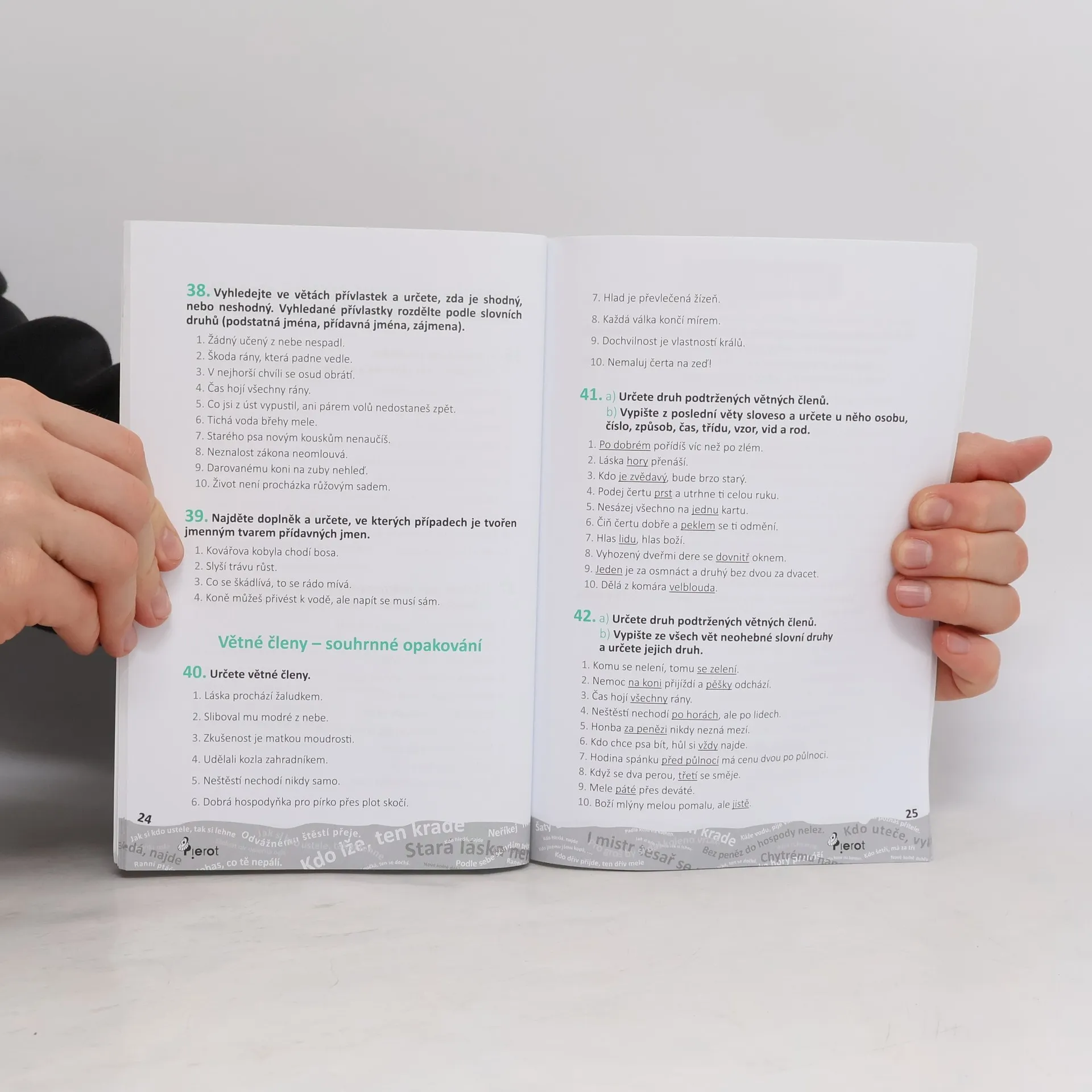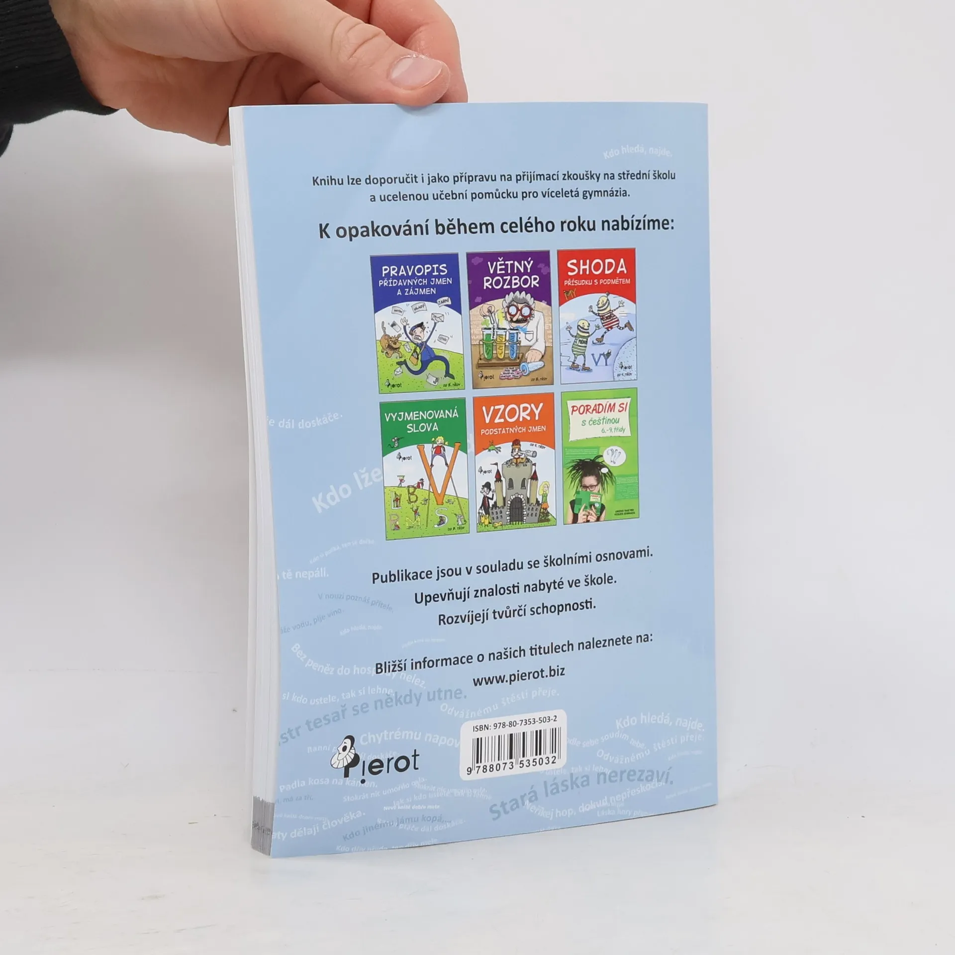 Titul obsahuje úkoly na procvičení tvarosloví (slovní druhy) a skladbu vět. Při opakování učiva si žáci „osvěží“ staré známé lidové přísloví a řčení. Publikace je v souladu se školními osnovami. Upevňuje a rozvíjí znalosti nabyté ve škole. Cvičebnici doporučujeme i jako přípravu na přijímací zkoušky na střední školu a ucelenou učební pomůcku pro víceletá gymnázia. Titul je určený pro žáky 2. stupně ZŠ.