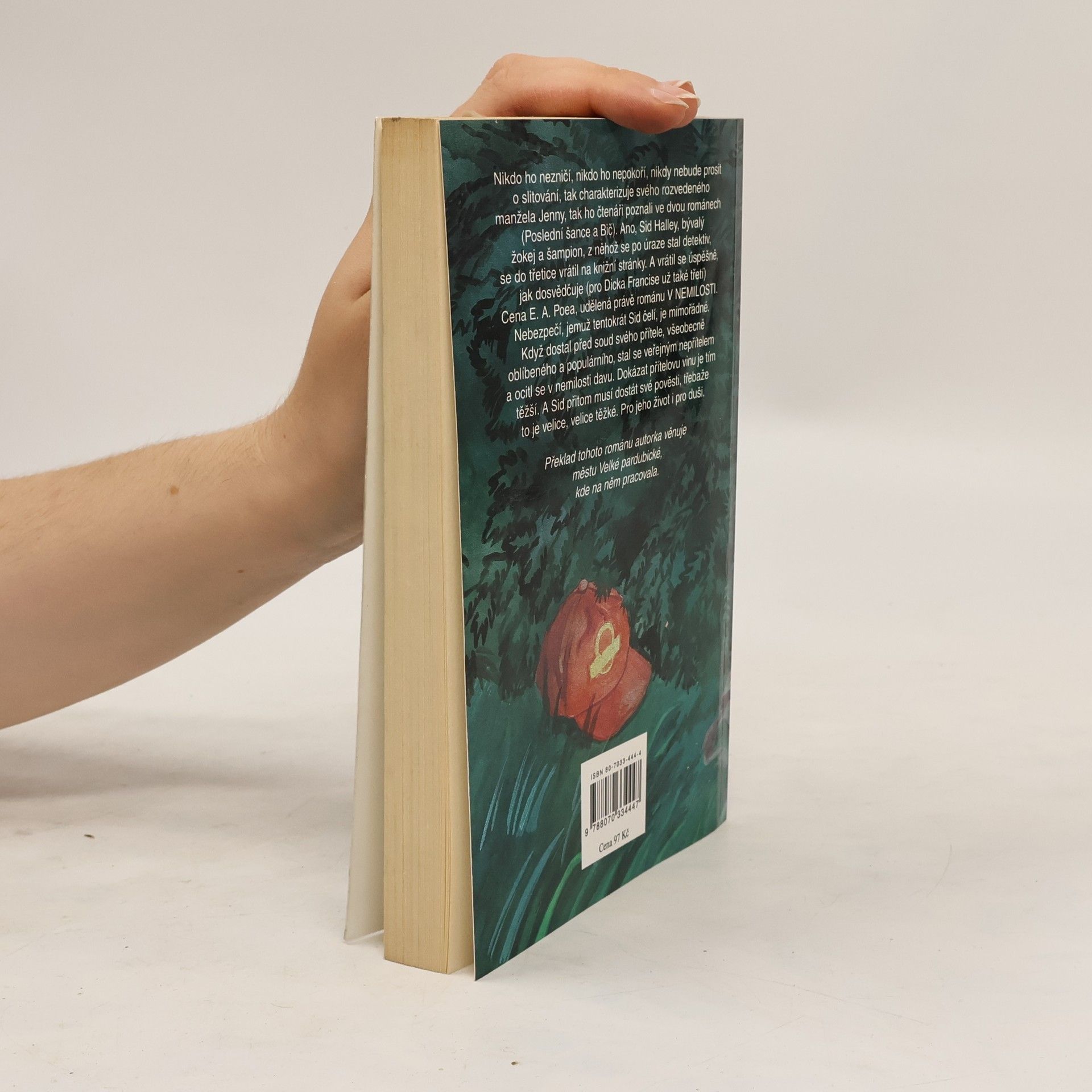 Nikdo ho nezničí, nikdo ho nepokoří, nikdy nebude prosit o slitování, tak charakterizuje svého rozvedeného manžela Jenny, tak ho čtenáři poznali ve dvou románech (Poslední šance a Bič). Ano, Sid Halley, bývalý žokej a šampion, z něhož se po úraze stal detektiv, se do třetice vrátil na knižní stránky. A vrátil se úspěšně, jak dosvědčuje (pro Dicka Francise už také třetí) Cena E. A. Poea, udělená právě románu V nemilosti. Nebezpečí, jemuž tentokrát Sid čelí, je mimořádné. Když dostal před soud svého přítele, všeobecně oblíbeného a populárního, stal se veřejným nepřítelem a ocitl se v nemilosti davu. Dokázat přítelovu vinu je tím těžší. A Sid přitom musí dostát své pověsti, třebaže to je velice těžké. Pro jeho další život i pro duši.