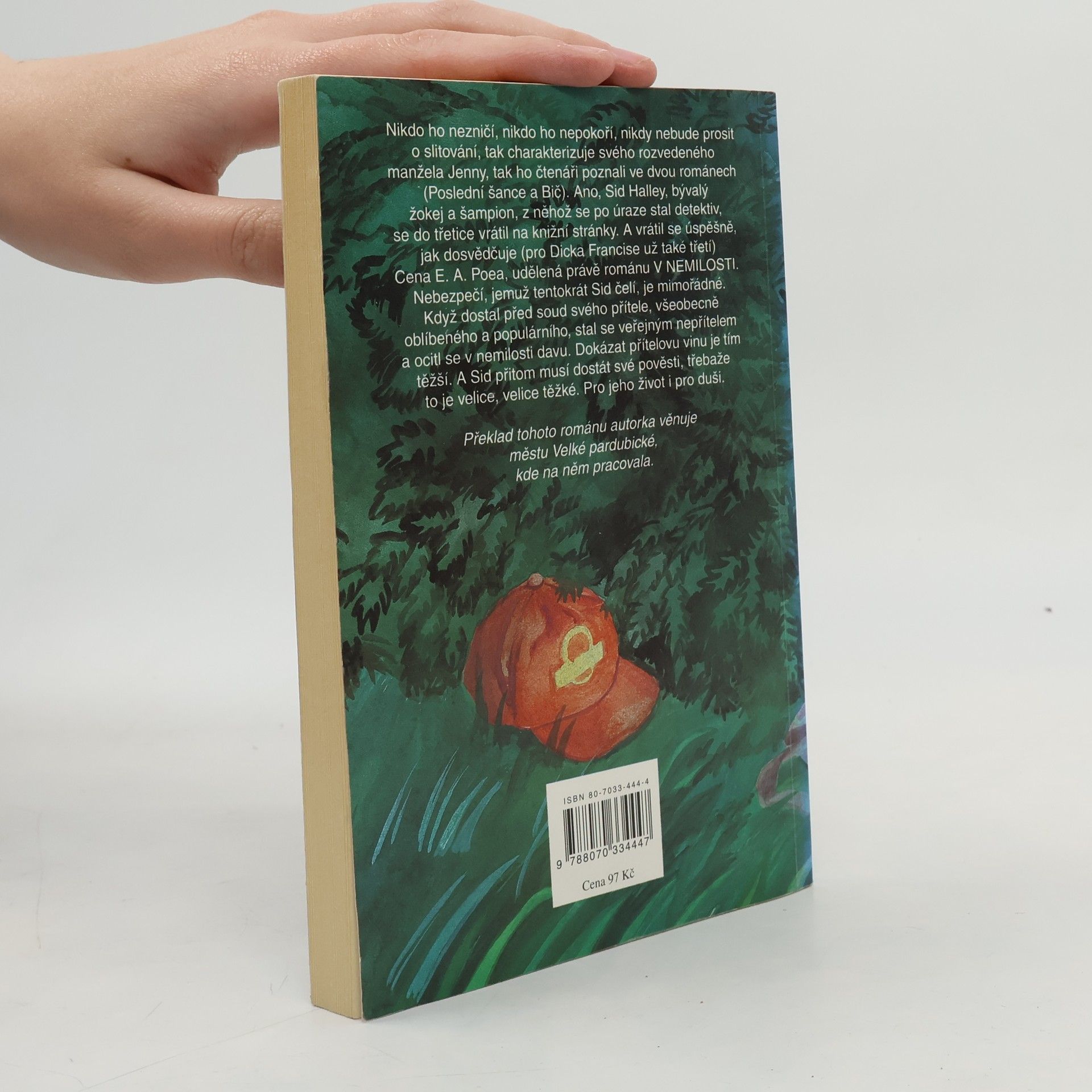 Nikdo ho nezničí, nikdo ho nepokoří, nikdy nebude prosit o slitování, tak charakterizuje svého rozvedeného manžela Jenny, tak ho čtenáři poznali ve dvou románech (Poslední šance a Bič). Ano, Sid Halley, bývalý žokej a šampion, z něhož se po úraze stal detektiv, se do třetice vrátil na knižní stránky. A vrátil se úspěšně, jak dosvědčuje (pro Dicka Francise už také třetí) Cena E. A. Poea, udělená právě románu V nemilosti. Nebezpečí, jemuž tentokrát Sid čelí, je mimořádné. Když dostal před soud svého přítele, všeobecně oblíbeného a populárního, stal se veřejným nepřítelem a ocitl se v nemilosti davu. Dokázat přítelovu vinu je tím těžší. A Sid přitom musí dostát své pověsti, třebaže to je velice těžké. Pro jeho další život i pro duši.