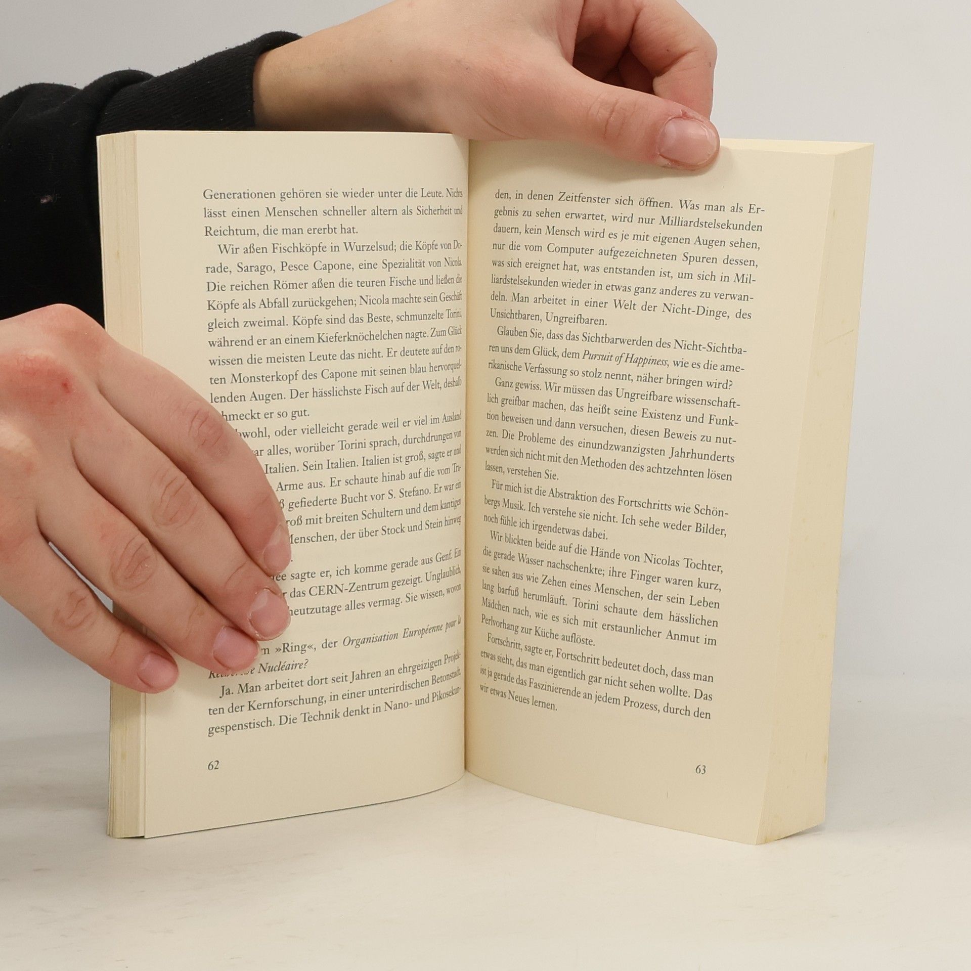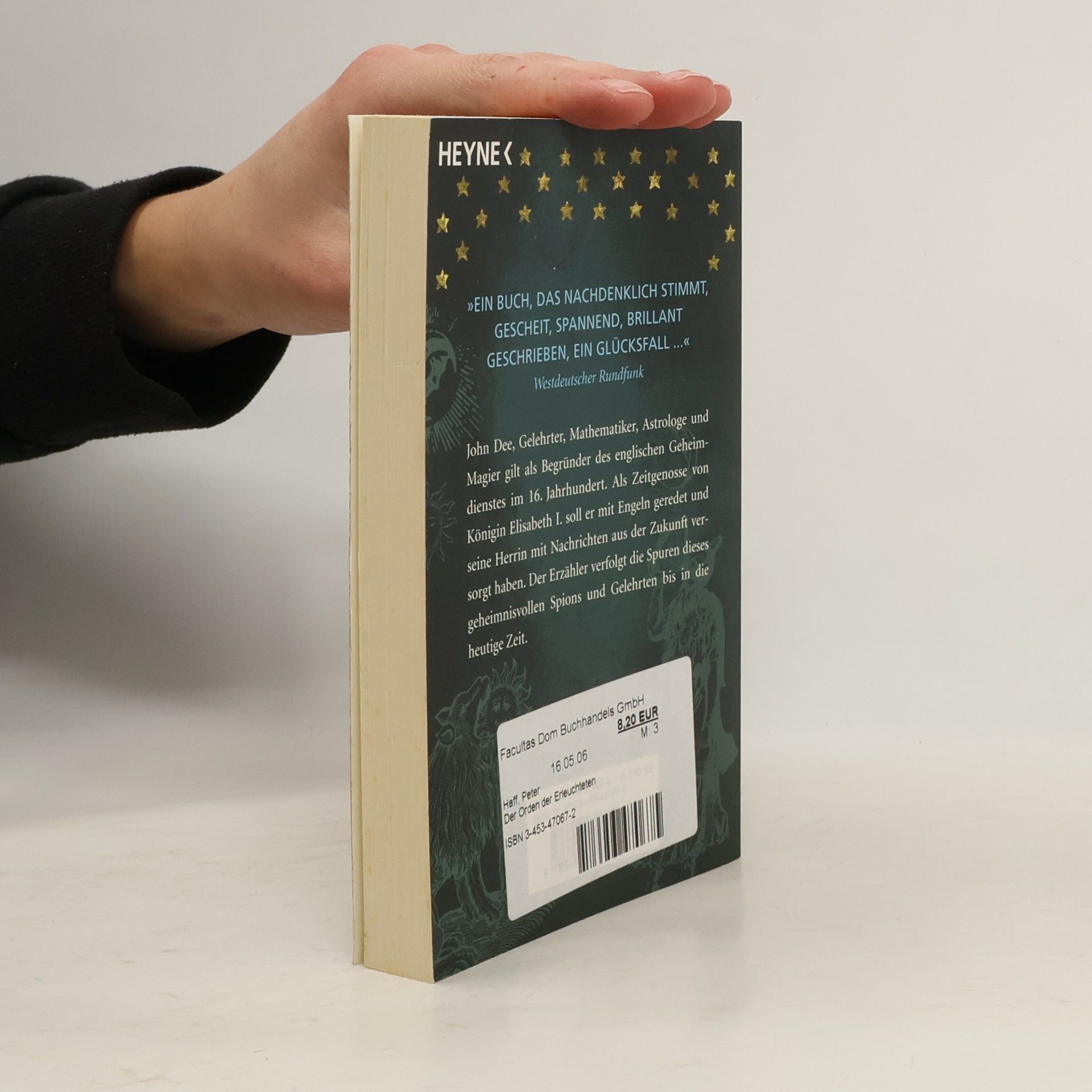 Die Suche nach dem "Heiligen Stein" beleuchtet das Leben von John Dee, dem Begründer des englischen Geheimdienstes im 16. Jahrhundert. Der Erzähler verfolgt seine Spuren bis in die Gegenwart. Das Buch wird als nachdenklich, spannend und brillant beschrieben und basiert auf historischen Fakten.