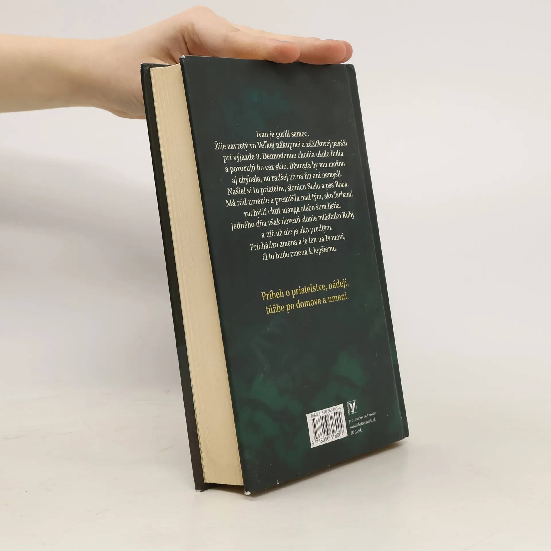 Ivan je gorilí samec. Žije zavretý vo Veľkej nákupnej a zážitkovej pasáži pri výjazde 8. Dennodenne chodia okolo ľudia a pozorujú ho cez sklo. Džungľa by mu možno aj chýbala, no radšej už na ňu ani nemyslí. Našiel si tu priateľov, slonicu Stelu a psa Boba. Má rád umenie a premýšľa nad tým, ako farbami zachytiť chuť manga alebo šum lístia. Jedného dňa však dovezú slonie mláďatko Ruby a nič už nie je ako predtým. Prichádza zmena a je len na Ivanovi, či to bude zmena k lepšiemu. Príbeh o priateľstve, nádeji, túžbe po domove a umení.