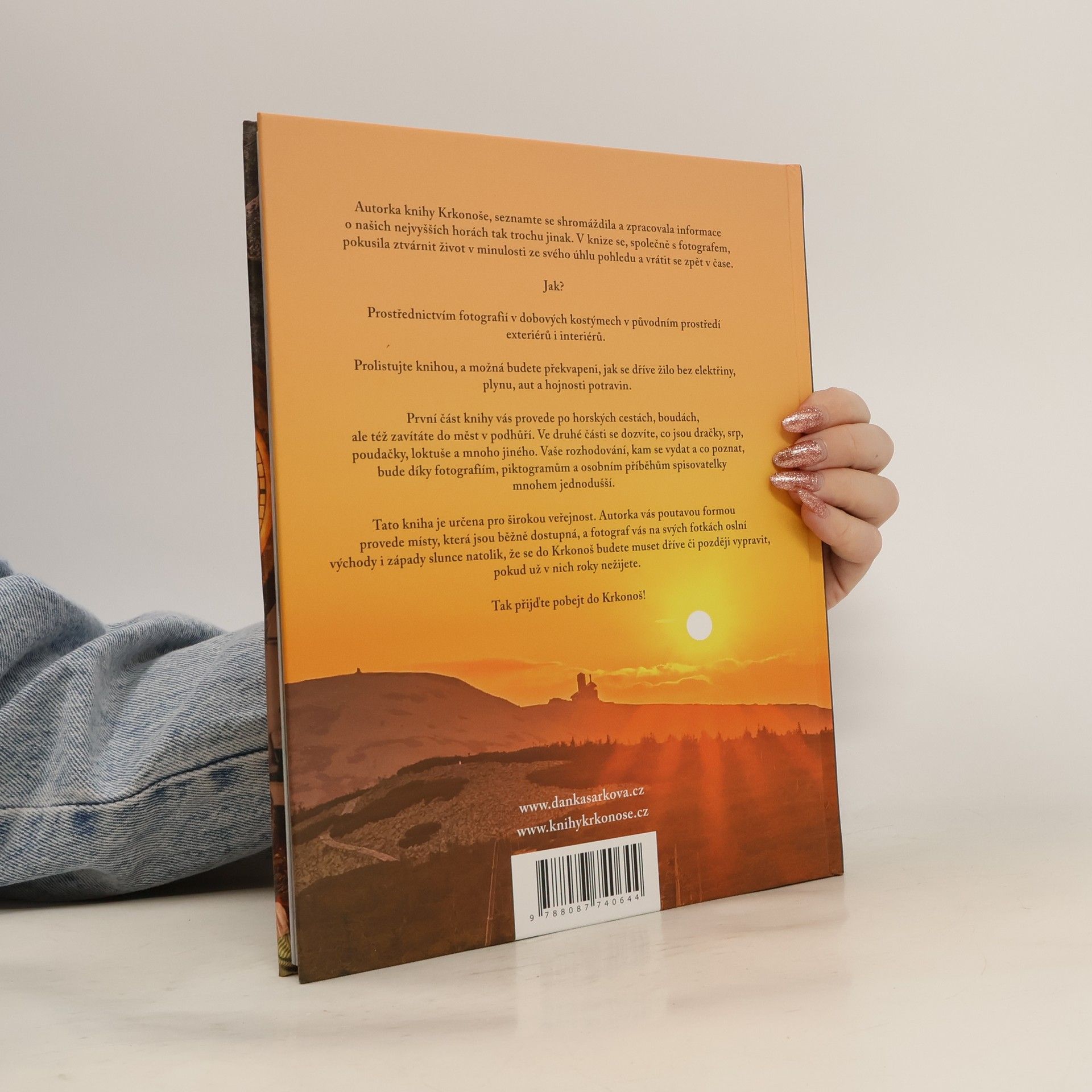 Autorka knihy Krkonoše, seznamte se! shromáždila a zpracovala informace o našich nejvyšších horách tak trochu jinak. V knize se, společně s fotografem, pokusila ztvárnit život v minulosti ze svého úhlu pohledu a vrátit se zpět v čase.Jak?Prostřednictvím fotografií v dobových kostýmech v původním prostředí exteriérů i interiérů.Prolistujte knihou, a možná budete překvapeni, jak se dříve žilo bez elektřiny, plynu, aut a hojnosti potravin.První část knihy vás provede po horských cestách, boudách, ale též zavítáte do měst v podhůří. Ve druhé části se dozvíte, co jsou dračky, srp, poudačky, loktuše a mnoho jiného. Vaše rozhodování, kam se vydat a co poznat, bude díky fotografiím, piktogramům a osobním příběhům autorky mnohem jednodušší.Tato kniha je určena pro širokou veřejnost. Autorka vás poutavou formou provede do míst, která jsou běžně dostupná, a fotograf vás na svých fotkách oslní východy i západy slunce natolik, že se do Krkonoš budete muset dříve či později vypravit, pokud už v nich roky nežijete.Tak přijďte pobejt do Krkonoš!