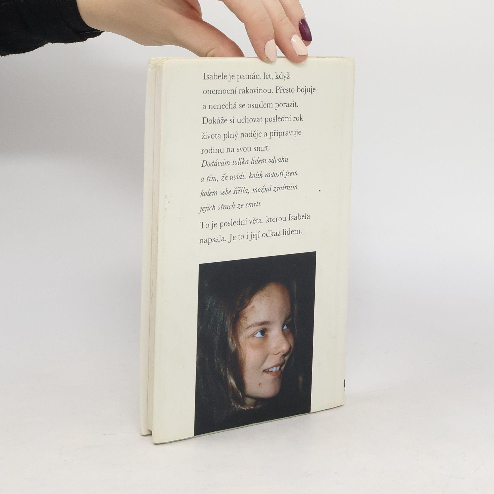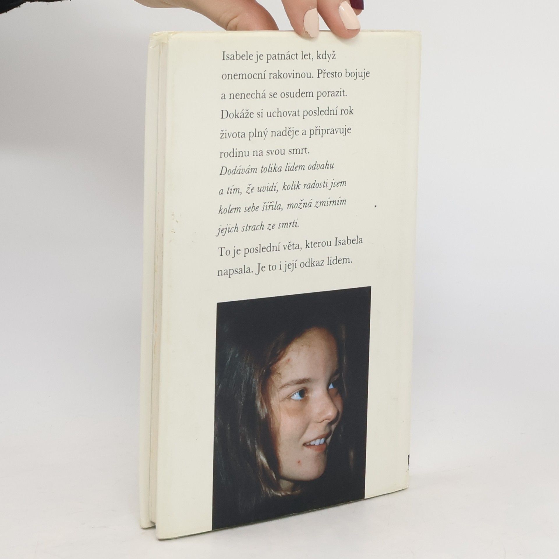Isabele je patnáct let, když onemocní rakovinou. Přesto bojuje a nenechá se osudem porazit. Dokáže si uchovat poslední rok života plný naděje a připravuje svou rodinu na svou smrt. "Dodávám tolika lidem odvahu a tím, že uvidí, kolik radosti jsem kolem sebe šířila, možná zmírním jejich strach ze smrti." - To je poslední věta, kterou Isabela napsala. Je to i její odkaz lidem.