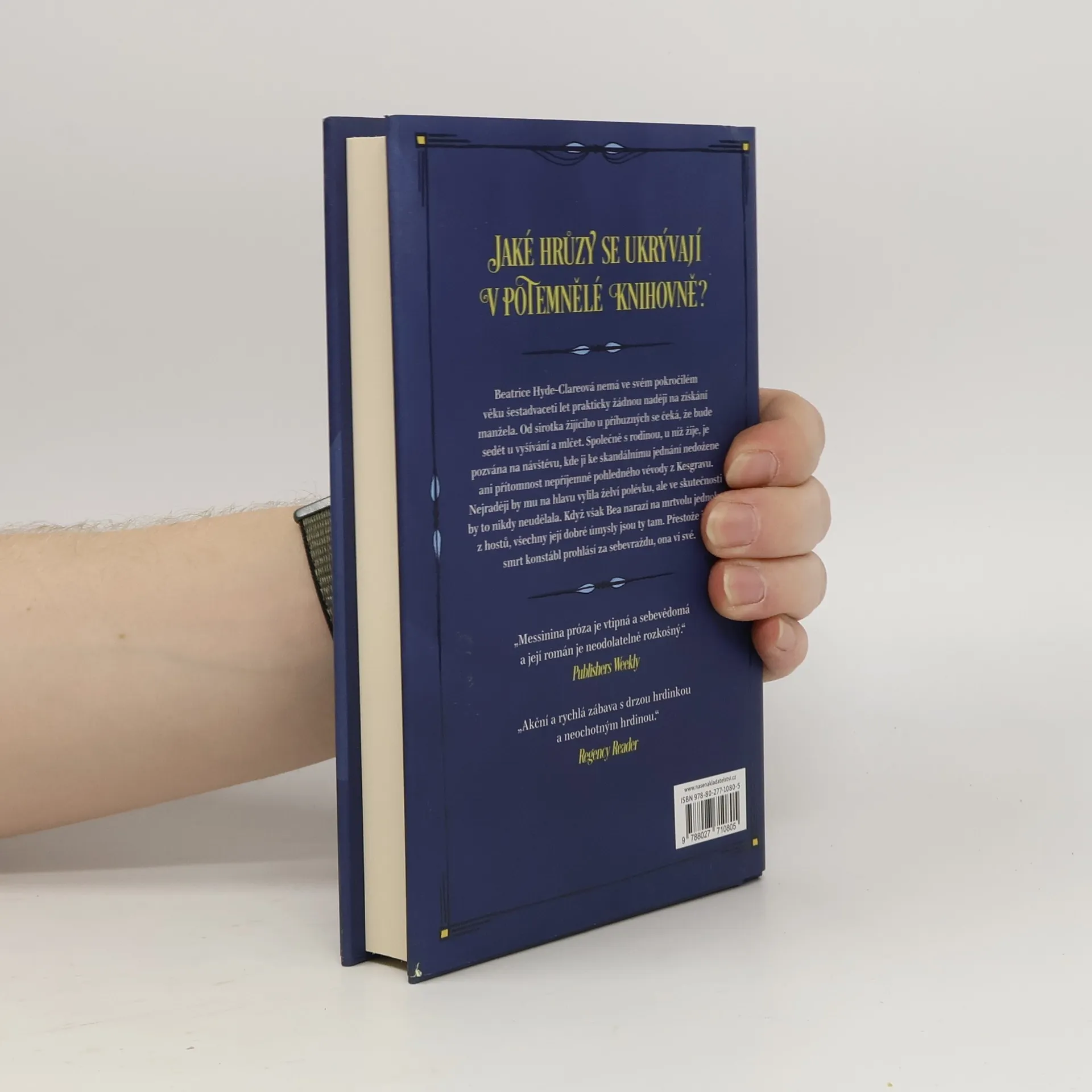 Jaké hrůzy se ukrývají v potemnělé knihovně? Šestadvacetiletá Beatrice Hyde-Clareová je příliš plachá, aby se pustila do vyšetřování podezřelé smrti jednoho z hostů panského domu v Lake Districtu. Stará panna, která je neochotně trpěnou schovankou svých příbuzných, by se jistě neodvážila prohledávat pokoje syna vážené hostitelky a jeho urozeného přítele, jen aby získala usvědčující důkazy. Byla vychována k úctě a poslušnosti, takže by ji samozřejmě nikdy v životě nenapadlo vyslýchat panovačného vévodu z Kesgravu a už vůbec by si netroufla zpochybňovat způsob, jakým celou záležitost předložil místnímu konstáblovi. Jenže když v opuštěné knihovně venkovského sídla Skeffingtonových zakopne o zkrvavené tělo ubohého pana Otleyho, přesně tohle udělá.