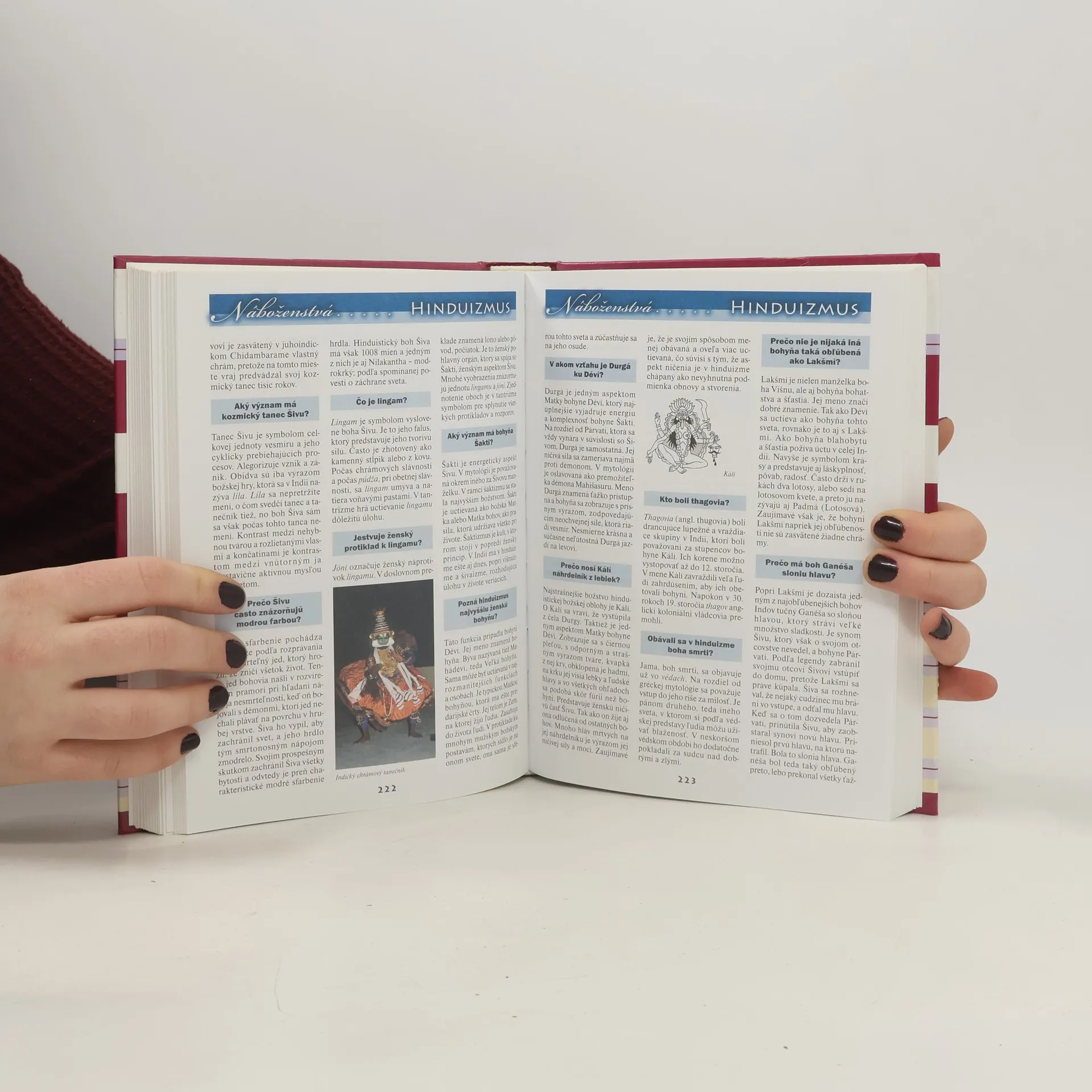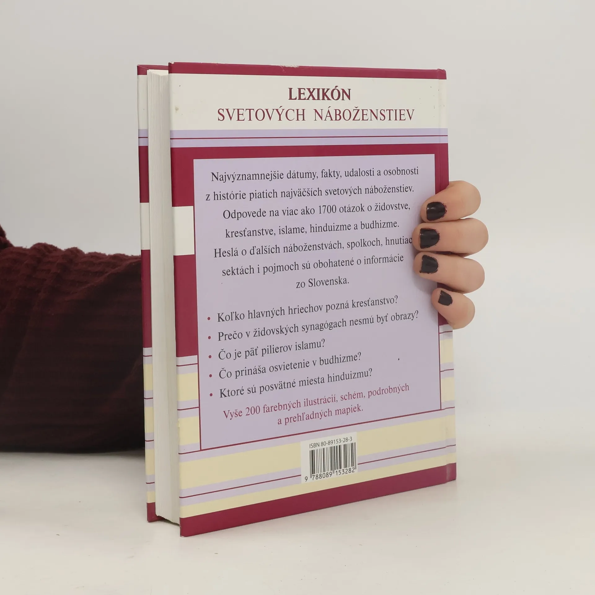 Najvýznamnejšie dátumy, fakty, udalosti a osobnosti z histórie piatich najväčších svetových náboženstiev. Odpovede na viac ako 1700 otázok o židovstve, kresťanstve, islame, hinduizme a budhizme. Heslá o ďalších náboženstvách, spolkoch, hnutiach, sektách i pojmoch sú obohatené o informácie zo Slovenska.Vyše 200 farebných ilustrácií, schém, podrobných a prehľadných mapiek.