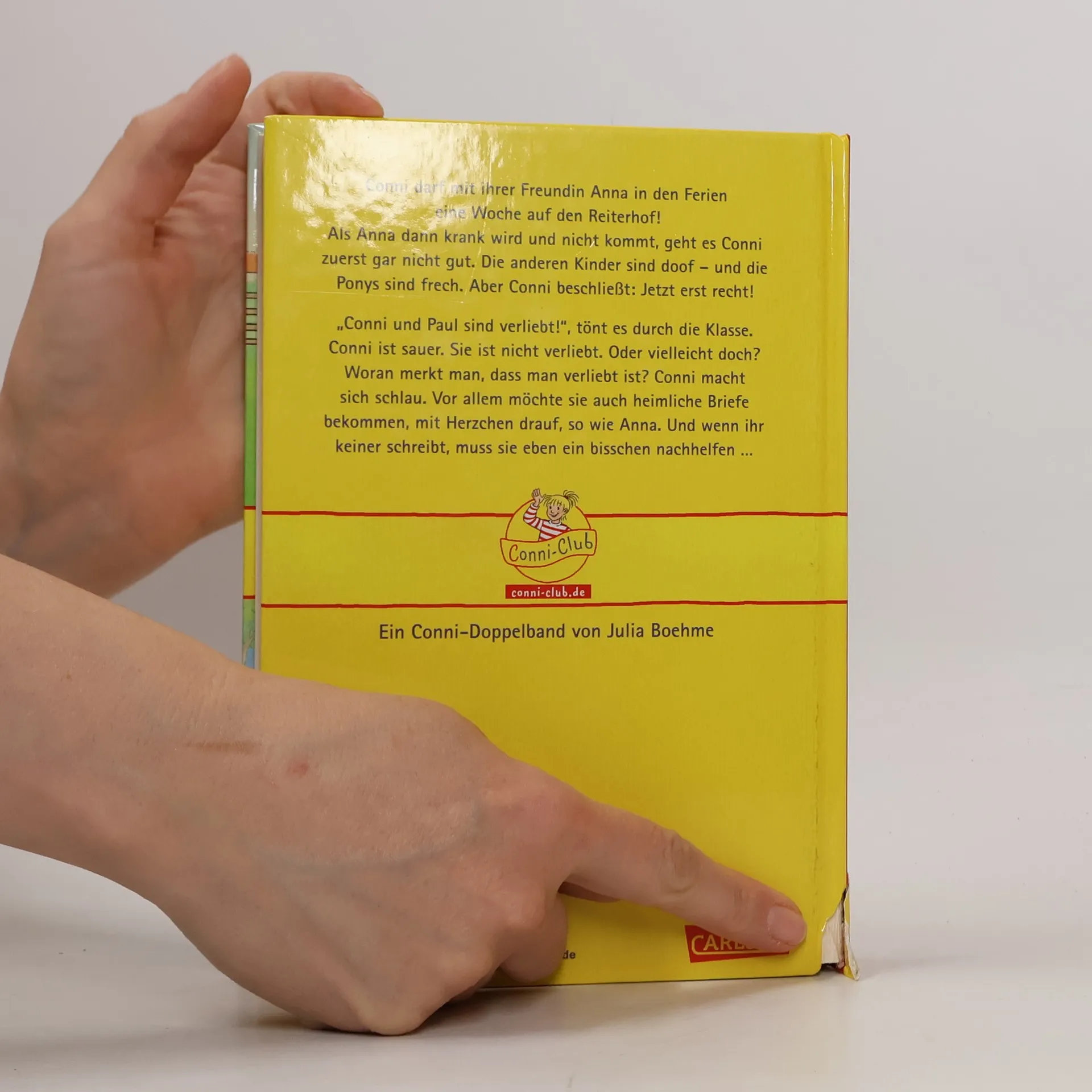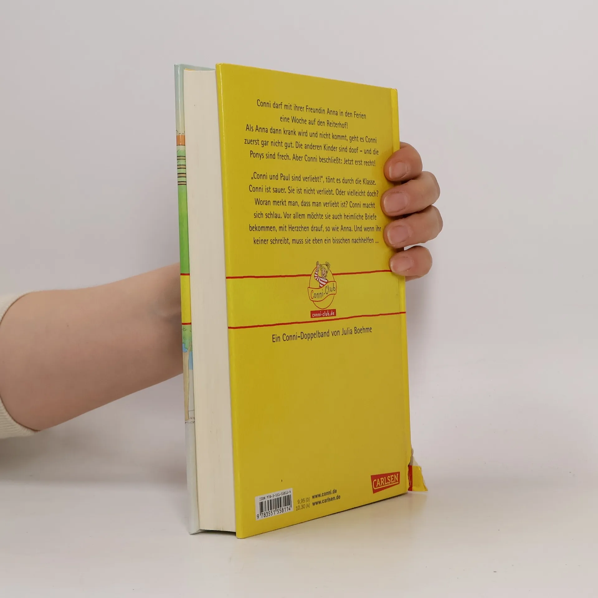 Conni darf mit ihrer Freundin Anna in den Ferien eine Woche auf den Reiterhof! Ein bißchen mulmig ist ihr schon, denn so lange war sie noch nie alleine weg - aber sie ist ja kein Baby mehr. Als Anna dann krank wird und nicht kommt, geht es Conni auf dem Reiterhof zuerst gar nicht gut. Die anderen Kinder sind doof - und die Ponys sind frech. Aber Conni wäre nicht Conni, wenn sie nicht beschließen würde: Jetzt erst recht! „Conni und Paul sind verliebt!“, tönt es durch die Klasse. Conni ist sauer. Sie ist nicht verliebt. Oder vielleicht doch? Woran merkt man, dass man verliebt ist? Conni macht sich schlau. Vor allem möchte sie auch heimliche Briefe bekommen, mit Herzchen drauf, so wie Anna. Und wenn ihr keiner schreibt, muss sie eben ein bisschen nachhelfen ... Ein Conni-Doppelband von Julia Boehme