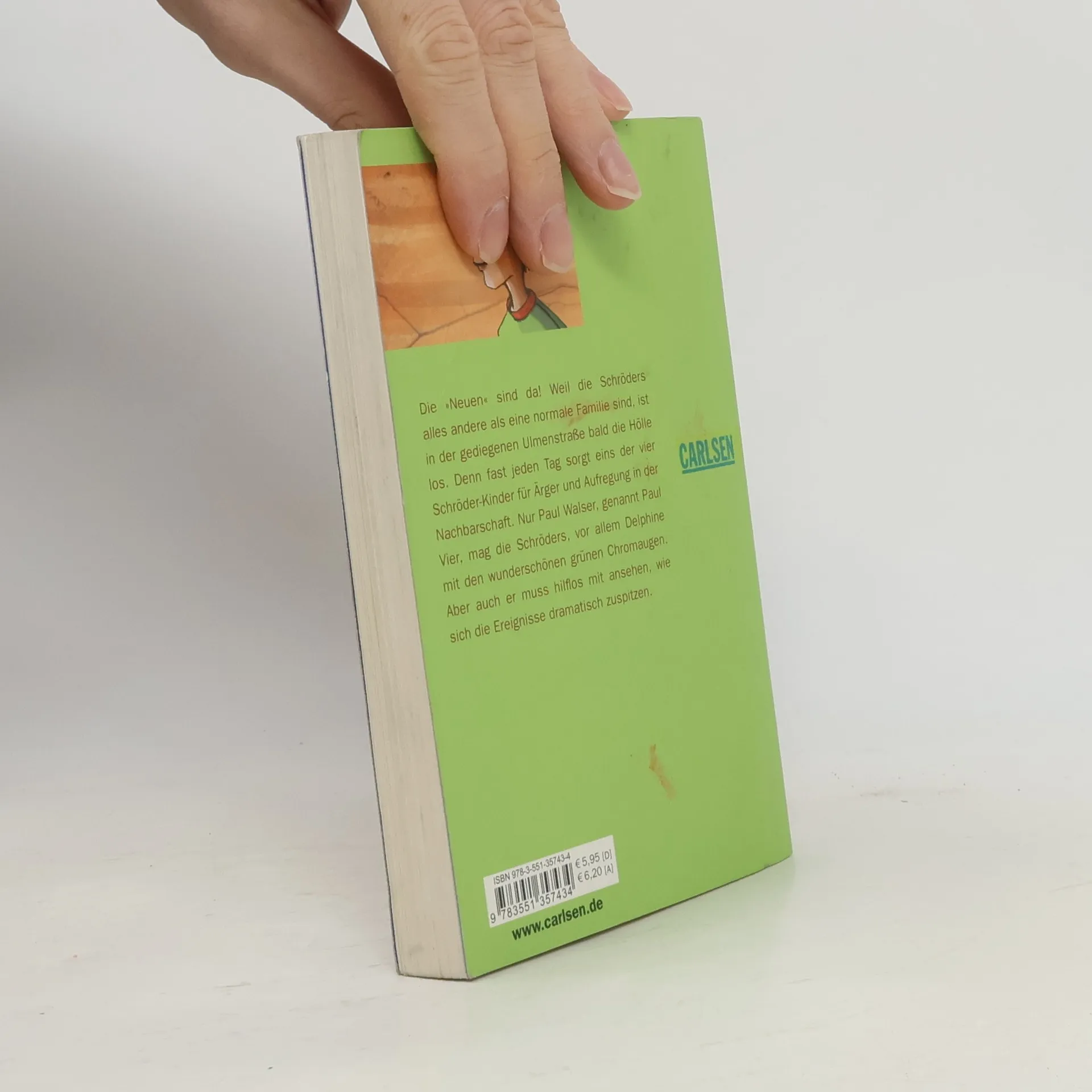 Die »Neuen« sind da! Weil die Schröders alles andere als eine normale Familie sind, ist in der gediegenen Ulmenstraße bald die Hölle los. Denn fast jeden Tag sorgt eins der vier Schröder-Kinder für Ärger und Aufregung in der Nachbarschaft. Nur Paul Walser, genannt Paul Vier, mag die Schröders, vor allem Delphine mit den wunderschönen grünen Chromaugen. Aber auch er muss hilflos mit ansehen, wie sich die Ereignisse dramatisch zuspitzen.