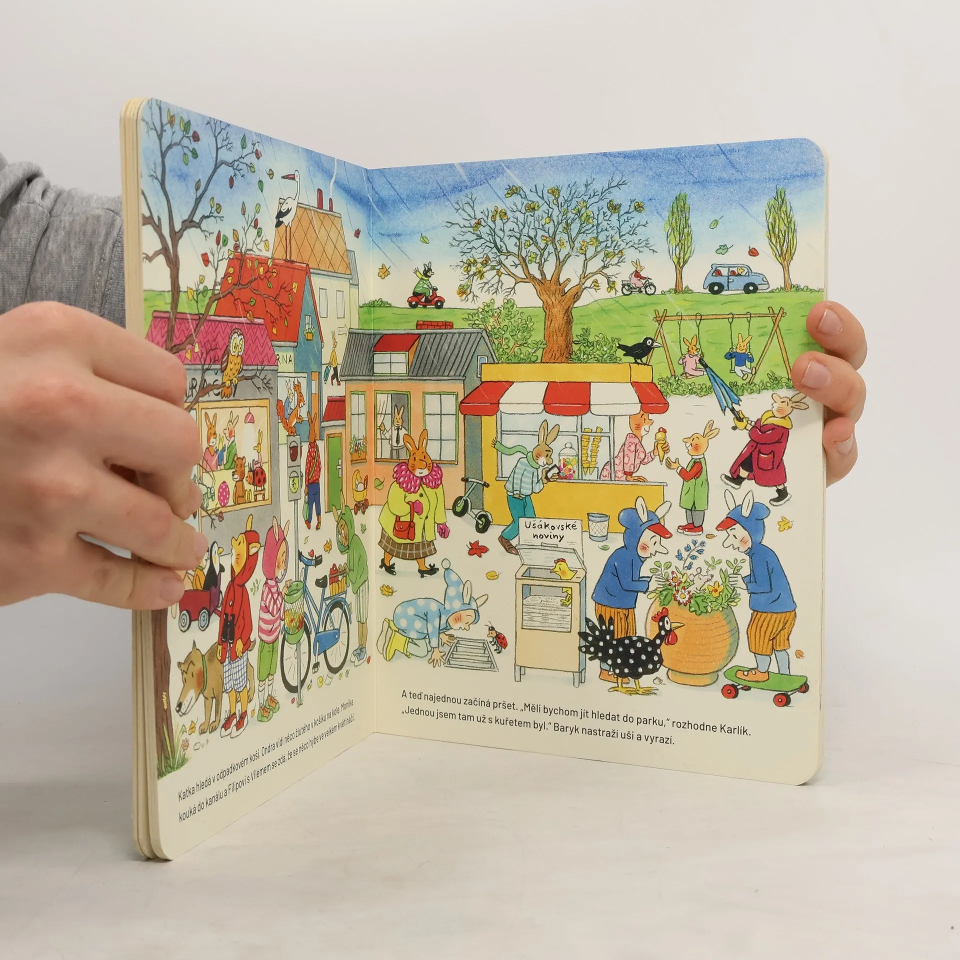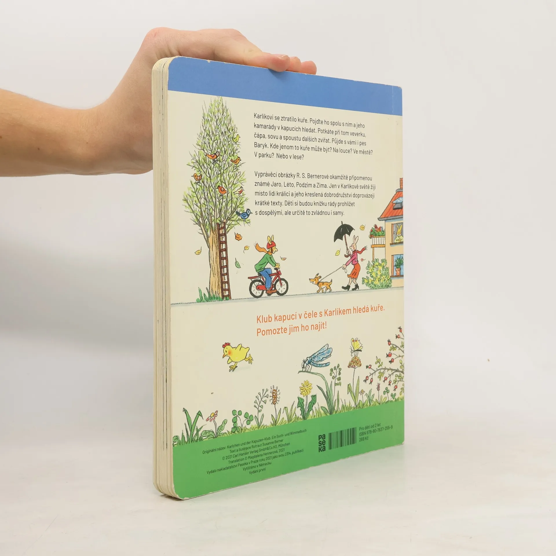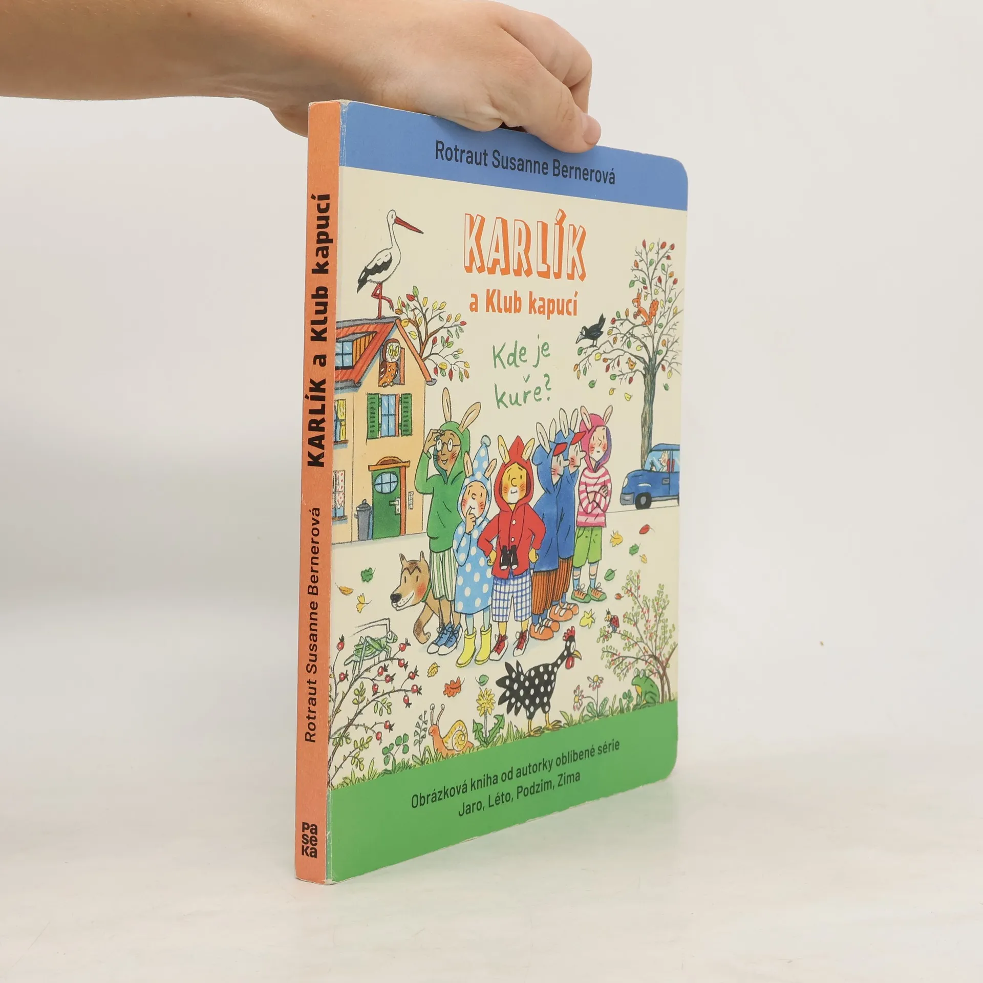 Karlíkovi se ztratilo kuře. Pojďte ho spolu s ním a jeho kamarády v kapucích hledat. Potkáte při tom veverku, čápa, sovu a spoustu dalších zvířat. Půjde s vámi i pes Baryk. Kde jenom to kuře může být? Na louce? Ve městě? V parku? Nebo v lese? Vyprávěcí obrázky R. S. Bernerové okamžitě připomenou známé Jaro, Léto, Podzim a Zima. Jen v Karlíkově světě žijí místo lidí králíci a jeho kreslená dobrodružství doprovázejí krátké texty. Děti si budou knížku rády prohlížet s dospělými, ale určitě to zvládnou i samy.
