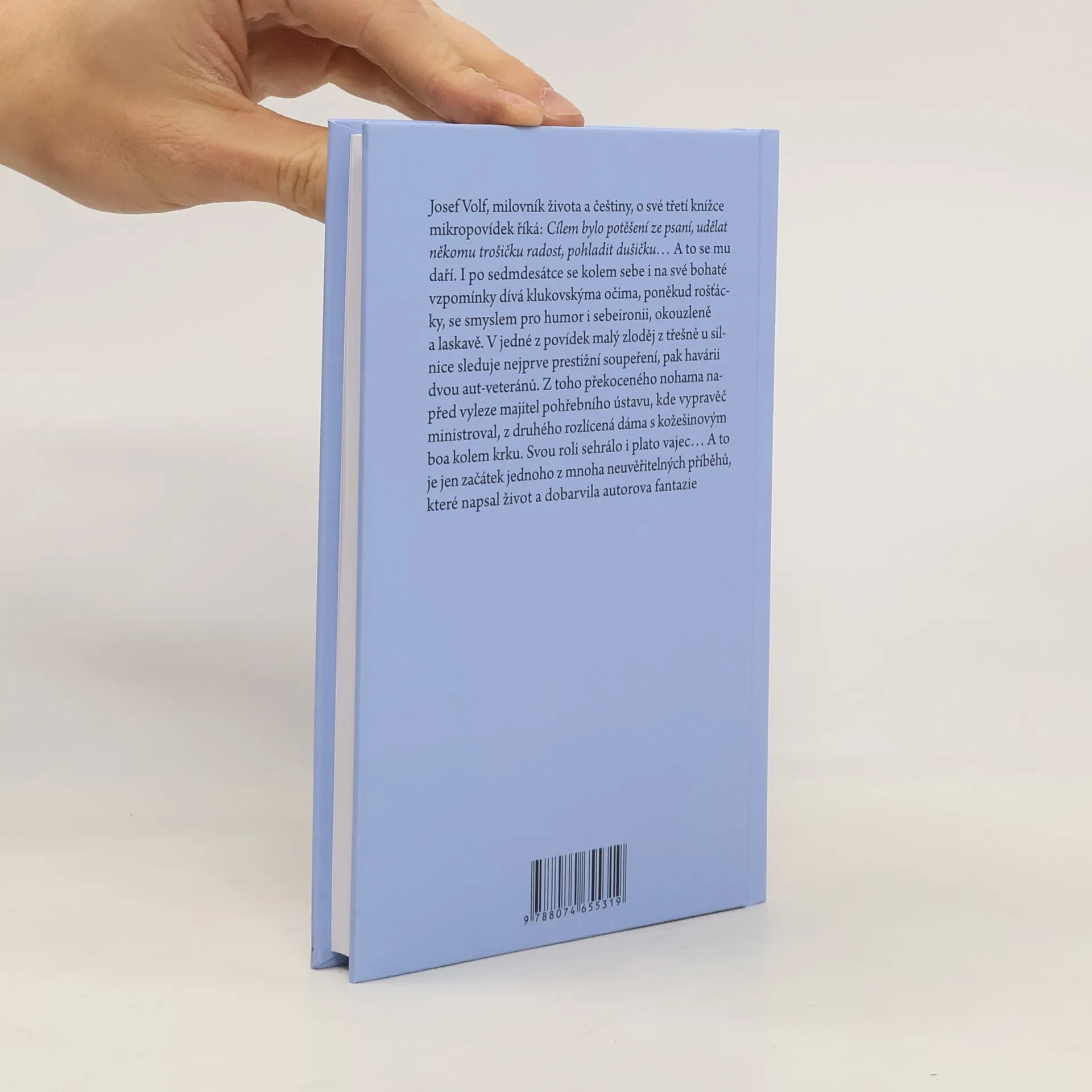 Josef Volf, milovník života a češtiny, o své třetí knížce mikropovídek říká: Cílem bylo potěšení ze psaní, udělat někomu trošičku radost, pohladit dušičku… A to se mu daří. I po sedmdesátce se kolem sebe i na své bohaté vzpomínky dívá klukovskýma očima, poněkud rošťácky, se smyslem pro humor i sebeironii, okouzleně a laskavě. V jedné z povídek malý zloděj z třešně u silnice sleduje nejprve prestižní soupeření, pak havárii dvou aut-veteránů. Z toho překoceného nohama napřed vyleze majitel pohřebního ústavu, kde vypravěč ministroval, z druhého rozlícená dáma s kožešinovým boa kolem krku. Svou roli sehrálo i plato vajec… A to je jen začátek jednoho z mnoha neuvěřitelných příběhů, které napsal život a dobarvila autorova fantazie.
