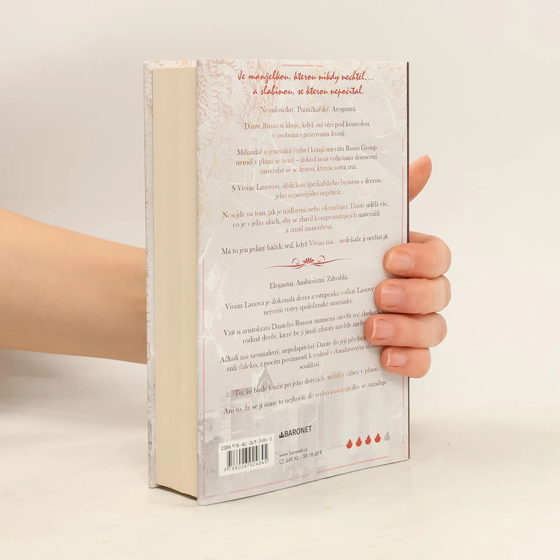 Úvodní román z další eroticko-milostné série americké autorky. Bezohledný. Arogantní. A k zešílení sexy. Dante Russo se vyžívá v kontrole, jak v osobním, tak v profesním životě. Uhrančivý miliardář a generální ředitel v jednom se nikdy neplánoval oženit. Pak ho ale hrozba vydírání donutila zasnoubit se s Vivian Lau, dědičkou šperkařského impéria a dcerou jeho nejnovějšího nepřítele. Nezáleží na tom, jak je krásná nebo okouzlující. Dante hodlá udělat vše, co je v jeho silách, aby zasnoubení zrušil. Je tu ale jeden problém: teď, když ji má... nemůže už být bez ní. Nakladatelská anotace.