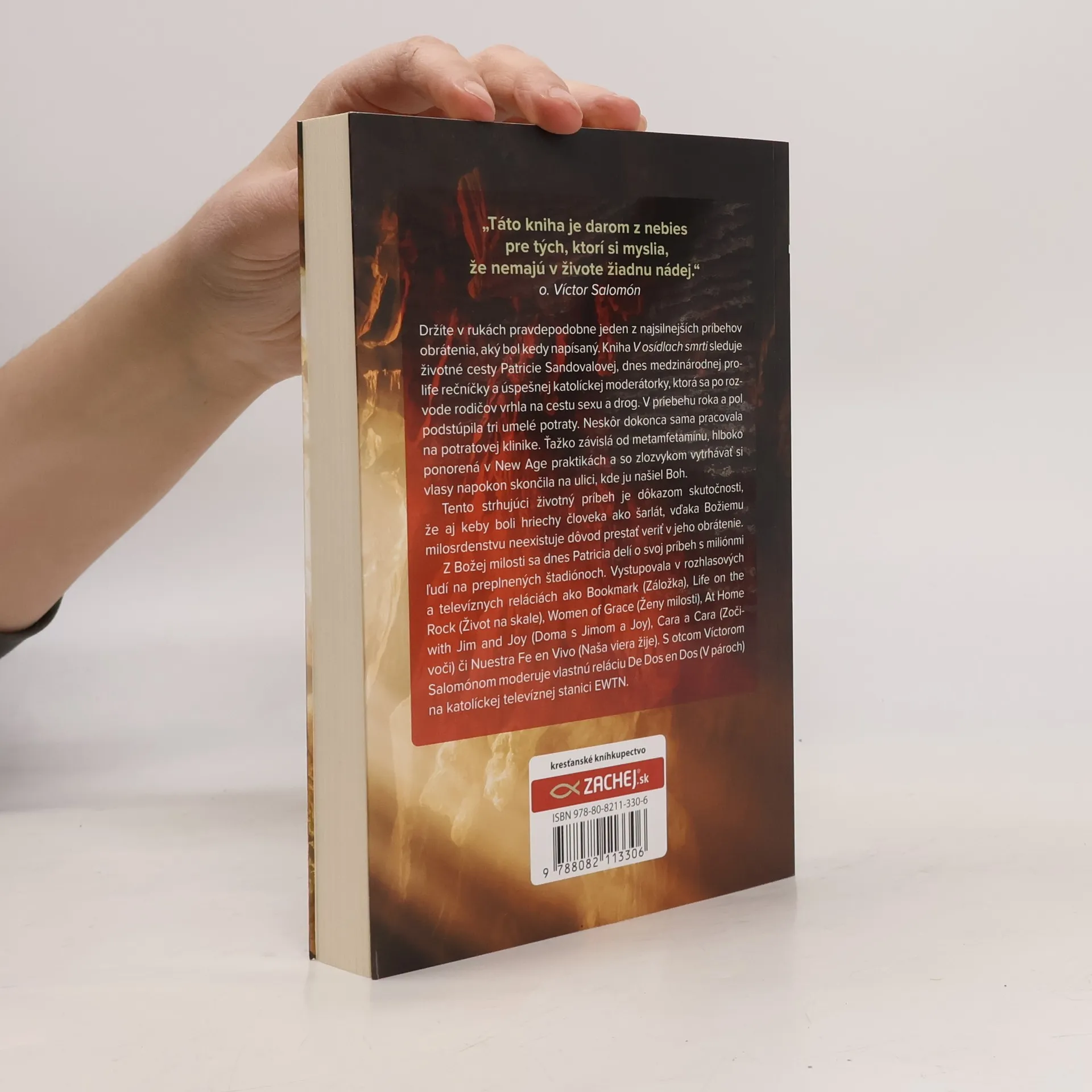 Táto kniha je darom z nebies pre tých, ktorí si myslia, že nemajú v živote žiadnu nádej. (o. Víctor Salomón) Držíte v rukách pravdepodobne jeden z najsilnejších príbehov obrátenia, aký bol kedy napísaný. Kniha V osídlach smrti sleduje životné cesty Patricie Sandovalovej, dnes medzinárodnej pro-life rečníčky a úspešnej katolíckej moderátorky, ktorá sa po rozvode rodičov vrhla na cestu sexu a drog. V priebehu roka a pol podstúpila tri umelé potraty. Neskôr dokonca sama pracovala na potratovej klinike. Ťažko závislá od metamfetamínu, hlboko ponorená v New Age praktikách a so zlozvykom vytrhávať si vlasy napokon skončila na ulici, kde ju stretol Boh. Tento strhujúci životný príbeh je dôkazom skutočnosti, že aj keby boli hriechy človeka ako šarlát, vďaka Božiemu milosrdenstvu neexistuje dôvod prestať veriť v jeho obrátenie. Z Božej milosti sa dnes Patricia delí o svoj príbeh s miliónmi ľudí na preplnených štadiónoch. Vystupovala v rozhlasových a televíznych reláciách ako Bookmark (Záložka), Life on the Rock (Život na skale), Women of Grace (Ženy milosti), At Home with Jim and Joy (Doma s Jimom a Joy), Cara a Cara (Zoči-voči) či Nuestra Fe en Vivo (Naša viera žije). S otcom Víctorom Salomónom moderuje vlastnú reláciu De Dos en Dos (V pároch) na katolíckej televíznej stanici EWTN.