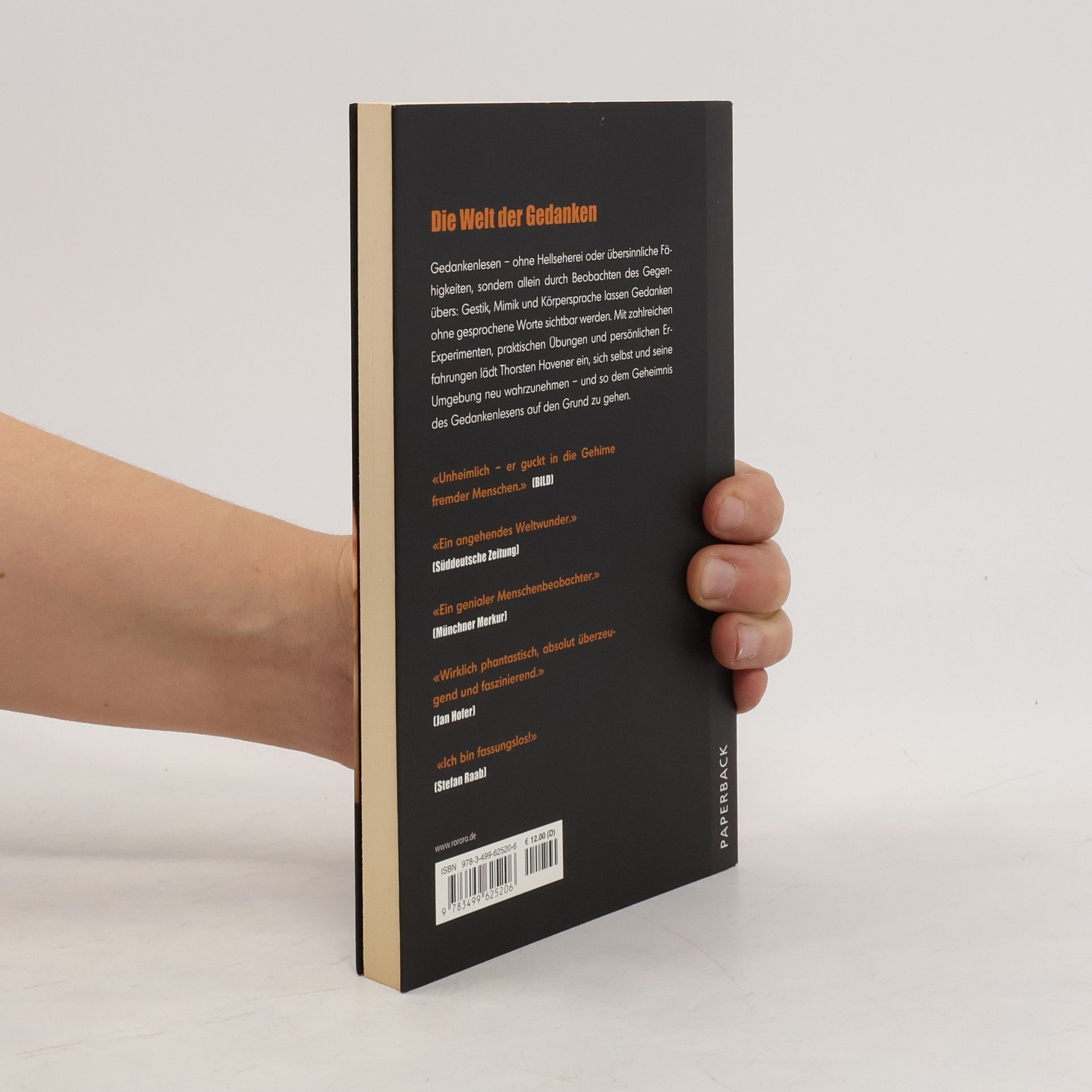 Die Welt der Gedanken Gedankenlesen – ohne Hellseherei oder übersinnliche Fähigkeiten, sondern allein durch Beobachten des Gegenübers: Gestik, Mimik und Körpersprache lassen Gedanken ohne gesprochene Worte sichtbar werden. Mit zahlreichen Experimenten, praktischen Übungen und persönlichen Erfahrungen lädt Thorsten Havener ein, sich selbst und seine Umgebung neu wahrzunehmen – und so dem Geheimnis des Gedankenlesens auf den Grund zu gehen.