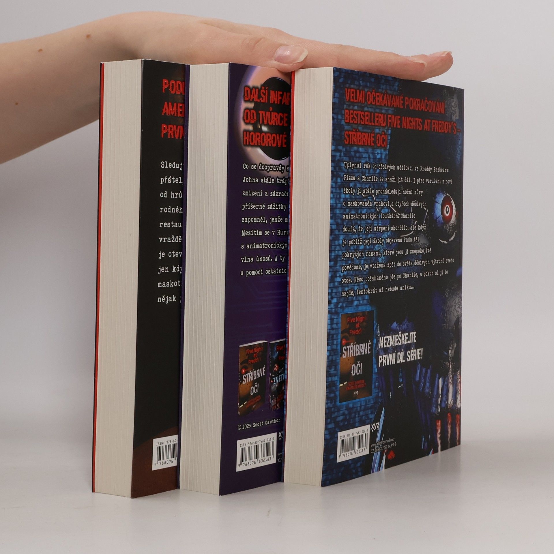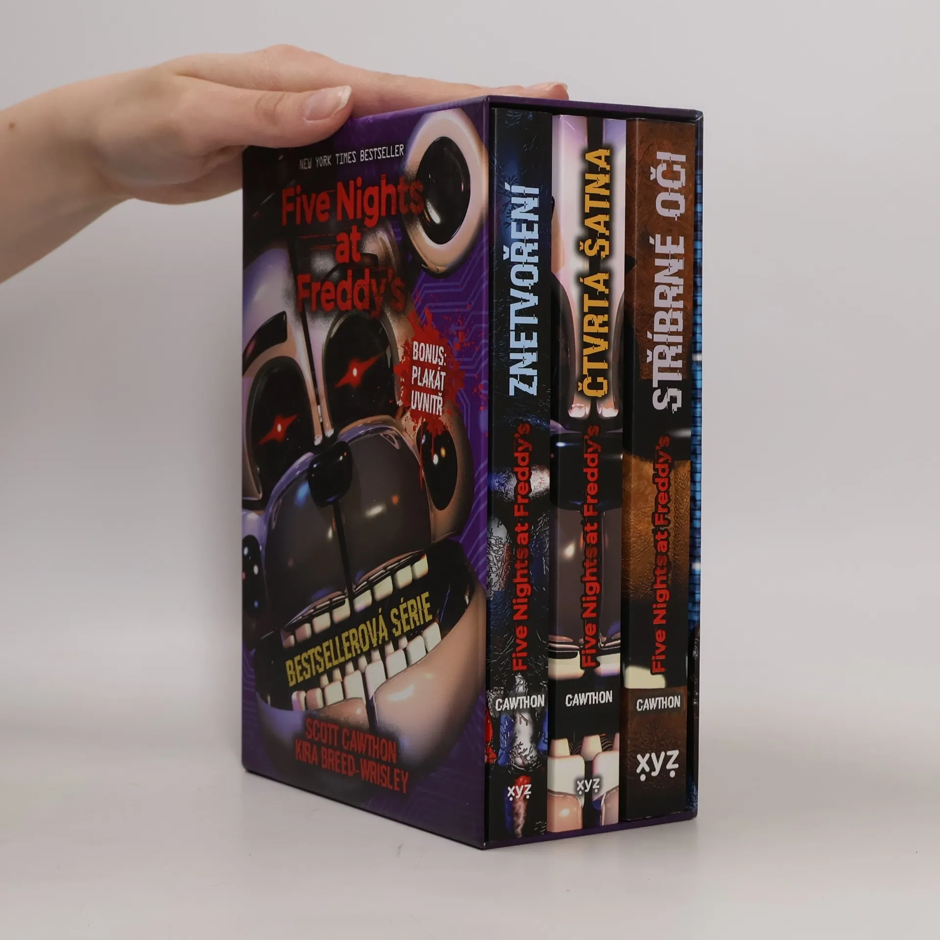Stříbrné oči, Znetvoření, Čtvrtá šatna. Tři knihy základní série pěkně pohromadě v dárkovém boxu! Od děsivých vražd v pizzerii Freddyho Fazbeara uplynulo deset let. Charlie, jejíž otec restauraci vlastnil, se v den výročí masakru znovu setkává se svými přáteli z dětství a společně se vracejí do opuštěné pizzerie. Něco se tu ale změnilo... Čtyři animatroničtí maskoti, kteří kdysi bavili návštěvníky restaurace, mají temné tajemství...