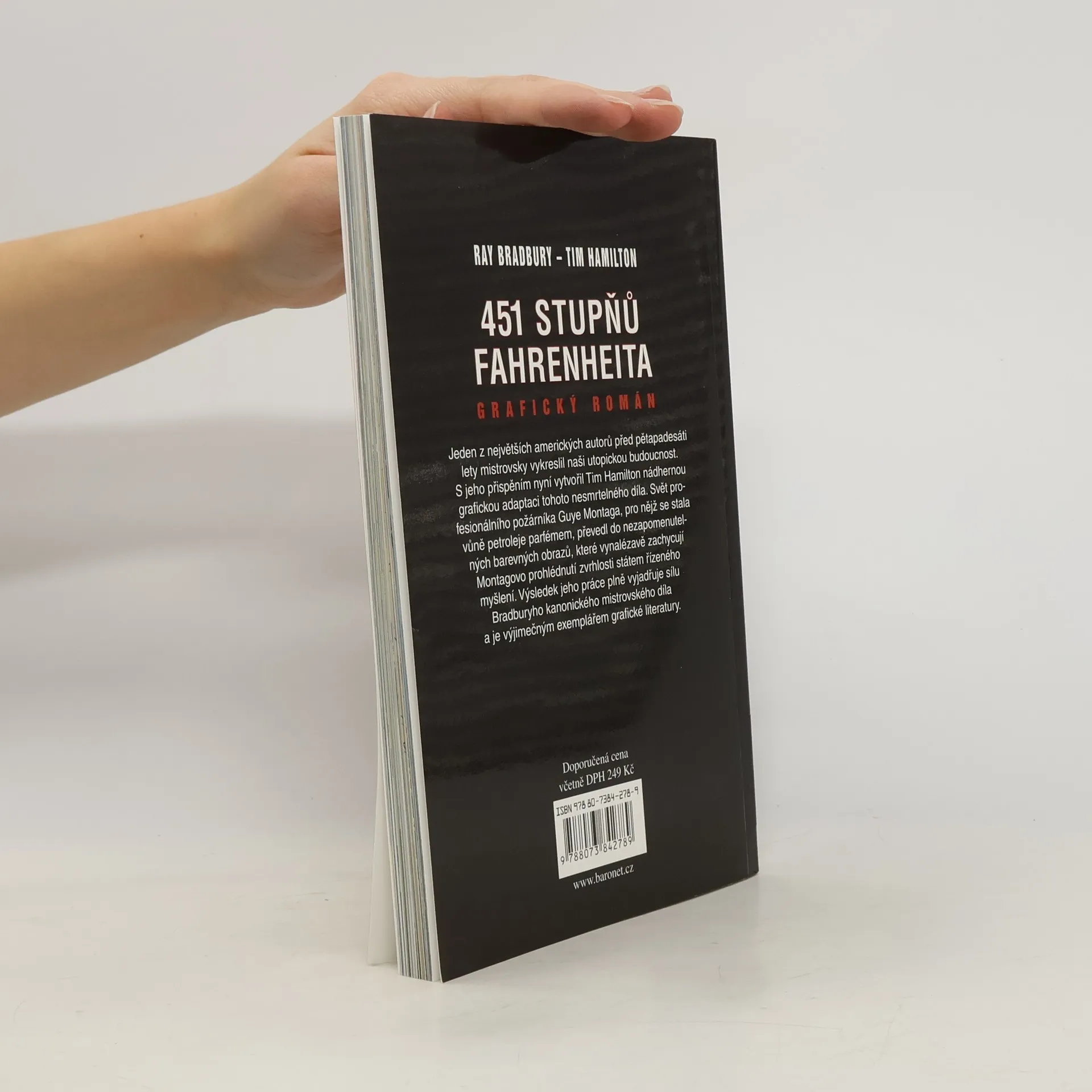 Jeden z největších amerických autorů před pětapadesáti lety mistrovsky vykreslil naši utopickou budoucnost. S jeho přispěním nyní vytvořil Tim Hamilton nádhernou grafickou adaptaci tohoto nesmrtelného díla. Svět profesionálního požárníka Guye Montaga, pro nějž se stala vůně petroleje parfémem, převedl do nezapomenutelných barevných obrazů, které vynalézavě zachycují Montagovo prohlédnutí zvrhlosti státem řízeného myšlení. Výsledek jeho práce plně vyjadřuje sílu Bradburyho kanonického mistrovského díla a je výjimečným exemplářem grafické literatury. Předloha: Ray Bradbury, Scénář, kresba, obálka: Tim Hamilton, Překlad: Jarmila Emmerová a Josef Škvorecký.