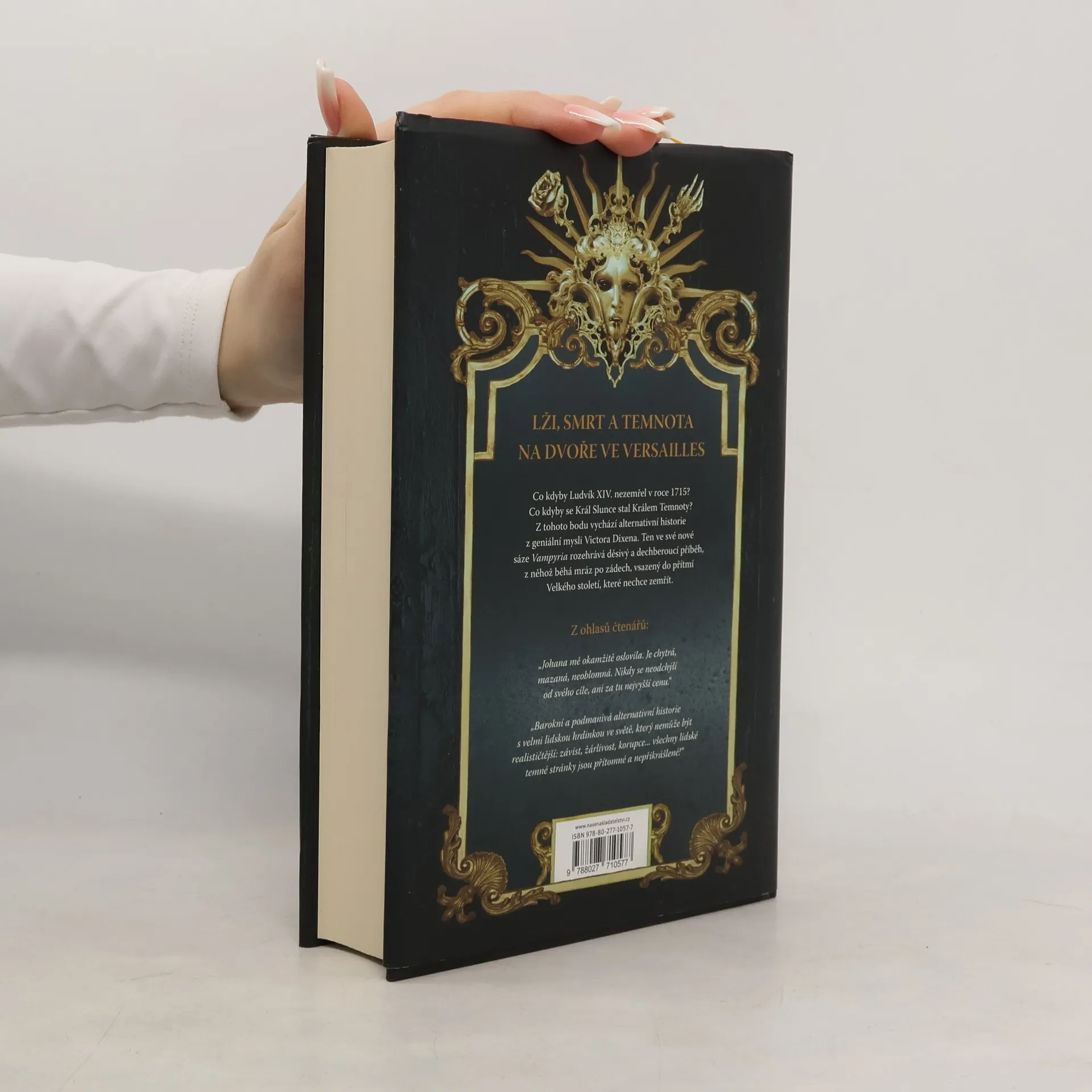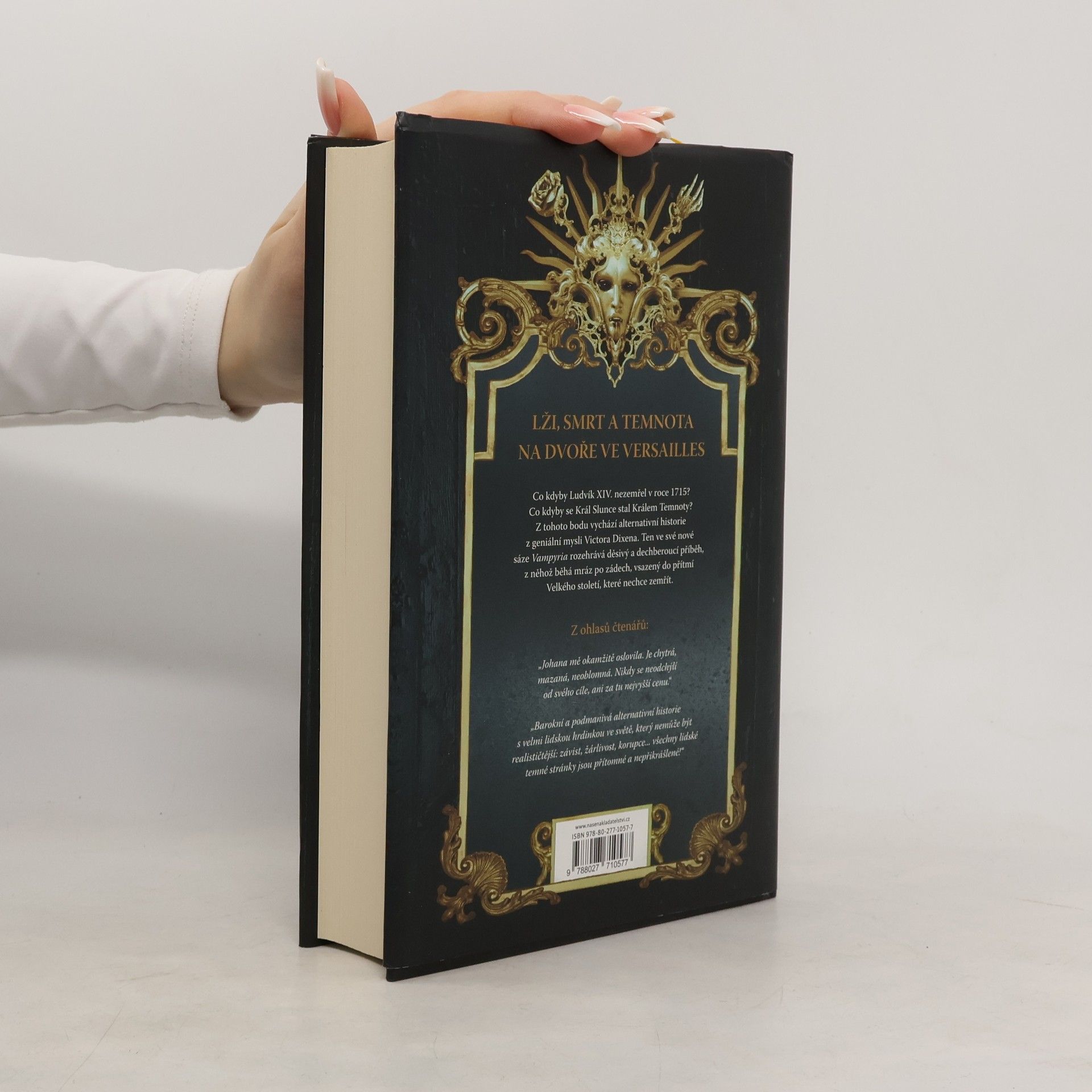 ,,Ve Versailles se rozvineš jako exotická květina. Vampýři v paláci šílí po všem, co není všední. Ale pozor: Dvůr Temnoty má svá pravidla, své smrtící nástrahy, a i za tu sebemenší chybu se platí krví…“ V roce Spásy 1715 se Král Slunce nechal transmutovat v nesmrtelného vampýra, a stal se Králem Temnoty. Od té doby despoticky vládne Francii i jejím místokrálovstvím, které nadobro ustrnuly ve Velkém století. Temnota postupně ovládá celý svět. Veškerý lid je spoután okovy a držen v hrůze. Pro nakrmení vampýrů, kteří tvoří nejvyšší šlechtu země, navíc doslova prolévá krev. Tři sta let po Králově transmutaci je Johana vytržena ze své neurozené rodiny a vržena do školy ve Versailles, která připravuje mladé šlechtice na život u Dvora. Bude čelit krutosti živých-mrtvých, intrikám spolužáků i množícím se nestvůrnostem mezi zdmi královského paláce. Johana má ovšem tajný úkol. Co všechno bude ochotna mu obětovat a podaří se jí ho nakonec splnit? Victor Dixen ve své nové sáze Vampyria rozehrává dechberoucí alternativní historii, ze které běhá mráz po zádech.