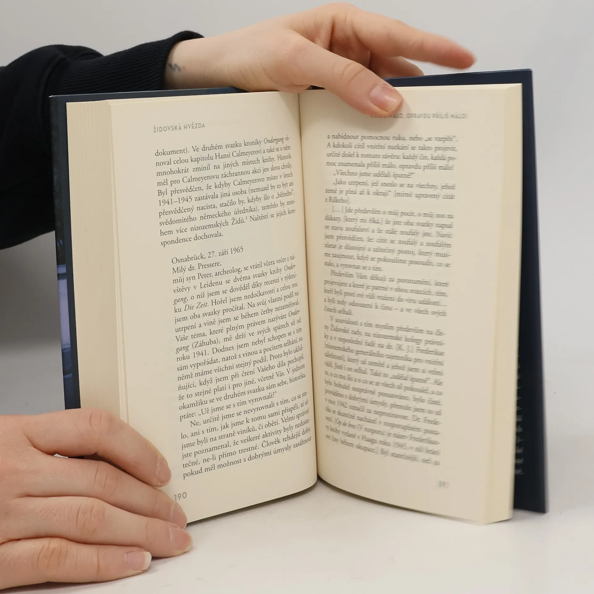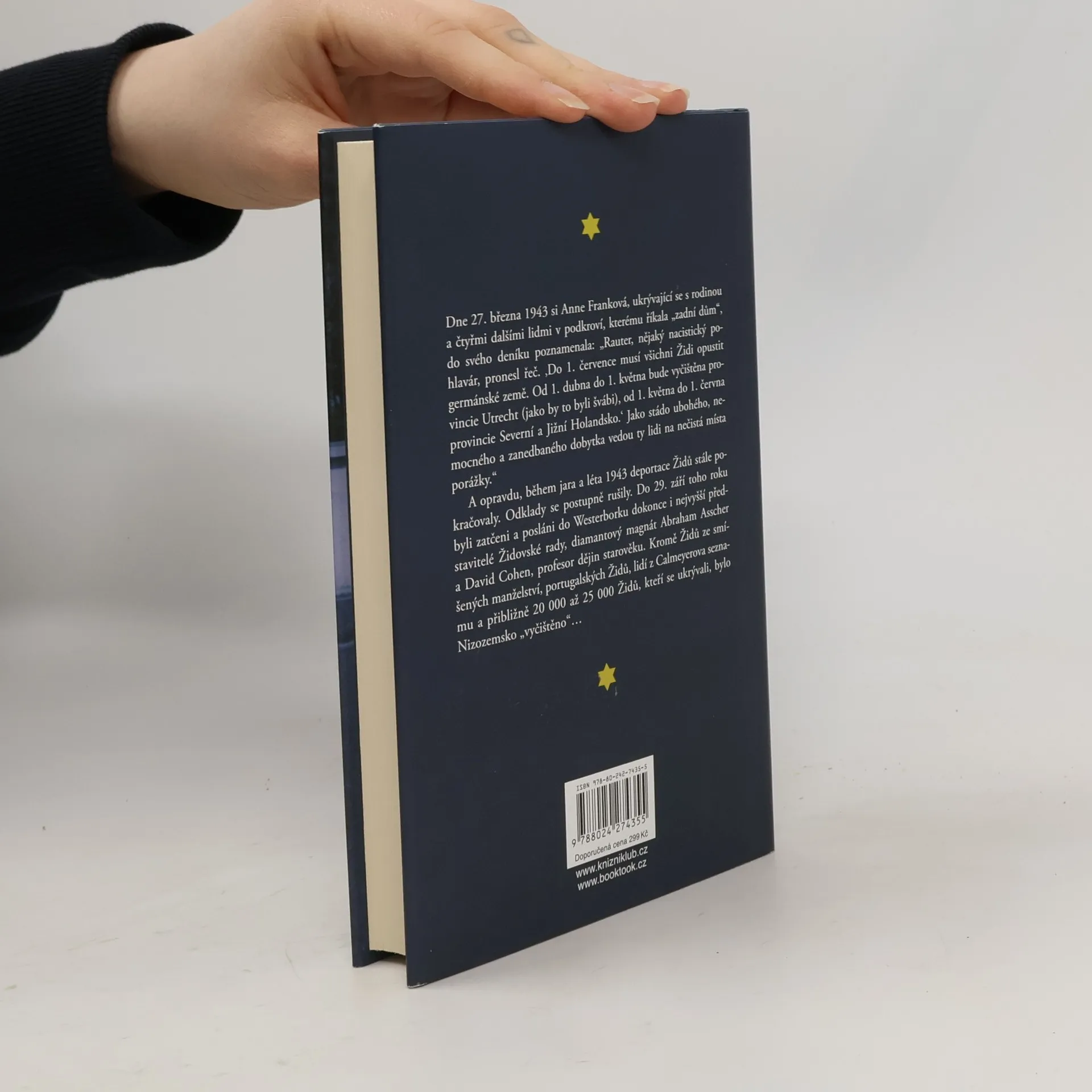 Příběh Hanse Calmeyera, který zachránil tisíce rodin, včetně té mé Za německé okupace Nizozemska v letech 1940 až 1945 bylo všem Židům nařízeno, aby se přihlásili k náboženství svých předků. Říšský komisař Arthur Seyss-Inquart najal mladého právníka Hanse Calmeyera, aby rozhodoval o „sporných případech“. Calmeyer si svůj úkol vyložil po svém a podařilo se mu před deportací a jistou smrtí zachránit nejméně 3700 lidí židovského původu. To je dvakrát více, než dokázal slavný Oskar Schindler. Autorka knihy Laureen Nussbaumová – rodným jménem Hannelore Kleinová – vděčí za svůj život právě tomuto statečnému německému úředníkovi. V knize Židovská hvězda vypráví příběh o tom, jak Calmeyer prohlásil její matku za Nežidovku, vyškrtl ji i její rodinu z deportačních seznamů a díky němu všichni válku přežili. Calmayerovy osudy se s příběhem autorčiny rodiny a jejího přítele, pozdějšího manžela Rudiho Nussbauma, proplétaly také v poválečném období a budeme je sledovat až do jejich smrti. V knize se také dočteme o Anně Frankové, k jejíž rodině měla autorčina rodina blízko. Židovská hvězda je mimořádným příběhem lidské odvahy a neústupnosti v nejtemnější hodině dějin člověka.