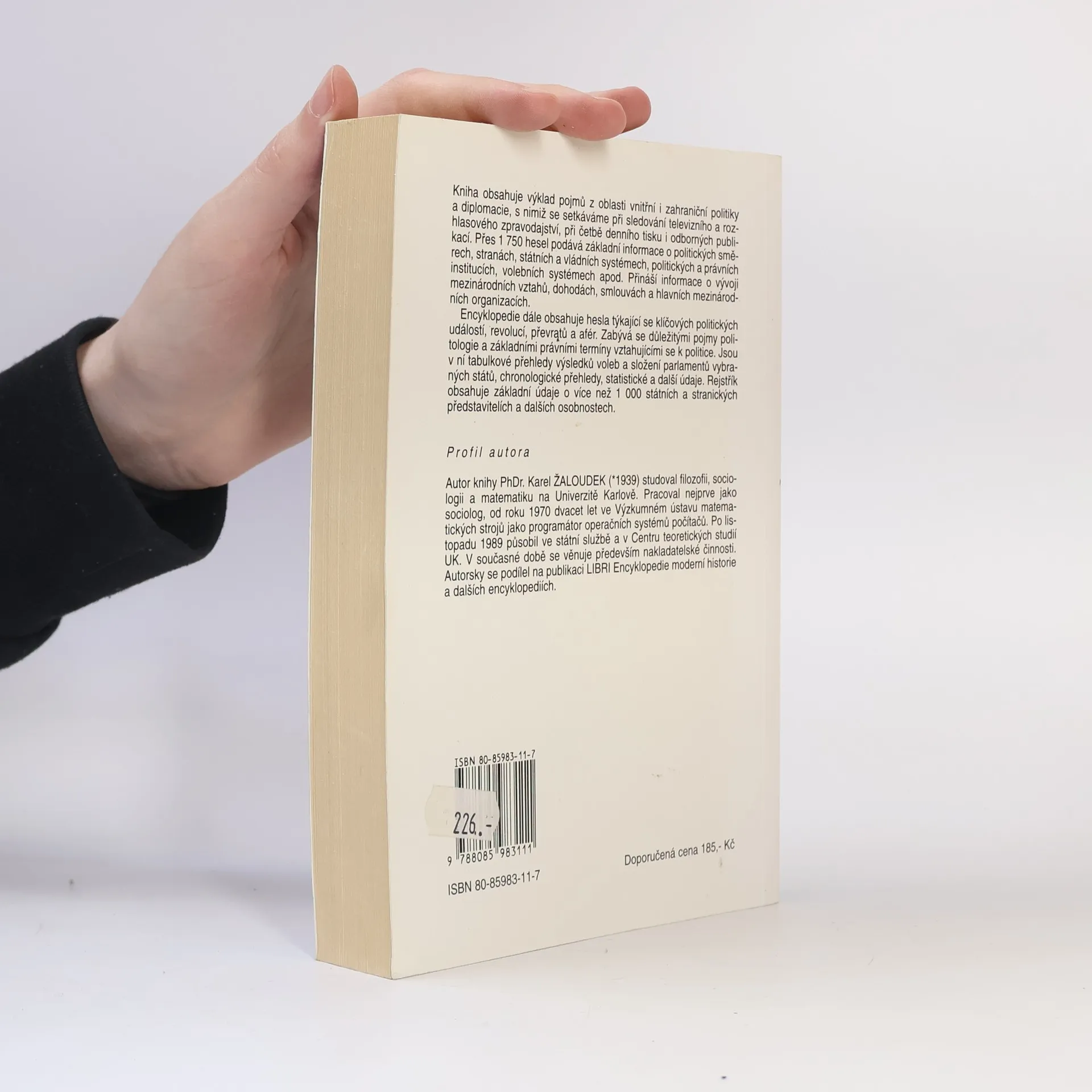 Kniha obsahuje výklad pojmů z oblasti vnitřní i zahraniční politiky a diplomacie, s nimiž se setkáváme při sledování televizního a rozhlasového zpravodajství, při četbě denního tisku i odborných publikací. Přes 1750 hesel podává základní informace o politických směrech, stranách, státních a vládních systémech, politických a právních institucích, volebních systémech apod. Přináší informace o vývoji mezinárodních vztahů, dohodách, smlouvách a hlavních mezinárodních organizacích. Rejstřík obsahuje základní údaje o více než 1000 státních a stranických představitelích a dalších osobnostech. První vydání.