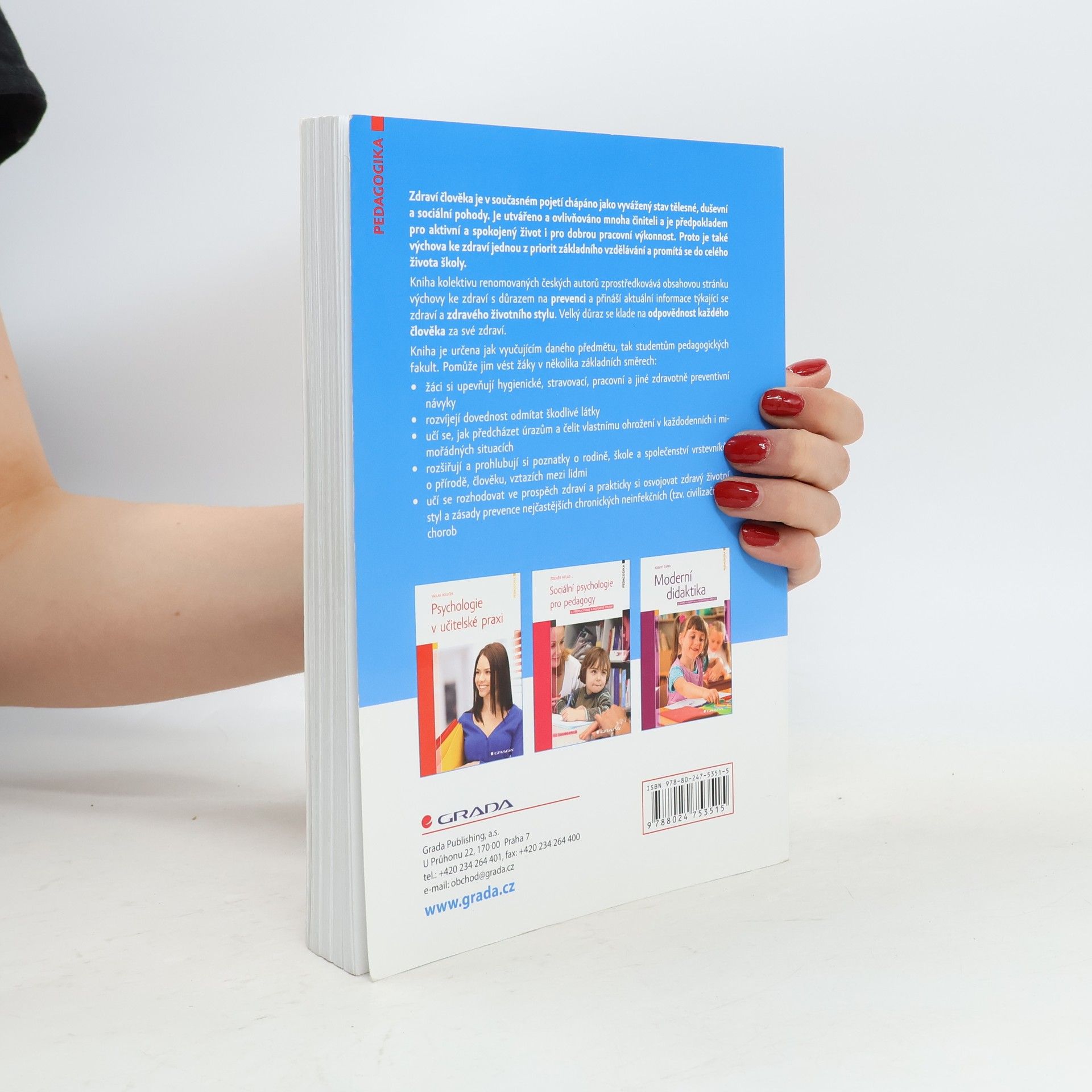 Zdraví člověka je v současném pojetí chápáno jako vyvážený stav tělesné, duševní a sociální pohody. Je utvářeno a ovlivňováno mnoha činiteli a je předpokladem pro aktivní a spokojený život i pro dobrou pracovní výkonnost. Proto je také výchova ke zdraví jednou z priorit základního vzdělávání a promítá se do celého života školy. Kniha kolektivu renomovaných českých autorů zprostředkovává obsahovou stránku výchovy ke zdraví s důrazem na prevenci a přináší aktuální informace týkající se zdraví a zdravého životního stylu. Velký důraz se klade na odpovědnost každého člověka za své zdraví. Kniha je určena jak vyučujícím daného předmětu, tak studentům pedagogických fakult. Pomůže jim vést žáky v několika základních směrech: • žáci si upevňují hygienické, stravovací, pracovní a jiné zdravotně preventivní návyky • rozvíjejí dovednost odmítat škodlivé látky • učí se, jak předcházet úrazům a čelit vlastnímu ohrožení v každodenních i mimořádných situacích • rozšiřují a prohlubují si poznatky o rodině, škole a společenství vrstevníků, o přírodě, člověku, vztazích mezi lidmi • učí se rozhodovat ve prospěch zdraví a prakticky si osvojovat zdravý životní styl a zásady prevence nejčastějších chronických neinfekčních (tzv. civilizačních) chorob