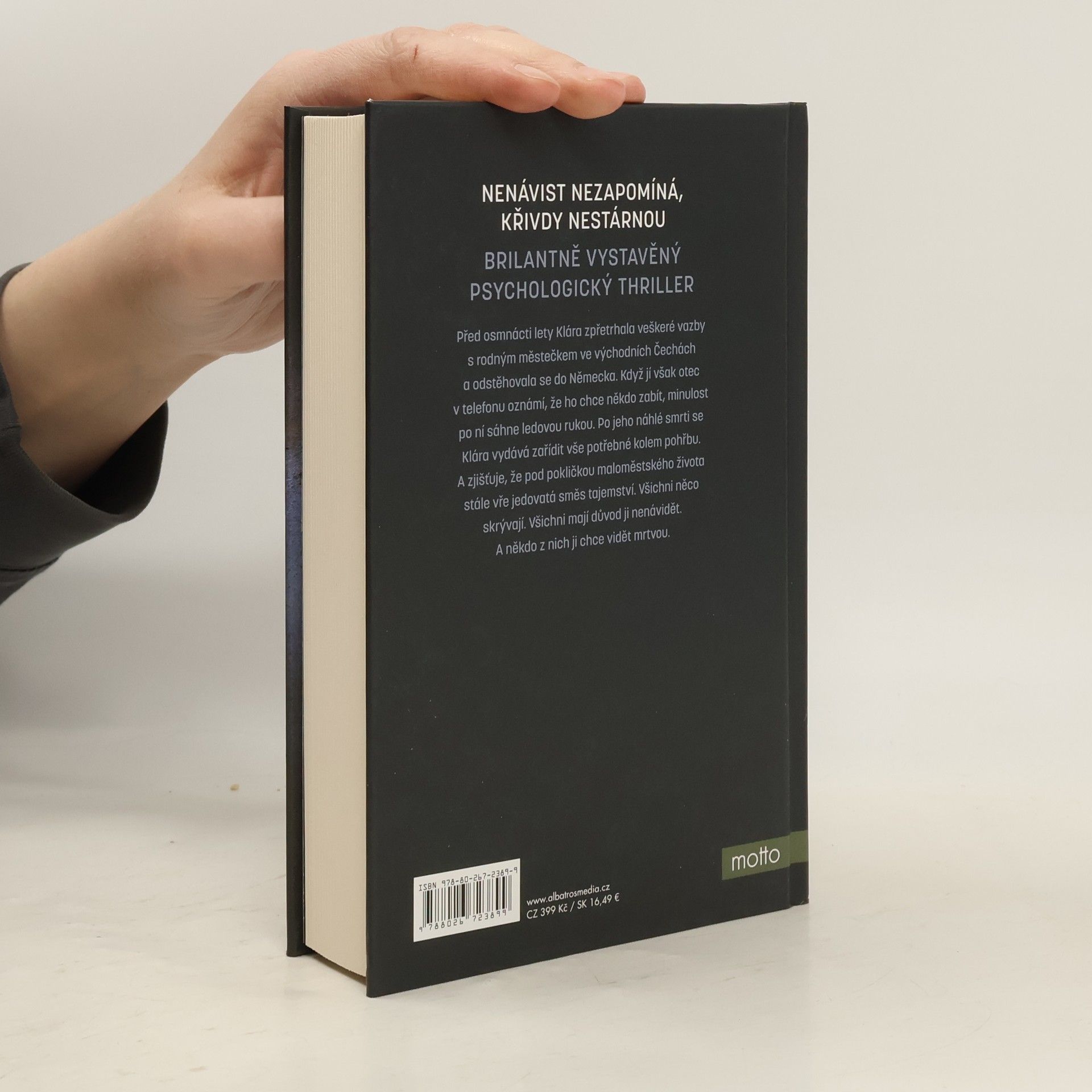 Nenávist nezapomíná, křivdy nestárnou. Brilantně vystavěný psychologický thriller. Před osmnácti lety se Klára rozhodla přetrhat všechny vazby s rodným městečkem ve východních Čechách a odjet do Německa. Teď žije a pracuje v Hamburku, kde má zdánlivě všechno, co může chtít: milujícího partnera, místo na univerzitě, přátele, byt v bohémské čtvrti St. Pauli… Když jí ale jedné horké srpnové noci zavolá otec, že ho chce někdo zabít, Klára má pocit, jako by se k ní nevyřešená minulost natáhla přes propast času, aby ji přivedla zpátky domů.Po otcově smrti se vydává zařídit záležitosti kolem pohřbu a dědictví do „díry u Pardubic“. Pod rouškou poklidného maloměstského života nic není takové, jak se na první pohled zdá. Všichni, mezi nimiž se Klára během prvních dnů po otcově smrti pohybuje, něco skrývají: její mladší sestra Ela, kamarádka z dětství Majda, partnerka Klářina bývalého přítele Tereza, otcova první žena Milada…Všechny mají svá tajemství. Všechny mají důvod Kláru nenávidět. A jedna z nich ji chce vidět mrtvou.