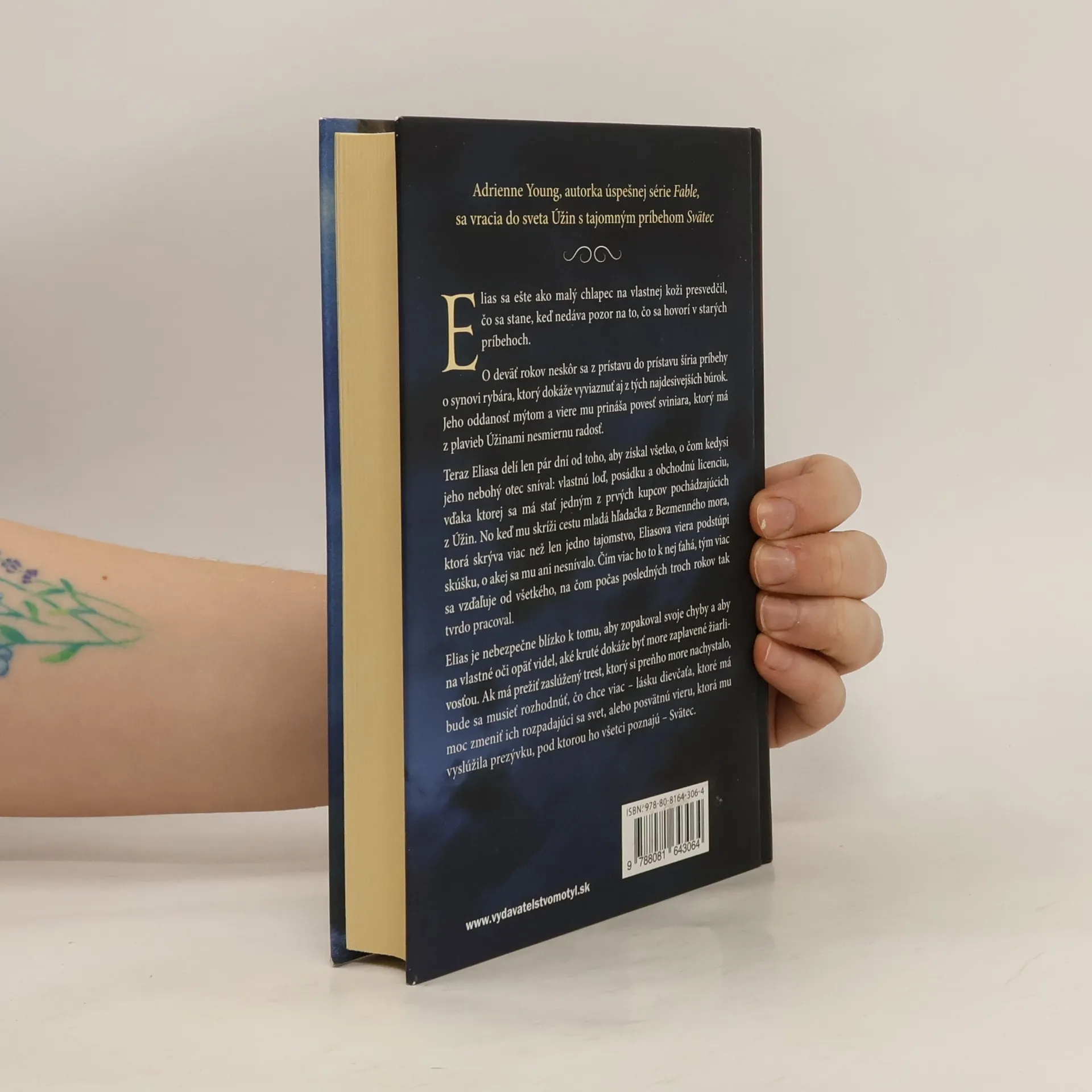 Adrienne Young, autorka úspešnej série Fable, sa vracia do sveta Úžin s tajomným príbehom SvätecElias sa ešte ako malý chlapec na vlastnej koži presvedčil, čo sa stane, keď nedáva pozor na to, čo sa hovorí v starých príbehoch.O deväť rokov neskôr sa z prístavu do prístavu šíria príbehy o synovi rybára, ktorý dokáže vyviaznuť aj z tých najdesivejších búrok, jeho oddanosť mýtom a viere mu prináša povesť sviniara, ktorý má z plavieb Úžinami nesmiernu radosť. Teraz Eliasa delí len pár dní od toho, aby získal všetko, o čom kedysi jeho nebohý otec sníval: vlastnú loď, posádku a obchodnú licenciu, vďaka ktorej sa má stať jedným z prvých kupcov pochádzajúcich z Úžin. No keď mu skríži cestu mladá hľadačka z Bezmenného mora, ktorá skrýva viac než len jedno tajomstvo, Eliasova viera podstúpi skúšku, o akej sa mu ani nesnívalo.Čím viac ho to k nej ťahá, tým viac sa vzďaľuje od všetkého, na čom počas posledných troch rokov tak tvrdo pracoval. Elias je nebezpečne blízko k tomu, aby zopakoval svoje chyby a aby na vlastné oči opäť videl, aké kruté dokáže byť more zaplavené žiarlivosťou.Ak má prežiť zaslúžený trest, ktorý si preňho more nachystalo, bude sa musieť rozhodnúť, čo chce viac – lásku dievčaťa, ktoré má moc zmeniť ich rozpadajúci sa svet, alebo posvätnú vieru, ktorá mu vyslúžila prezývku, pod ktorou ho všetci poznajú – Svätec.