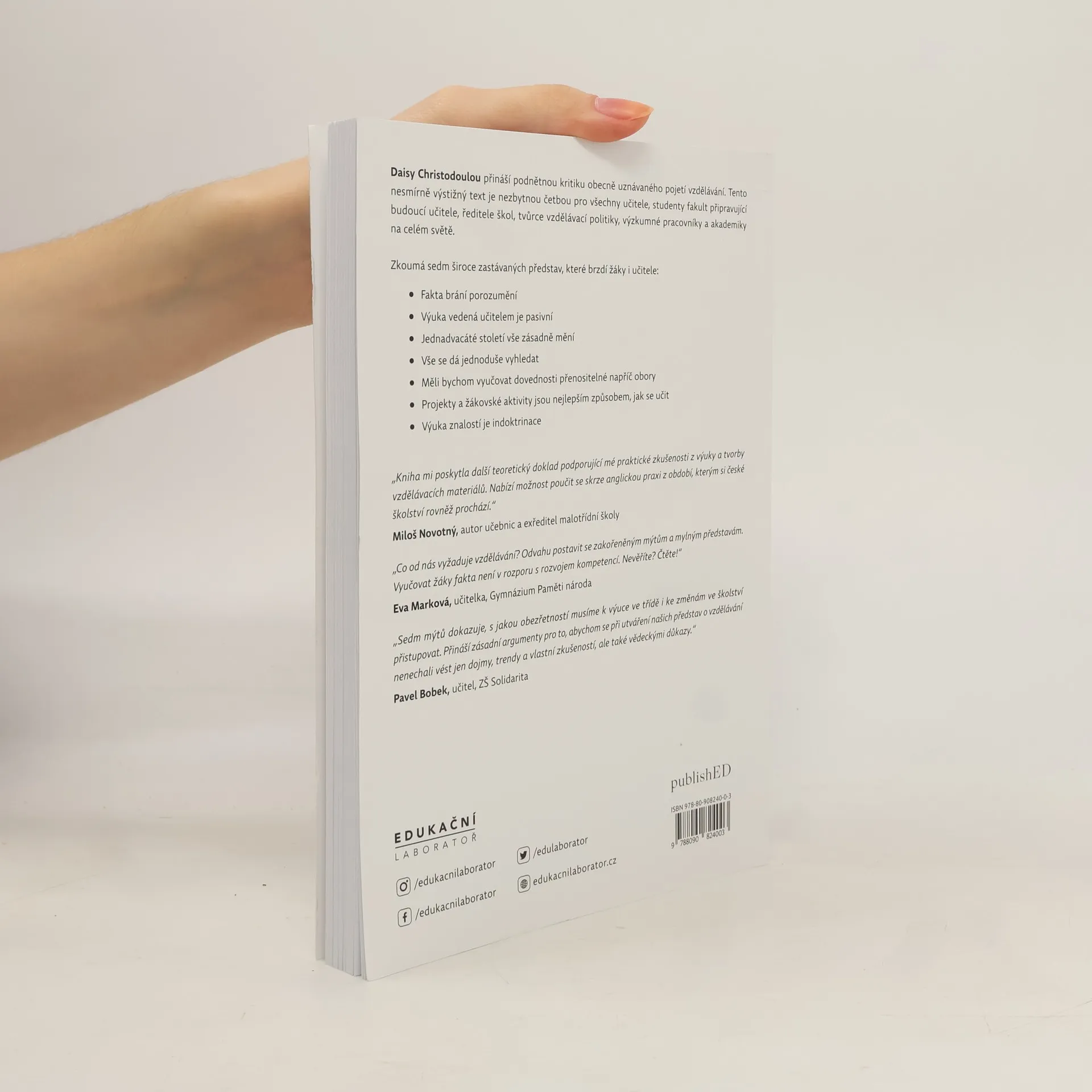 Zkoumá sedm široce zastávaných představ, které brzdí žáky i učitele:Fakta brání porozuměníVýuka vedená učitelem je pasivníJednadvacáté století vše zásadně měníVše se dá jednoduše vyhledatMěli bychom vyučovat dovednosti přenositelné napříč oboryProjekty a žákovské aktivity jsou nejlepším způsobem, jak se učitVýuka znalostí je indoktrinaceV každé kapitole Christodoulou srozumitelně předkládá teorii jednotlivých mýtů, zvažuje jejich praktické dopady a poukazuje na znepokojivé rozšíření takového přístupu. Poté s odkazem na aktuální poznatky kognitivních věd přesně vysvětluje, proč se jedná o mýtus. Autorka prezentuje přesvědčivé argumenty vysvětlující, jak vládní resorty a vzdělávací organizace na celém světě zklamaly učitele a žáky tím, že prosazují, ba dokonce nařizují špatnou praxi a teorii bez důkazů.Tento nesmírně výstižný text je nezbytnou četbou pro všechny učitele, studenty fakult připravující budoucí učitele, ředitele škol, tvůrce vzdělávací politiky, výzkumné pracovníky a akademiky na celém světě.