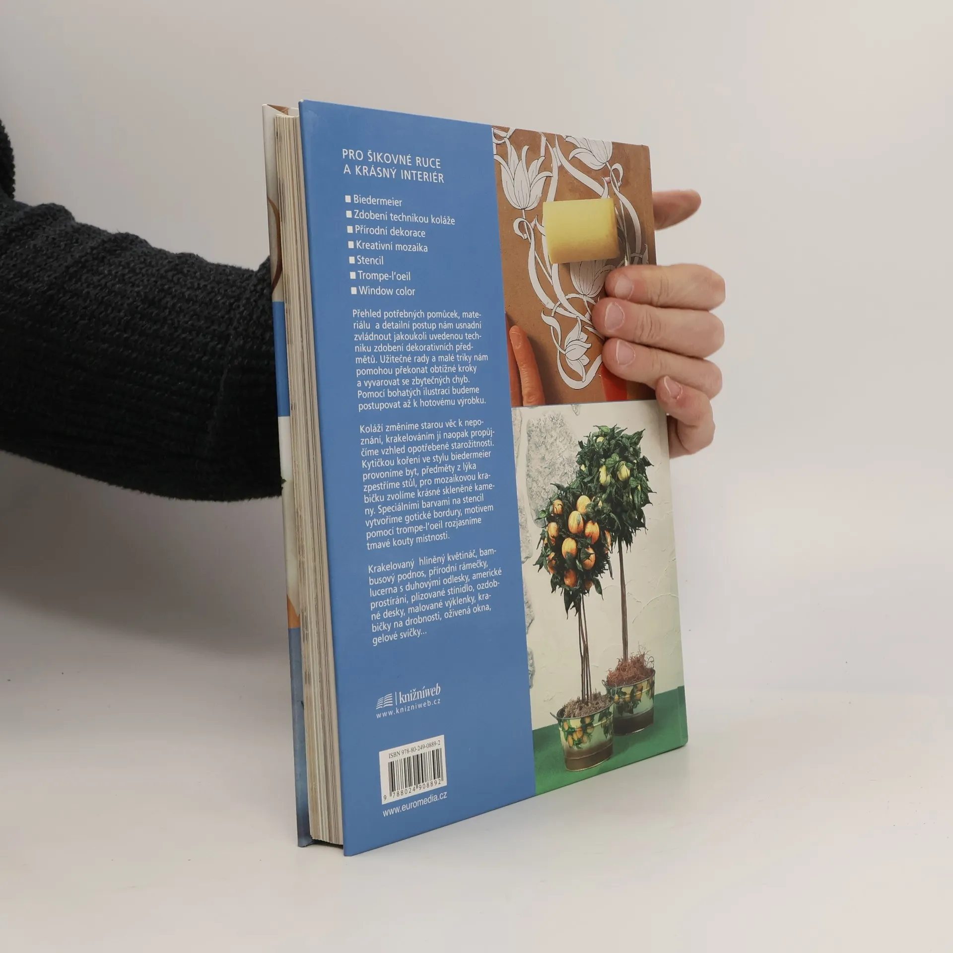 Kniha určená všem, kteří si chtějí vylepšit interiér, mají fantazii a šikovné ruce. Přehled potřebných pomůcek, materiálu a detailní postup usnadní zvládnout moderní techniky zdobení dekorativních předmětů. Koláží změníme starou věc k nepoznání, krakelováním jí naopak propůjčíme vzhled opotřebené starožitnosti. Kytičkou koření ve stylu biedermeier provoníme byt, předměty z lýka zpestříme stůl, pro mozaikovou krabičku zvolíme krásné skleněné kameny.
