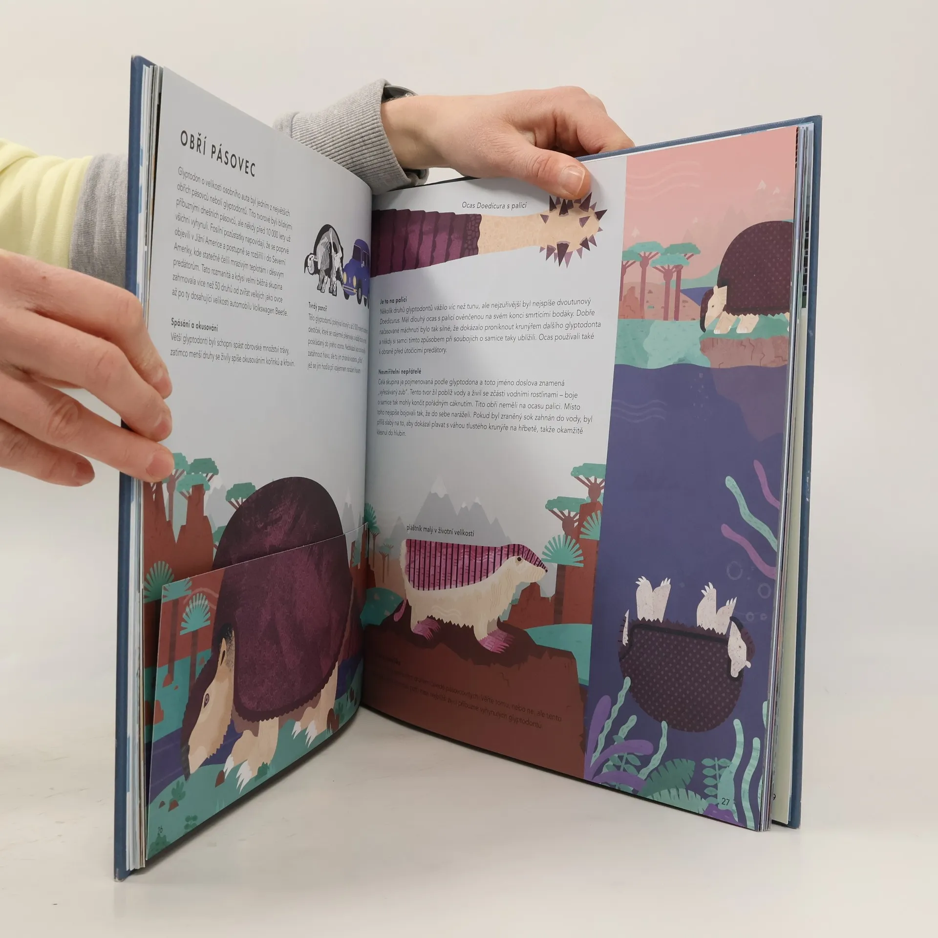 Fascinující výprava do doby ledové. Vydejte se na cestu po jednotlivých kontinentech pravěké Země a tváří v tvář se setkejte s podivnými, úžasnými a obřími tvory doby ledové. Objevte lenochody velké jako žirafy, pásovce velikosti auta a bobry převyšující medvědy. Seznamte se také s našimi prvními předky. Na rozkládacích stranách, kterých je kniha plná, prozkoumejte dobu ledovou do nejmenších detailů!