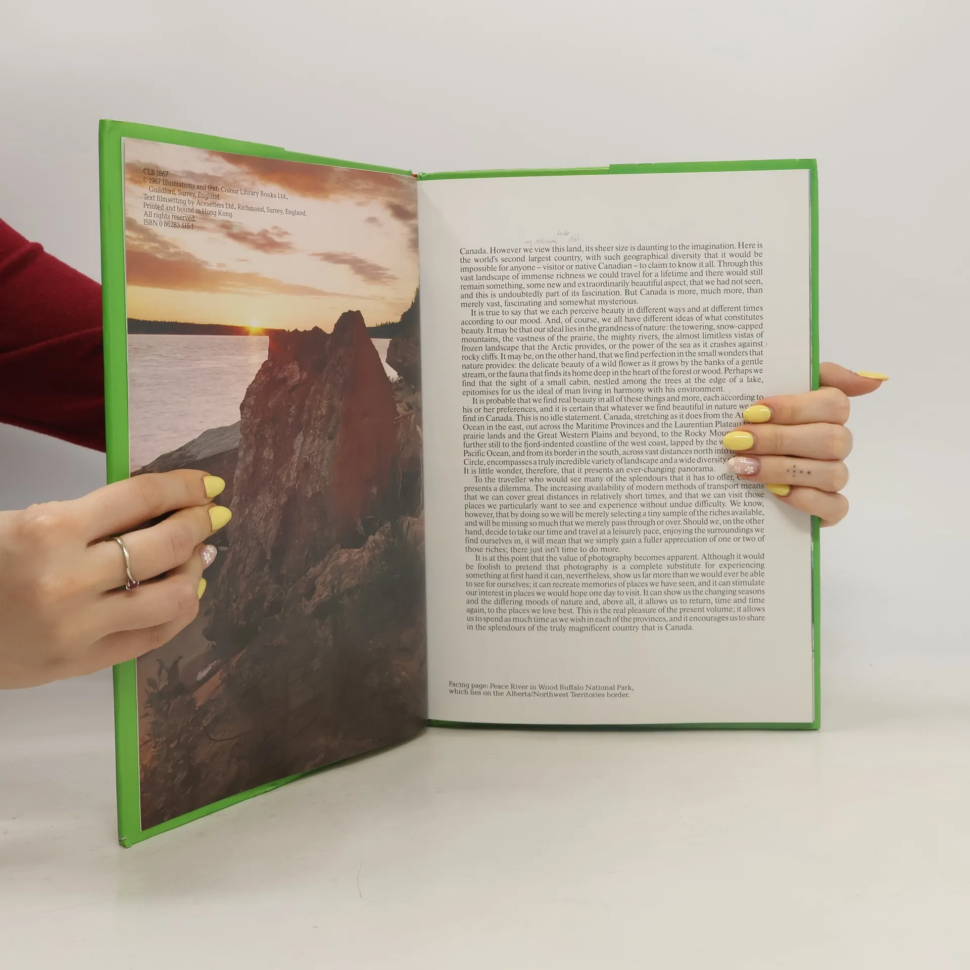 From the inside dust jacket "The Trans-Canada Highway runs from St. John's in Newfoundland to Vancouver in British Columbia. It was opened in September 1962, and the distance covered by the traveller taking this route is some 4,860 miles - an indication of the vast size of this great country. It is the second largest country in the world, only the U.S.S.R. is greater in area. In spite of its great size, Canada has a population of less than 20 million and this means that, outside the cities and towns, there are huge areas of open country. Here are to be found prairies that stretch as far as the eye can see, mountain ranges, lakes and rivers and forests of red cedar, Douglas fir and redwood. Canada is a land of the great outdoors and as such is unsurpassableThe extent of the country means that there is a great diversity in climate, and this in turn means that almost any outdoor pursuit may be enjoyed. The pictures in this book typify the many and varied aspects of this beautiful country and they have been chosen with great care, in the hope that they will provide the reader with many hours of pleasure. A total of 225 full-colour photographs.