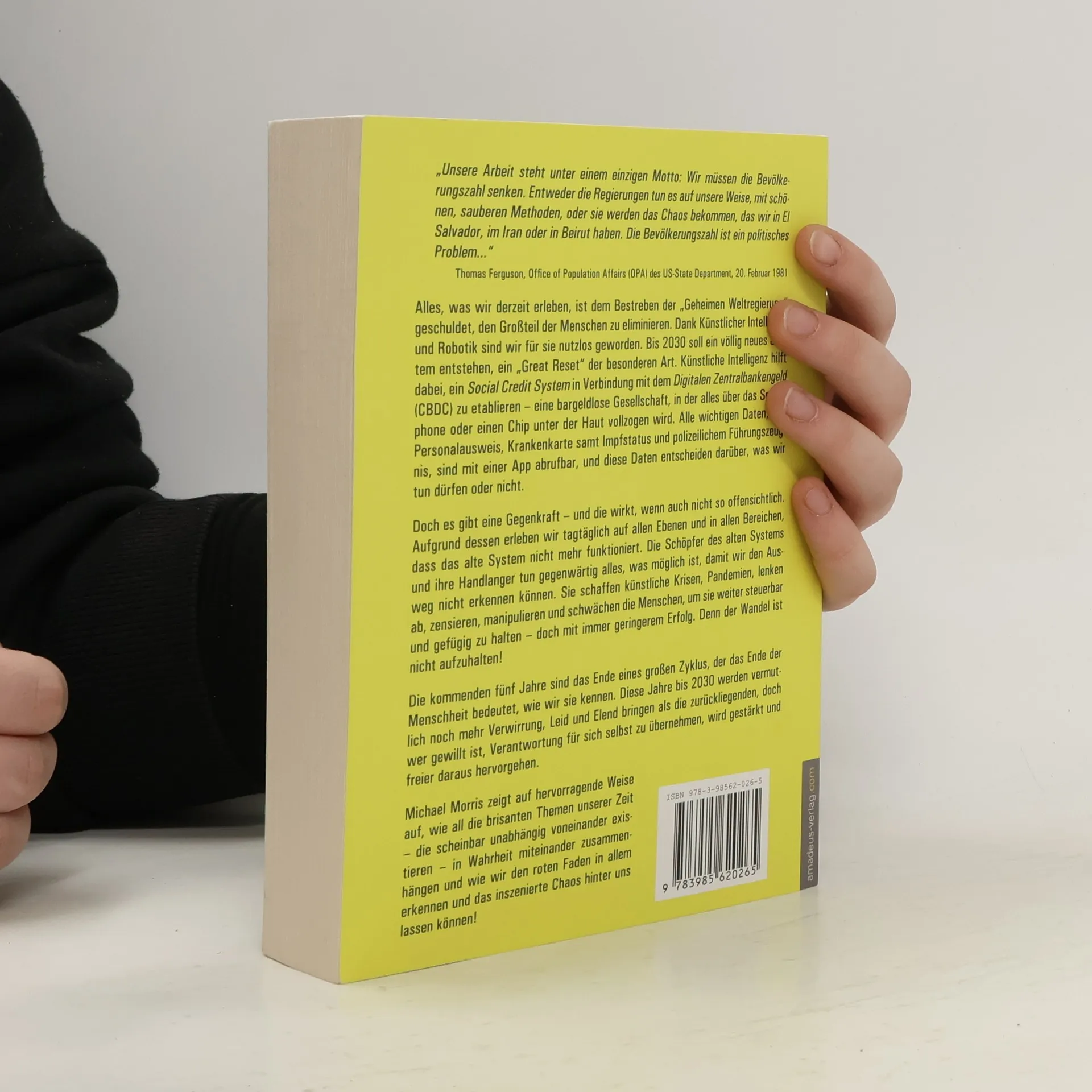 Die zentrale These des Buches ist die dringende Notwendigkeit, die Bevölkerungszahl zu reduzieren, um politische und soziale Stabilität zu gewährleisten. Thomas Ferguson, ein Beamter des US-State Departments, argumentiert, dass Regierungen entweder durch humane Methoden handeln oder mit chaotischen Zuständen konfrontiert werden, wie sie in Ländern wie El Salvador, Iran oder Beirut beobachtet werden können. Das Werk beleuchtet die politischen Implikationen der Bevölkerungsentwicklung und fordert ein Umdenken in der Bevölkerungspolitik.