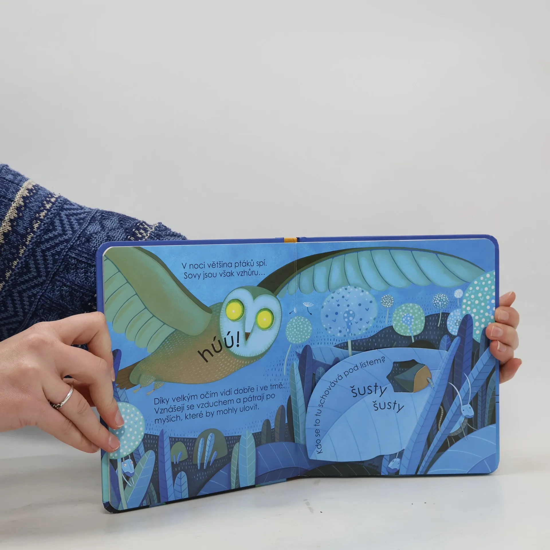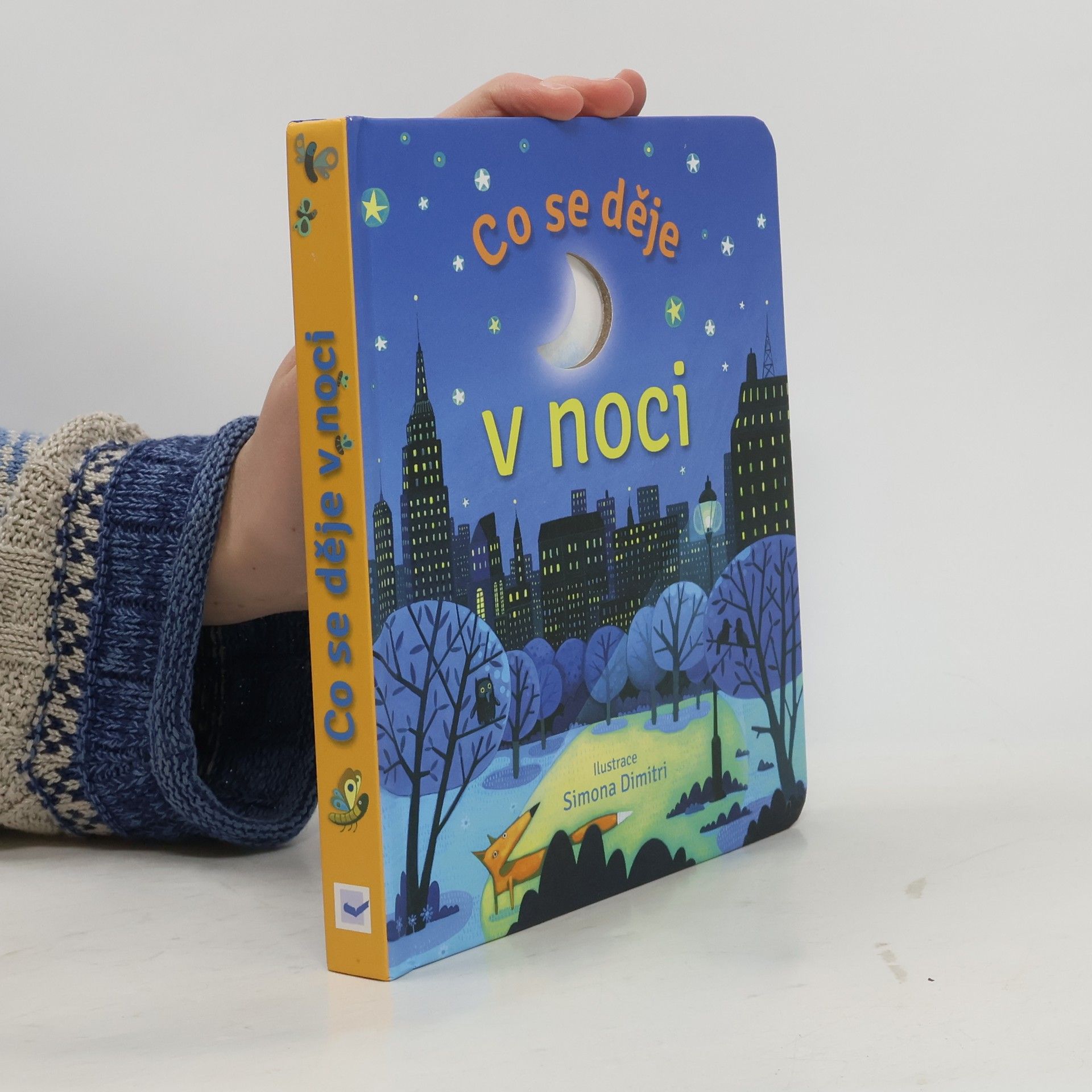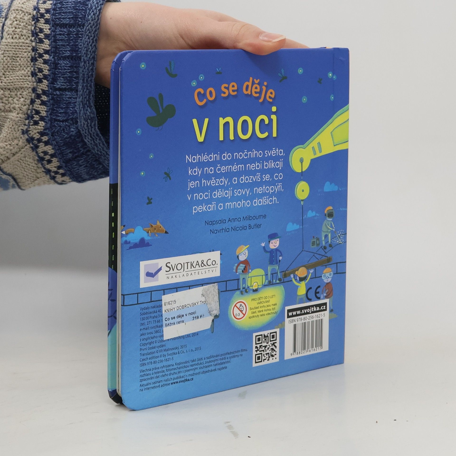 V noci, když vyjde měsíc a zatřpytí se hvězdy, rozhostí se v ulicích klid. Už všichni spí? Copak se to děje v pekárně? Kdo to tu visí hlavou dolů? Kdo se tu schovává pod listem? Kdo se v noci vydává na průzkum? Co všechno se děje v noci? S touto krásně ilustrovanou knížkou můžeš nahlédnout do nočního světa, kdy na černém nebi blikají jen hvězdy. Tak honem, zalistuj v knížce, odklop všechna okénka a podívej se pod ně. Dozvíš se, co v noci dělají sovy, netopýři, pekaři a mnoho dalších.