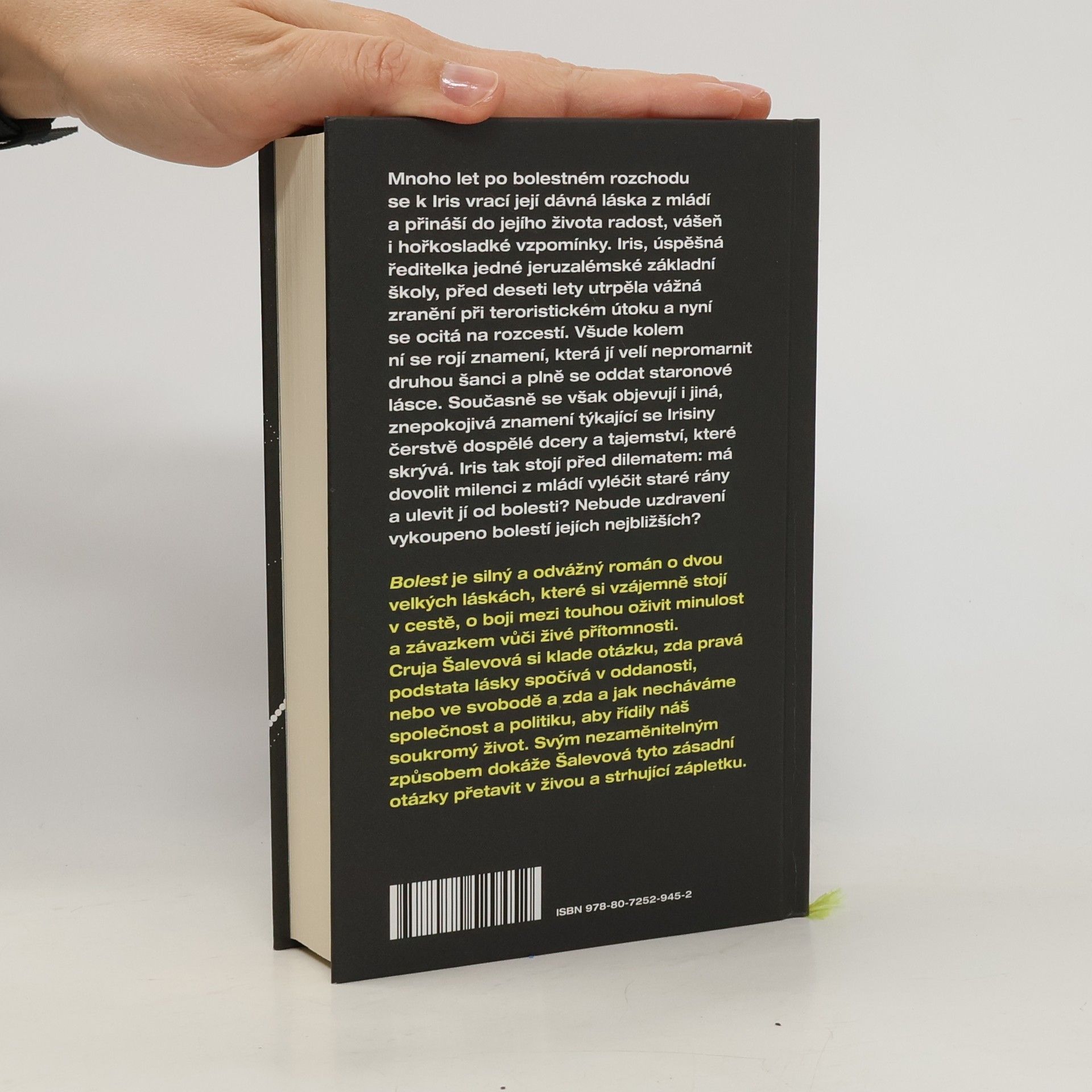 Silný a odvážný román o dvou velkých láskách, které si vzájemně stojí v cestě Mnoho let po bolestném rozchodu se k Iris vrací její dávná láska z mládí a přináší do jejího života radost, vášeň i hořkosladké vzpomínky. Iris, úspěšná ředitelka jedné jeruzalémské základní školy, která před deseti lety utrpěla vážná zranění při teroristickém útoku, se ocitá na rozcestí. Má dovolit milenci z mládí vyléčit staré rány a ulevit jí od bolesti? Nebude uzdravení vykoupeno bolestí jejích nejbližších? Bolest je silný a odvážný román o dvou velkých láskách, které si vzájemně stojí v cestě, o boji mezi touhou oživit minulost a závazkem vůči živé přítomnosti. Cruja Šalevová si klade otázku, zda pravá podstata lásky spočívá v oddanosti nebo ve svobodě a zda a jak necháváme společnost a politiku, aby řídila náš soukromý život. Svým nezaměnitelným způsobem dokáže Šalevová tyto zásadní otázky přetavit v živou a strhující zápletku.