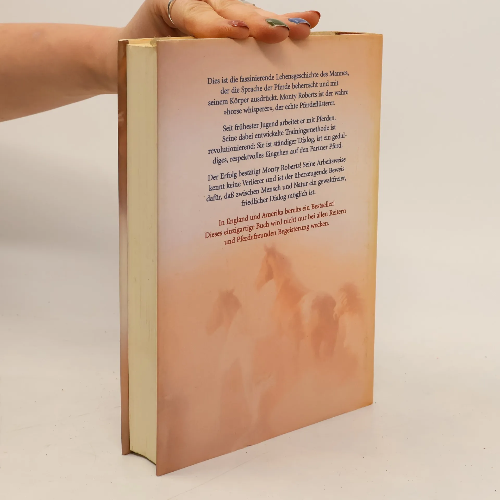 Dies ist die faszinierende Lebensgeschichte des Mannes, der die Sprache der Pferde beherrscht und mit seinem Körper ausdrückt. Monty Roberts ist der wahre »horse whisperer«, der echte Pferdeflüsterer. Seit frühester Jugend arbeitet er mit Pferden. Seine dabei entwickelte Trainingsmethode ist revolutionierend: Sie ist ständiger Dialog, ist ein geduldiges, respektvolles Eingehen auf den Partner Pferd. Der Erfolg bestätigt Monty Roberts! Seine Arbeitsweise kennt keine Verlierer und ist der überzeugende Beweis dafür, daß zwischen Mensch und Natur ein gewaltfreier, friedlicher Dialog möglich ist. In England und Amerika bereits ein Bestseller! Dieses einzigartige Buch wird nicht nur bei allen Reitern und Pferdefreunden Begeisterung wecken.