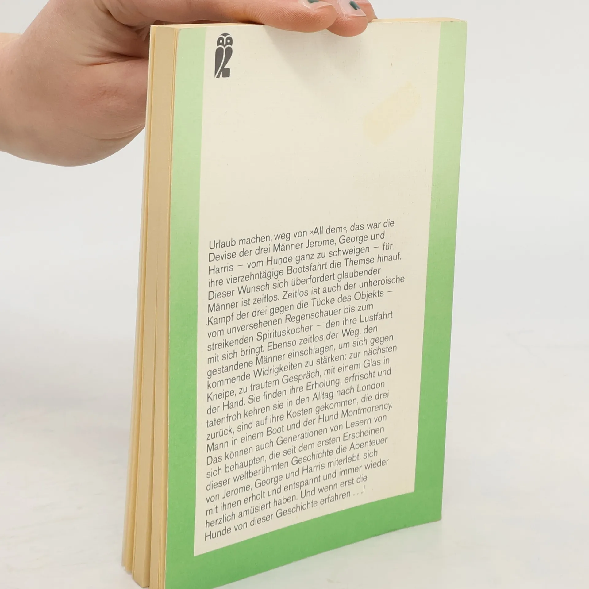 Mit seiner Schilderung einer vertrackten Bootsfahrt auf der Themse schuf Jerome K. Jerome 1889 einen der beliebtesten Klassiker britischen Humors. Sein scharfer, wenn auch wohlwollender Blick entlarvt die Tücken einer Freizeitkultur, die sich bis heute großer Beliebtheit erfreut. Eine Bootsfahrt auf der Themse – zu Zeiten von Königin Viktoria der Inbegriff des Ferienglücks. Die drei Freunde George, Harris und J. rudern auf der Suche nach Natur und Erholung zwölf Tage lang flussaufwärts: von Kingston nach Maidenhead, Marlow, Dorchester, Reading und Oxford – und geraten von einer Panne zur nächsten. Gemeinsam mit Hund Montgomery kämpfen sie einen sympathischen, wenn auch hoffnungslosen Kampf gegen die Tücken des Bootes. Ein Sturz ins kalte Wasser bringt sie nicht aus der Fassung, und auch alle übrigen Missgeschicke, trocken serviert von Erzähler J., wissen sie mit Stil und Witz zu ertragen. Die Gentlemen trösten sich mit der reizvollen Atmosphäre der Themsestädtchen (und in deren Kneipen), bis der Regen sie vorzeitig in die Zivilisation Londons zurücktreibt. Jerome K. Jerome (1859–1927) sah sich als Humorist, der sowohl für die Unzulänglichkeiten des Daseins als auch für Kritik an den Zeitumständen zuständig war. In Deutschland erlangte sein Werk in den sechziger Jahren große Popularität, als die Bootsfahrt mit Heinz Erhardt, Walter Giller und Hans-Joachim Kulenkampff verfilmt wurde.