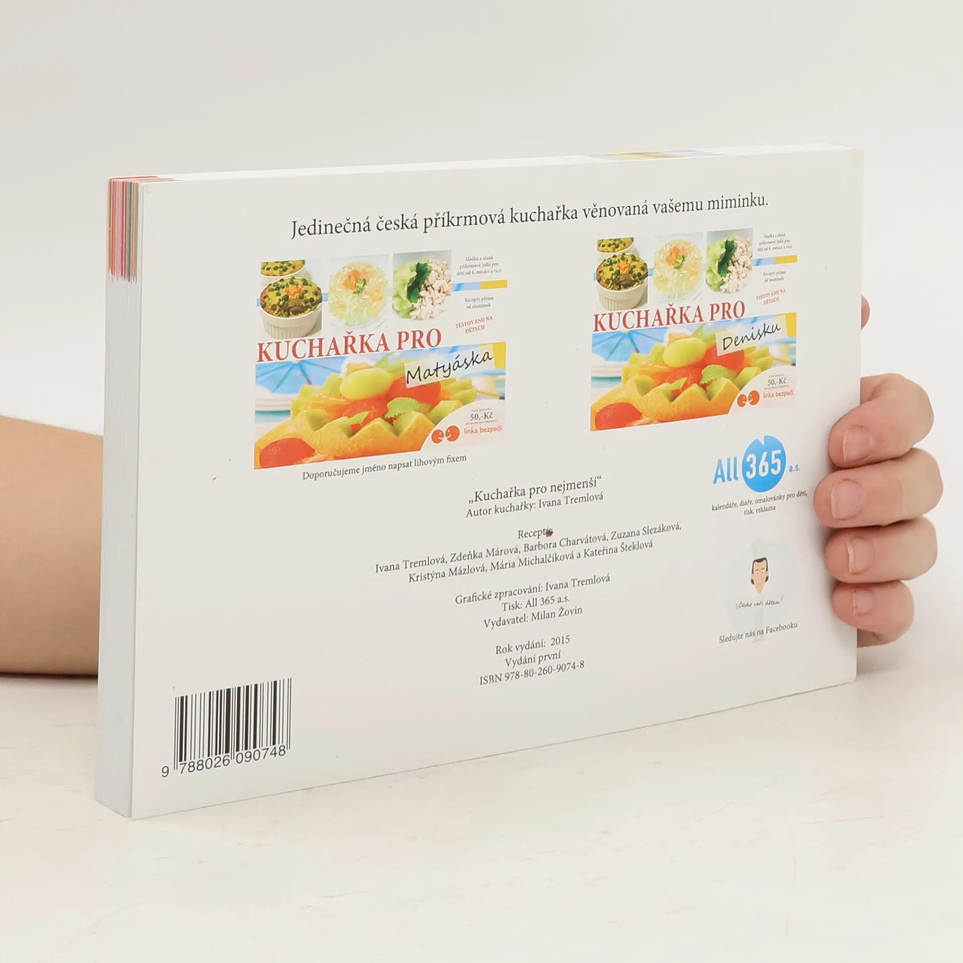 Tato kuchařka vznikla na základě spolupráce několika maminek, které zde ukazují, jak jednoduché a zároveň inspirativní může být vaření receptů pro ty nejmenší od ukončeného 4. měsíce. Kuchařka obsahuje 99+1 bonusový recept příkrmových jídel od 4 měsíce, kde začínáme kašičkami až do 2 let dítěte. Kniha je rozdělená věkově dle měsíců i barvami pro snadné vyhledávání. Veškeré recepty uvedené v kuchařce a jejich věkové zařazení je pouze orientační. Je vždy na zvážení každé maminky, kdy svému dítku to či ono příkrmové jídlo uvaří. Jedinečnost této kuchařky je v možnosti umístění vlastní fotografie na titulní stránku včetně věnování konkrétnímu miminku. Navíc zakupením podporujete Linku bezpečí v hodnotě 50,-Kč z ceny. Ta řeší dětskou problematiku každý den a pomáhá tak velkému množství dětí v celé naší republice. Navíc je tato kuchařka podpořená i on-line projektem o vaření na sociální síti Facebook pod názvem "Česko vaří Dětem.