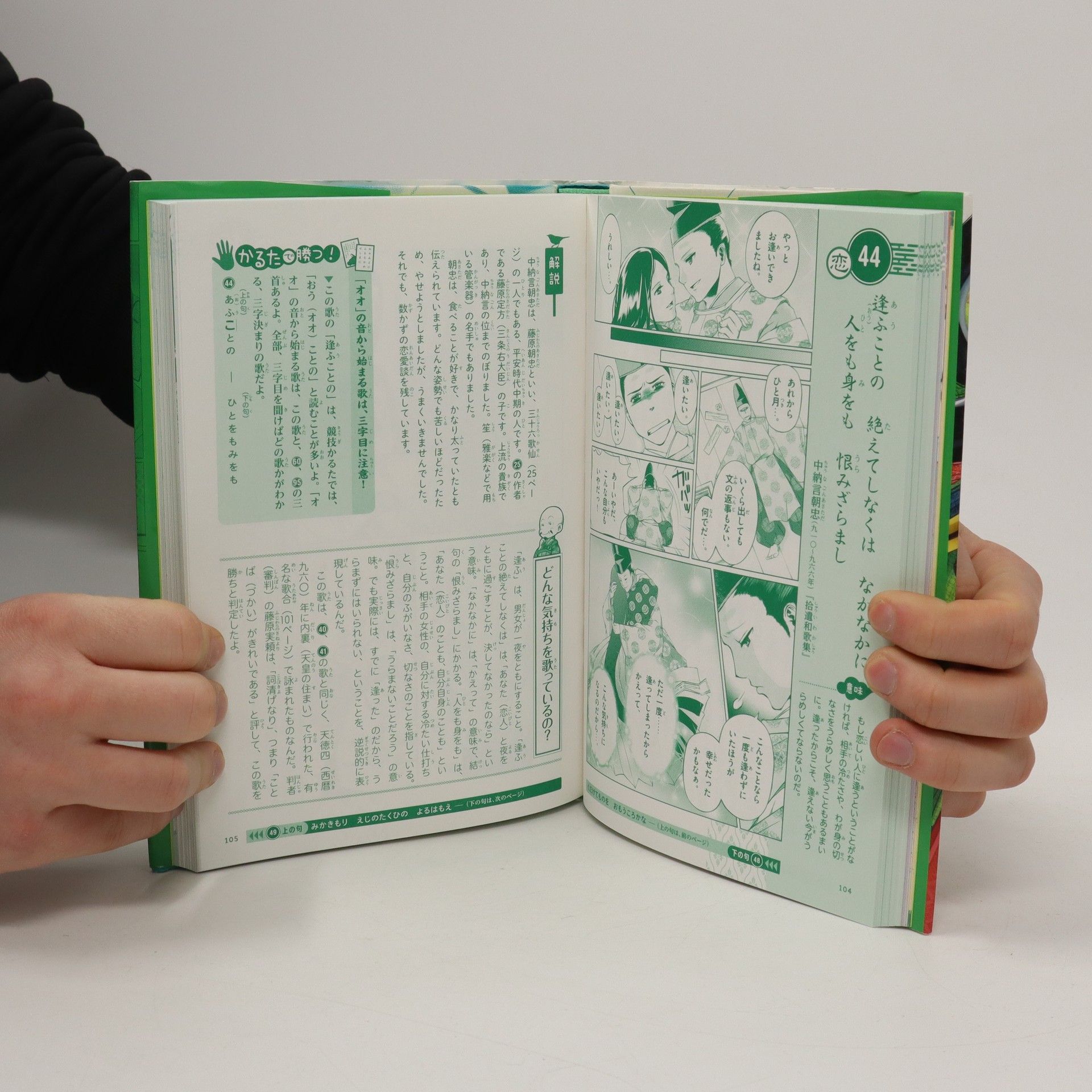 和歌の意味や成り立ちを、まんがでわかりやすく説明。歌がよまれた当時の恋愛スタイルや年中行事など古典常識を解説したコラムもあり、初めて百人一首に触れる人でも楽しく内容を理解することができる。歌の覚え方のコツや遊び方、競技かるたのルールも紹介。
