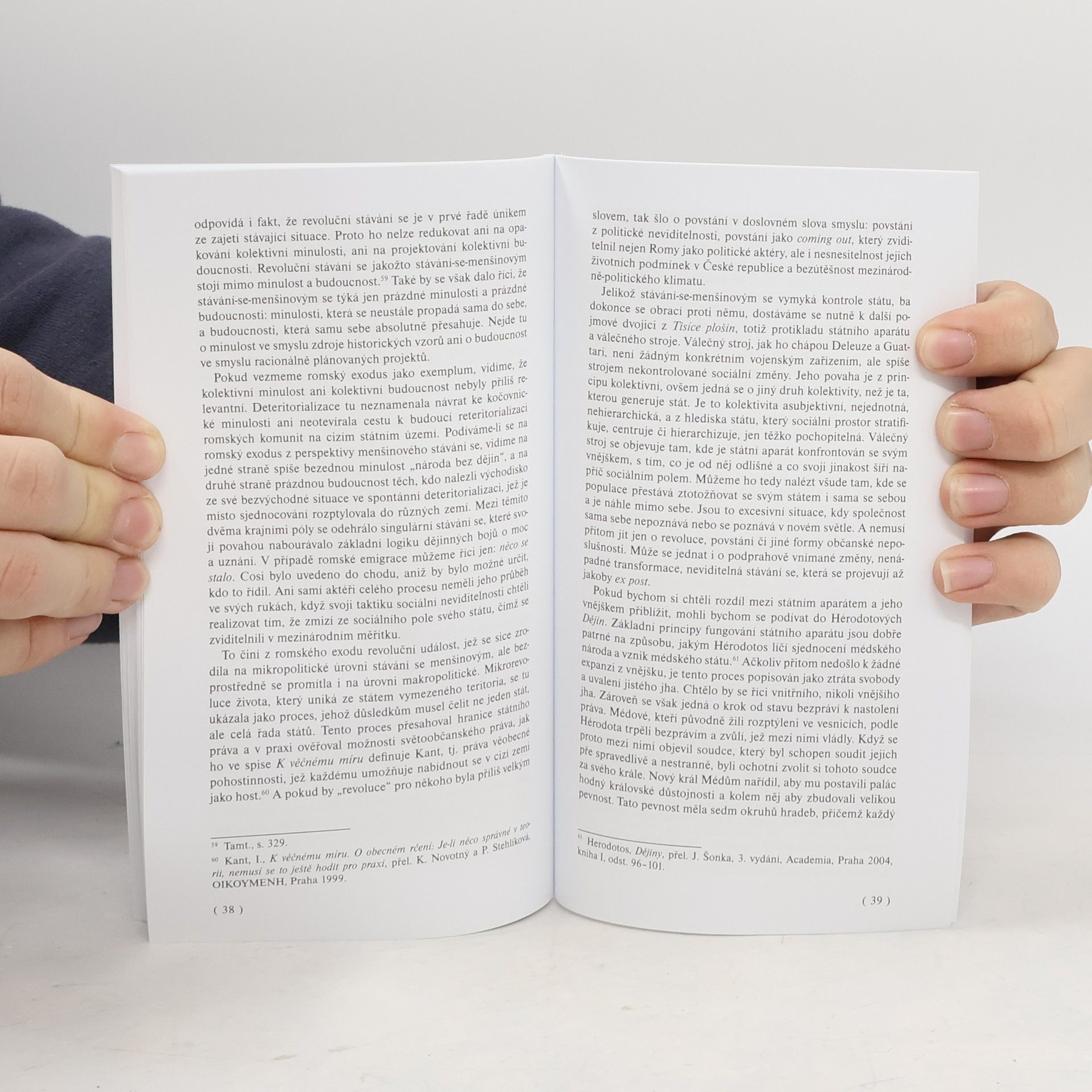 Kniha pojednává o romské emigraci z České republiky v letech 1997–2004, k čemuž využívá pojmové instrumenty moderní politické filosofie. Na pozadí situace Romů ve střední Evropě je tu zkoumána problematika hromadné emigrace, která svým charakterem odhaluje limity moderní politické filosofie a nutí k její kritické revizi.