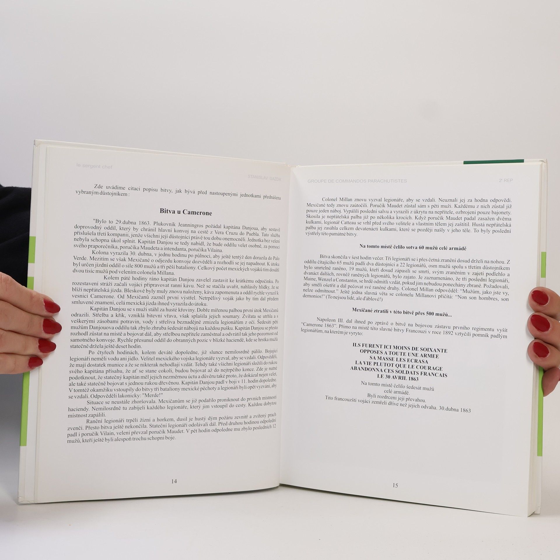 Shrnutí vývoje Cizinecké legie doplňují vzpomínky českého občana, který v těchto jednotkách francouzské armády sloužil patnáct let. Rekapitulace vzniku Cizinecké legie, bojových nasazení od roku 1831 v Alžírsku přes válečné operace v Mexiku, válku s Pruskem, první a druhou světovou válku, Indočínu po "bitvu o Alžír". Dějinný výklad doplňuje přehled symbolů Cizinecké legie. Hlavní pozornost však autor samozřejmě věnuje líčení osobních zážitků z výcviku, bojového nasazení v Sarajevu, Mostaru, Středoafrické republice, Čadu, Kosovu, Gabonu a Makedonii.