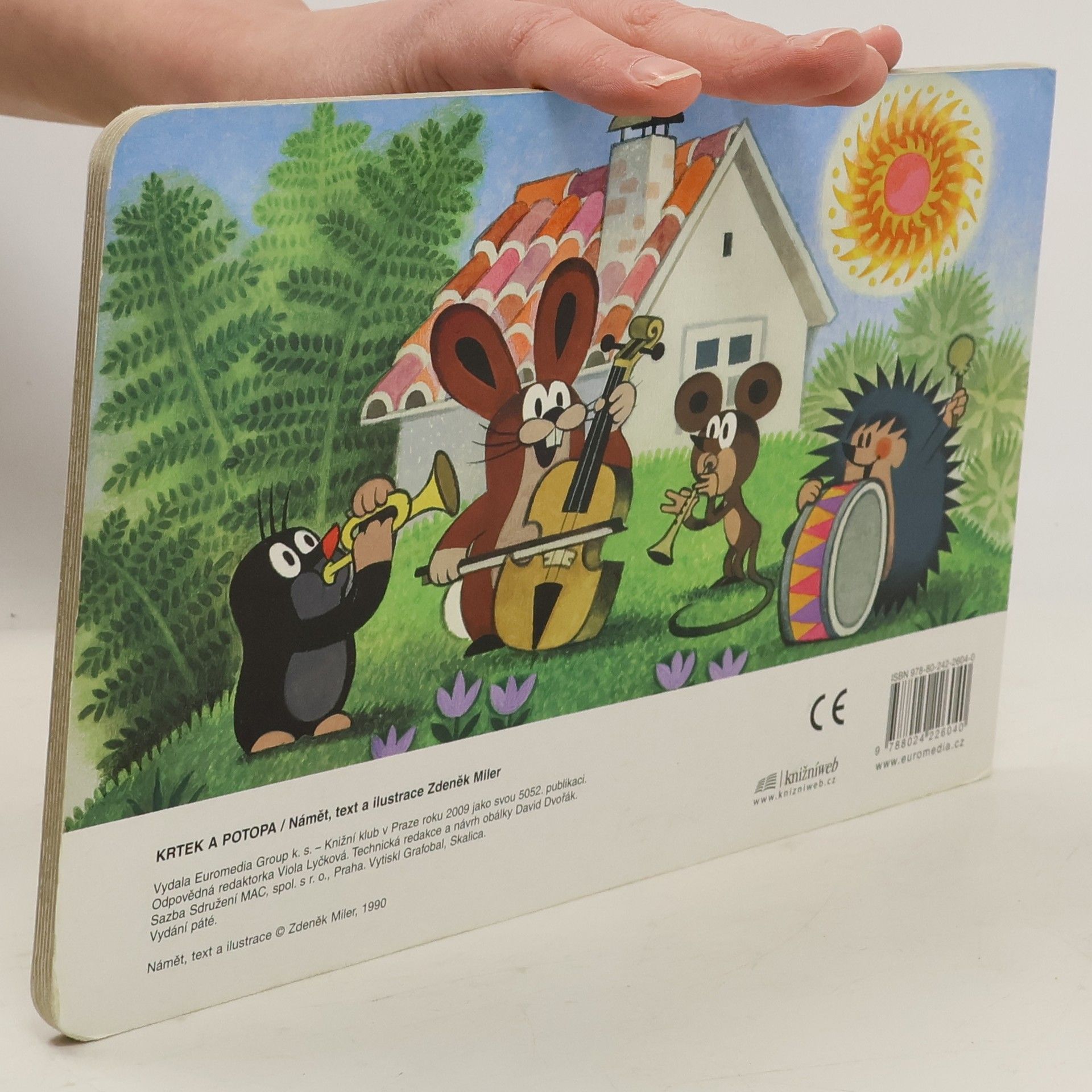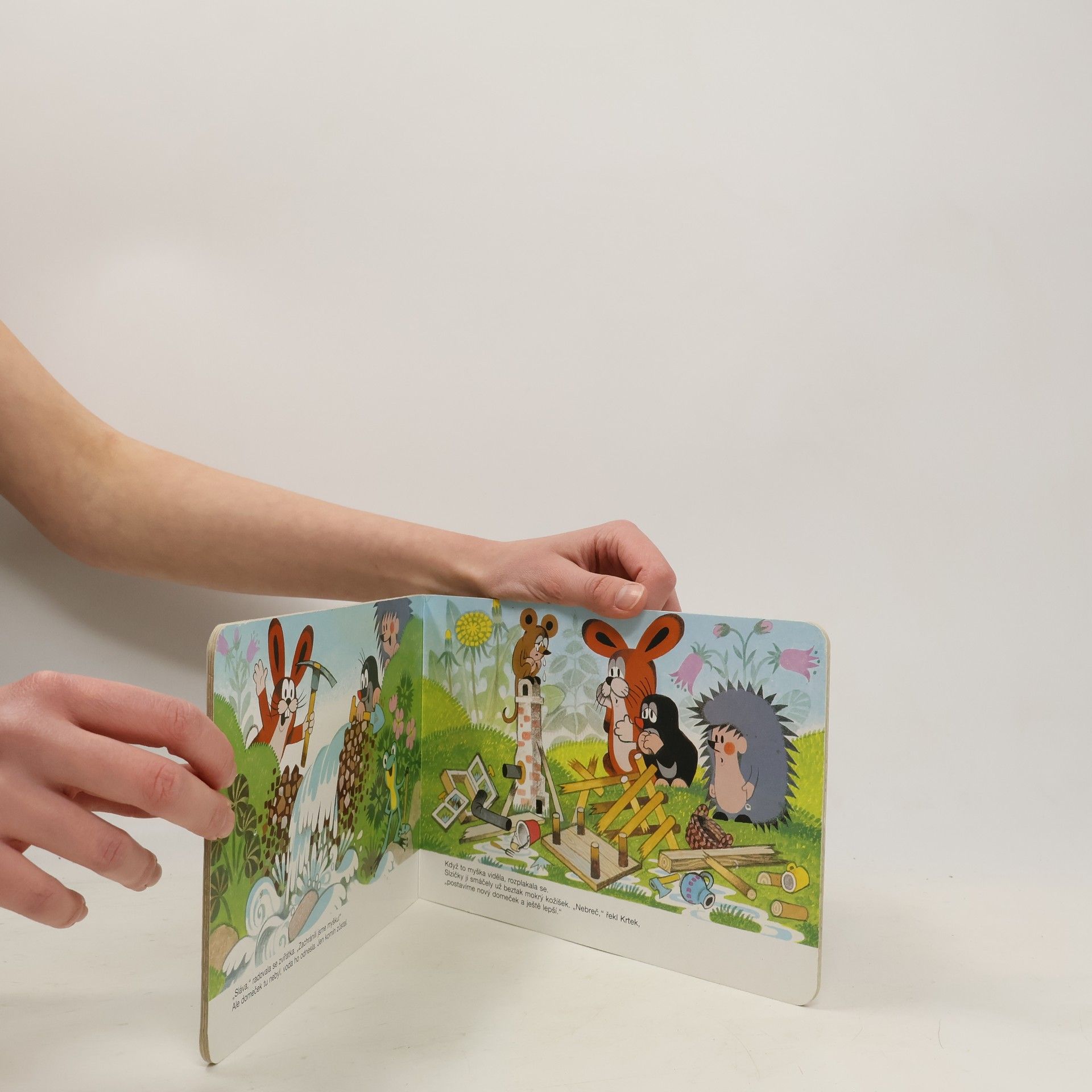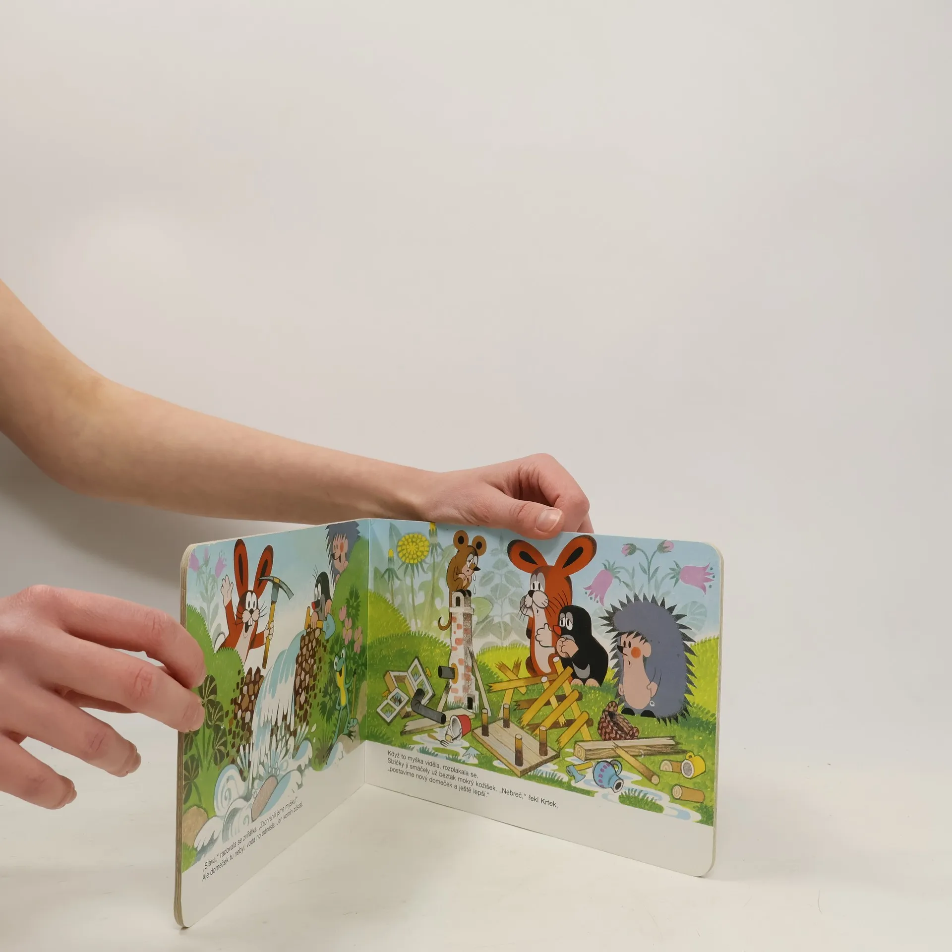 Leporelo pro děti s půvabnými ilustracemi Zdeňka Milera o krtkovi a jeho přátelích. Tento příběh vypráví o tom, jak krtek s ježkem a zajíčkem pomohli myšce přestát potopu, zachránili ji a ještě postavili nový domeček. Inu, kamarádi jak se patří.