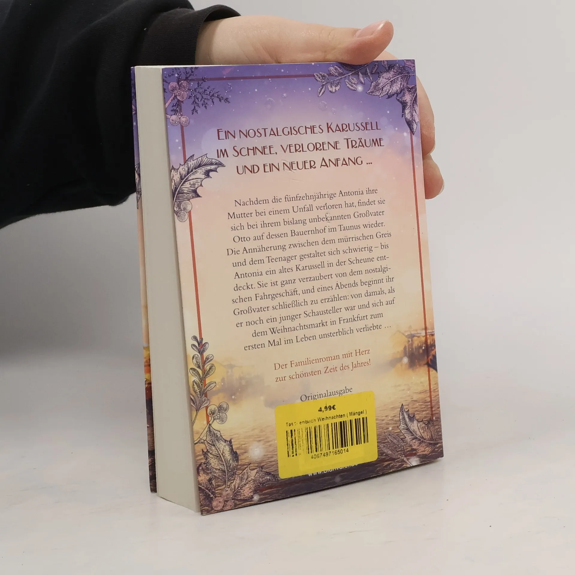 Ein nostalgisches Karussell im Schnee, verlorene Träume und ein neuer Anfang … Nachdem die fünfzehnjährige Antonia ihre Mutter bei einem Unfall verloren hat, findet sie sich bei ihrem bislang unbekannten Großvater Otto auf dessen Bauernhof im Taunus wieder. Die Annäherung zwischen dem mürrischen Greis und dem Teenager gestaltet sich schwierig – bis Antonia ein altes Karussell in der Scheune entdeckt. Sie ist ganz verzaubert von dem nostalgischen Fahrgeschäft, und eines Abends beginnt ihr Großvater schließlich zu erzählen: von damals, als er noch ein junger Schausteller war und sich auf dem Weihnachtsmarkt in Frankfurt zum ersten Mal im Leben unsterblich verliebte … Ein modernes Weihnachtsmärchen – perfekte Unterhaltung für kuschelige Winterabende!